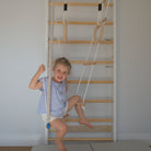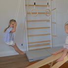 Simple fun that keeps bodies moving. The Wooden Swing/Trapeze clips to your Topsy Turvy Swedish Ladder to create a compact indoor jungle gym that builds grip strength, core stability, balance and confidence. It is a favourite Swedish Ladder accessory for screen-free play and pairs beautifully with gymnastics rings, rope ladder and slide to create a full indoor play equipment setup at home.