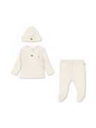 The perfect gift for new parents: A thoughtful maternity package with a soft wrap cardigan, footed pants, a baby hat, and a soft snuggle bunny. Made from 80% organic cotton and 20% recycled polyester.