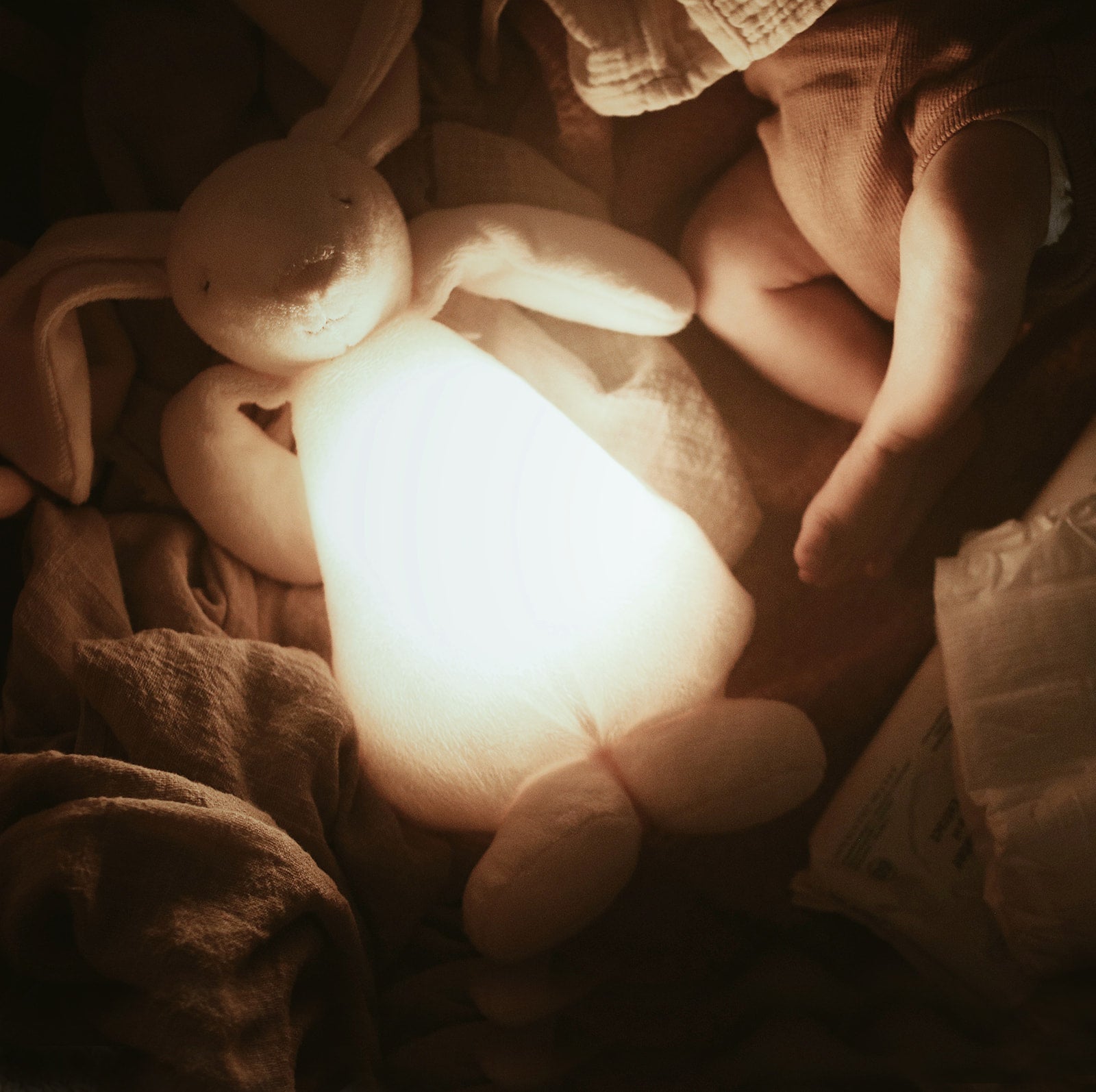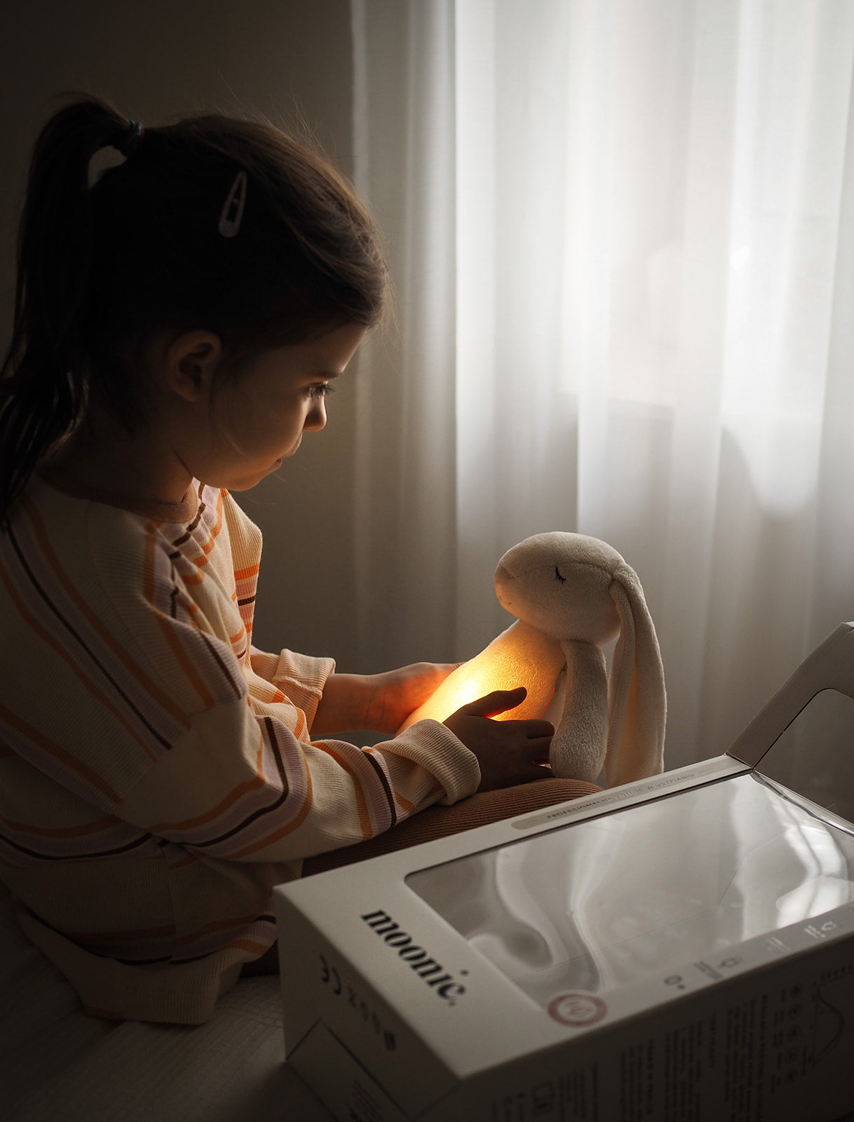 MOONIE the humming bunny is a professional baby sleep aid. Thanks to safe, natural pink noise, it allows children to calm down and fall asleep faster. And that's not all... MOONIE is also night lamp.