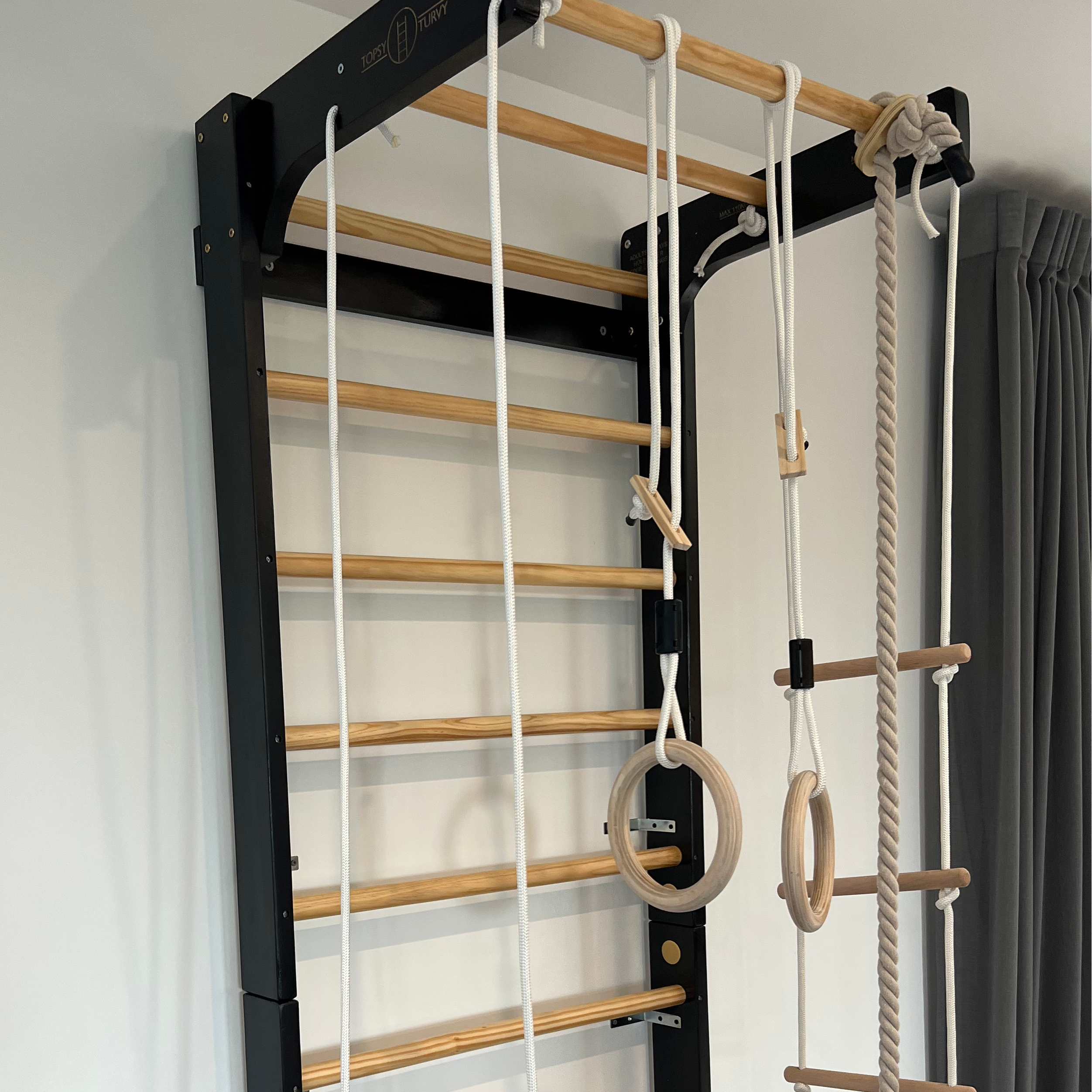 Wall-mounted to studs/nogs for a secure, space-smart footprint. If you’re not confident with DIY, we recommend professional installation. If you’re within ~1.5 hours of Hamilton, contact us to organise Topsy Turvy installation.