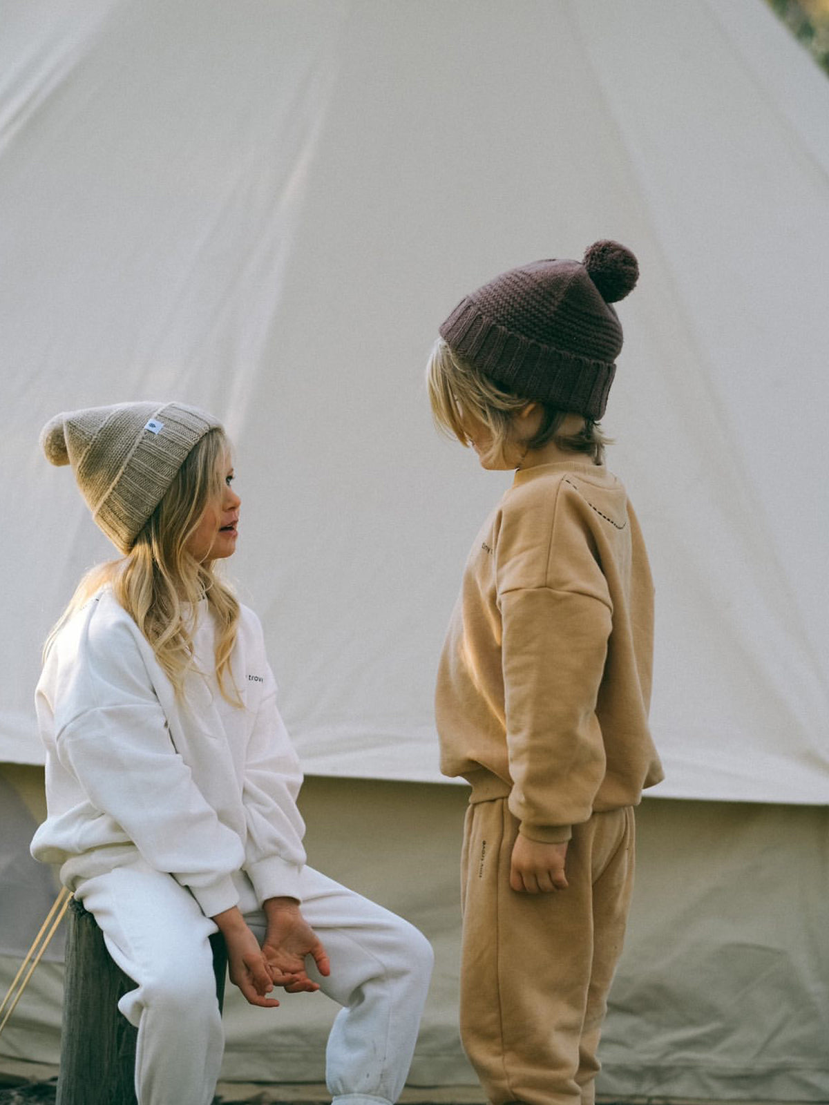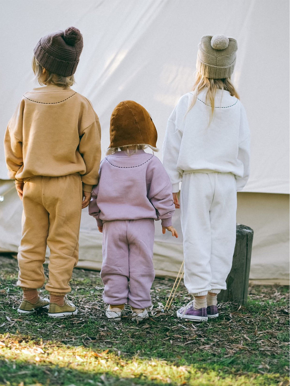 The cutest tracksuits for your little ones! Made from a soft cotton jersey that ensures comfortable wear all day long. There is a signature black logo detailing on both the sweater & pant and hand stitched detailing on the back of the sweater.