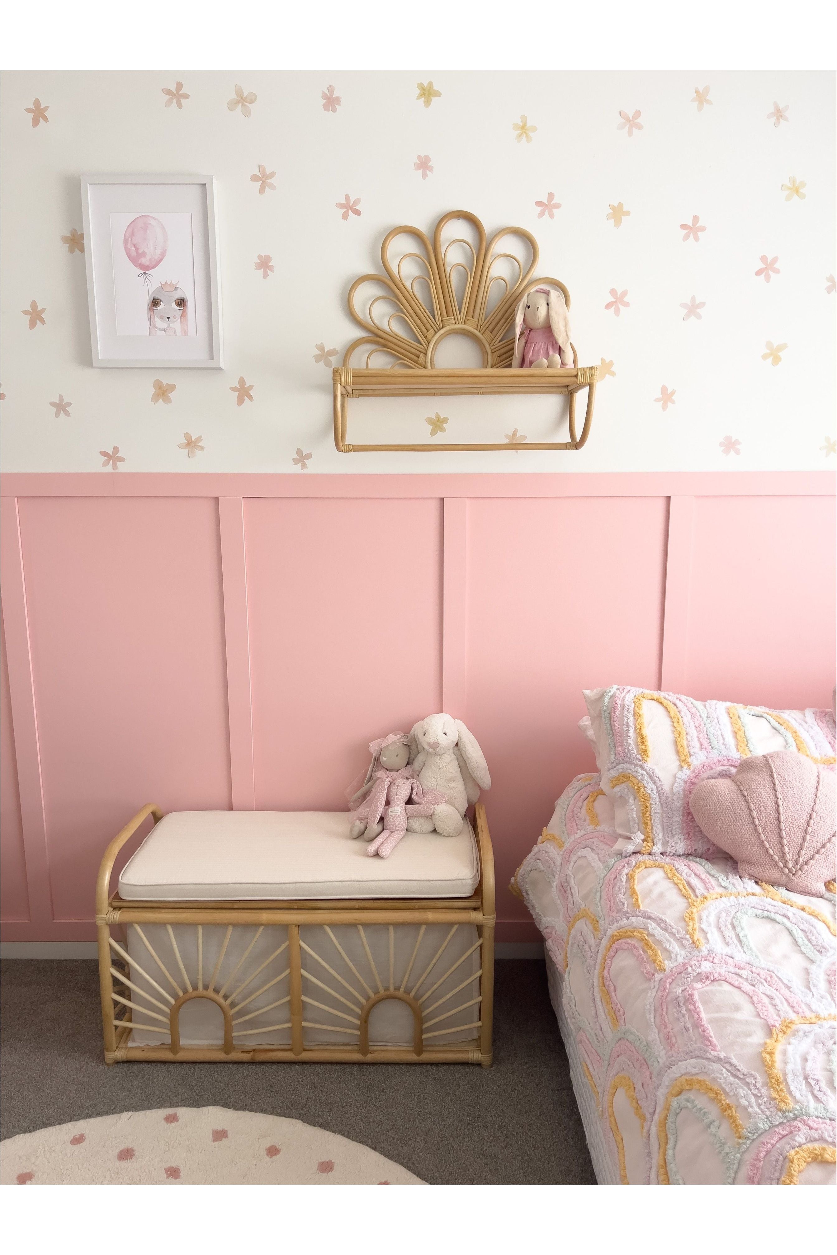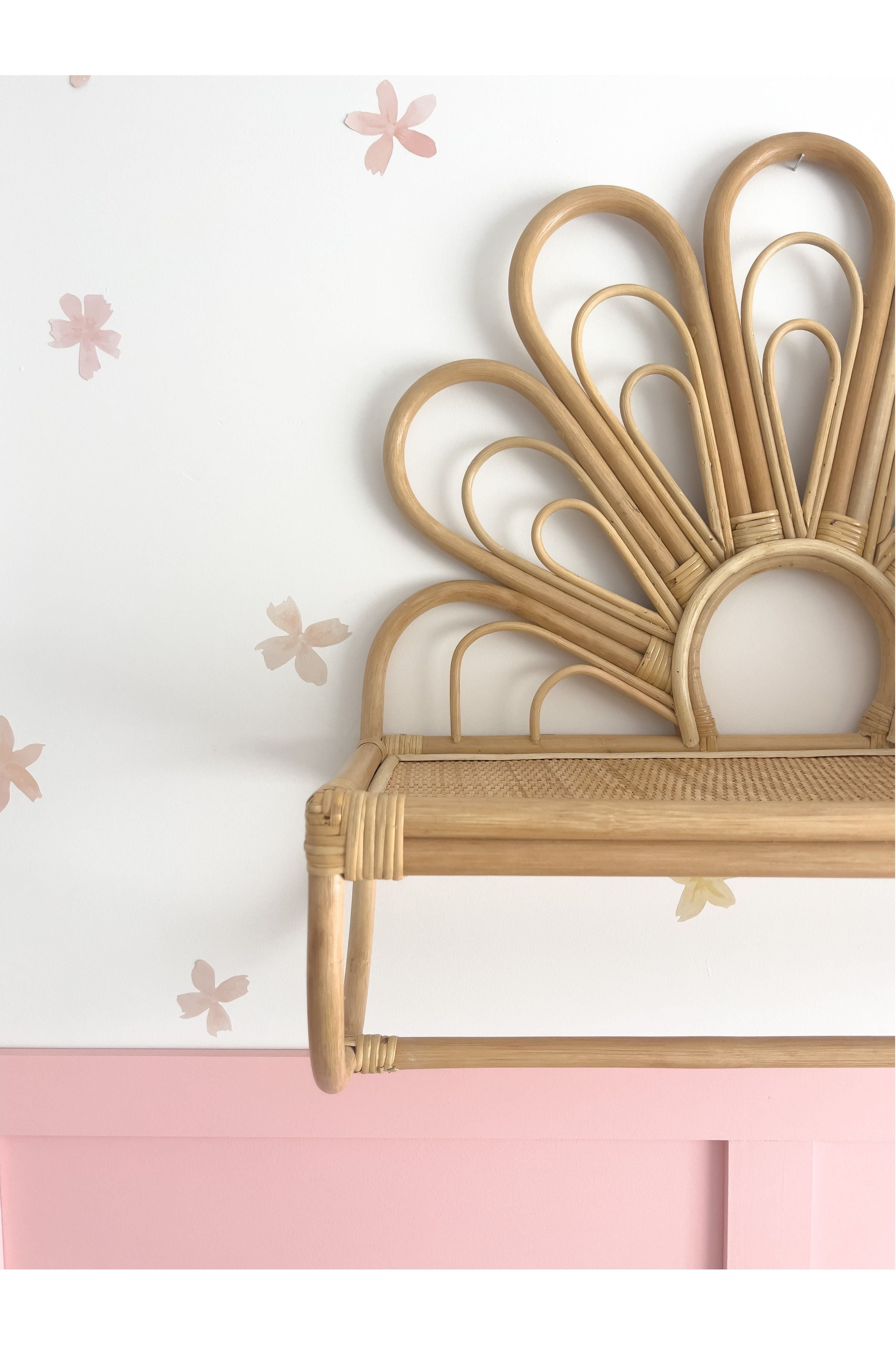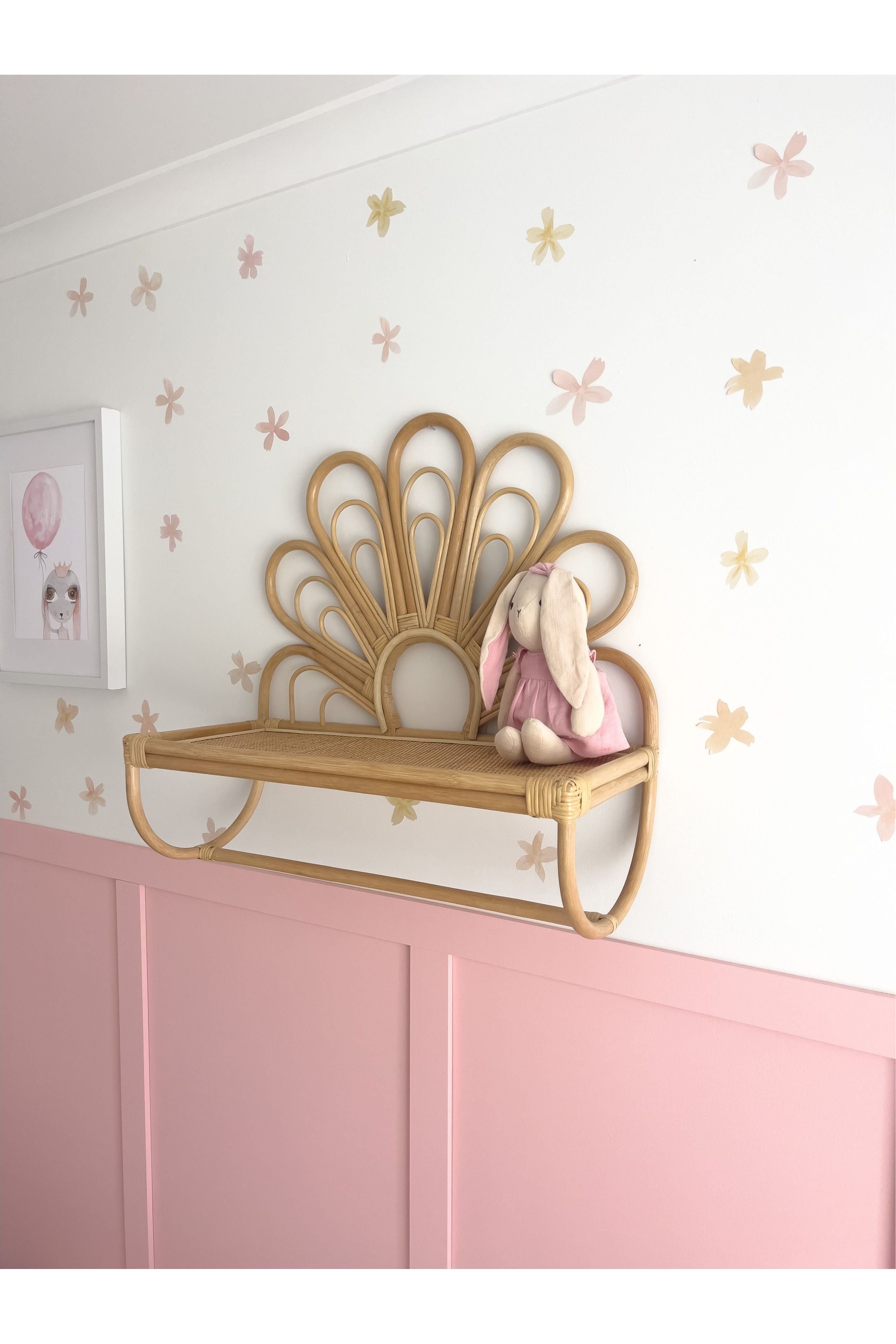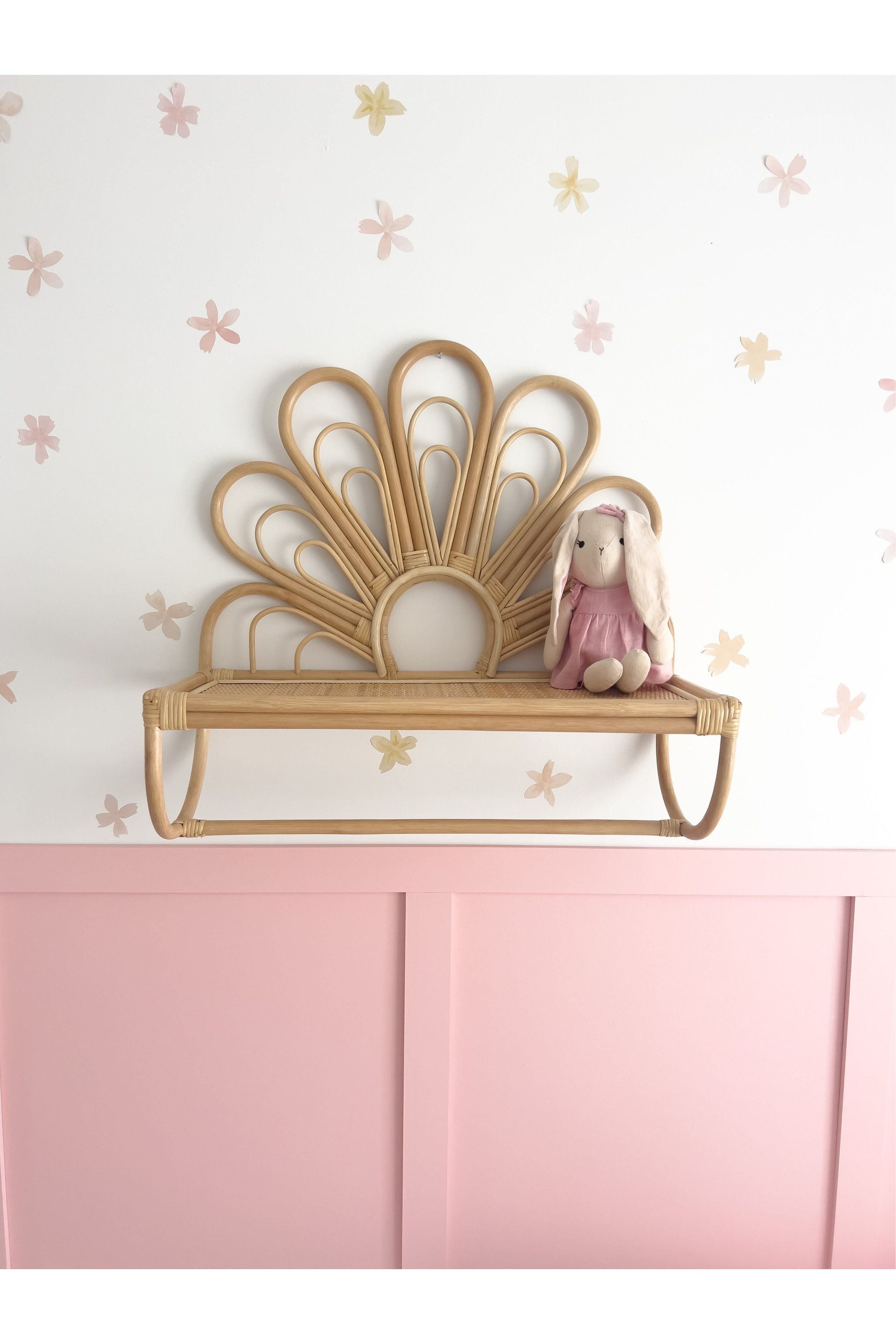 Our Daisy Shelf is the perfect way to add a touch of floral flair to your wall! This beautiful rattan shelf comes complete with a bar at the bottom, perfect for hanging any trinkets and treasures you have.