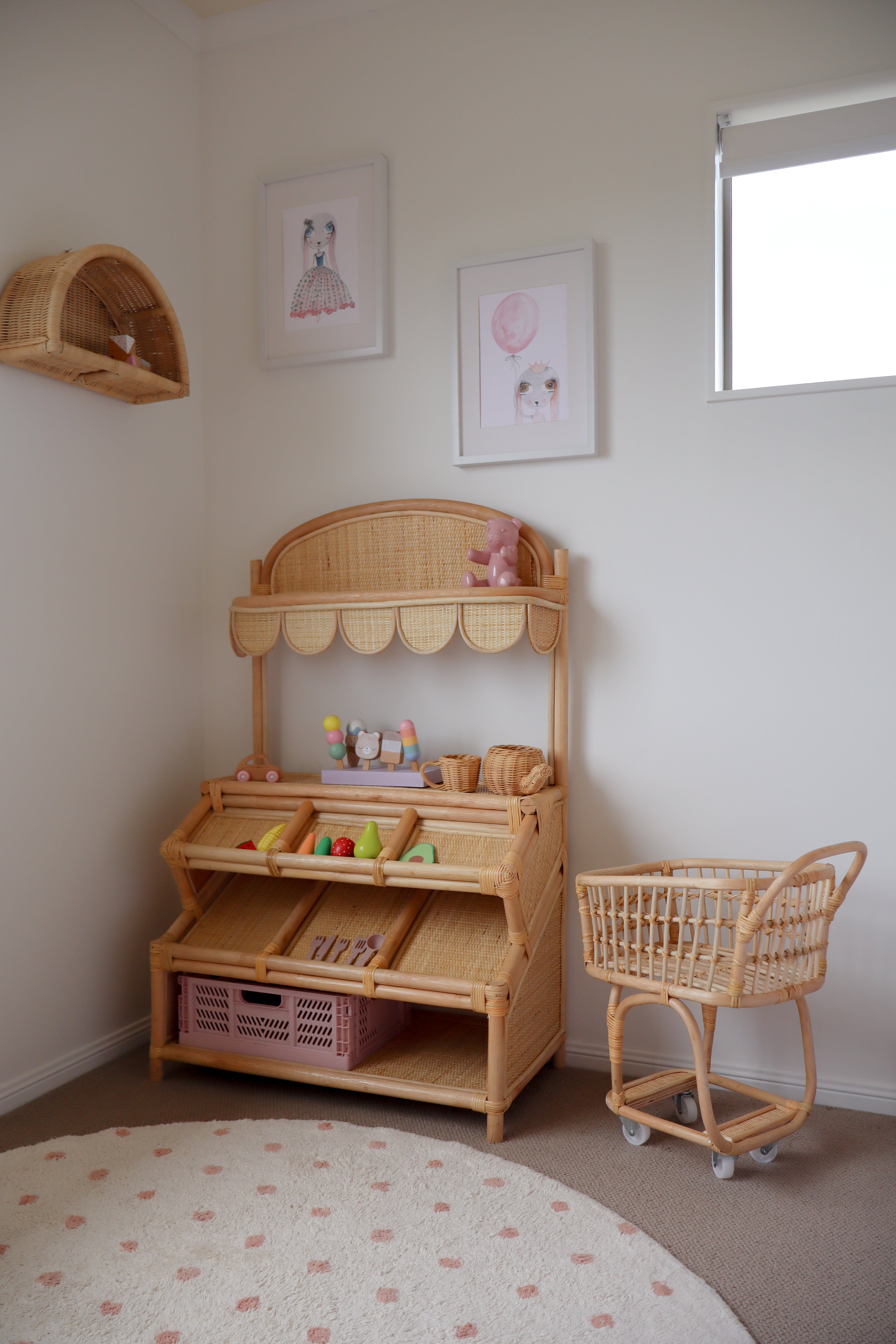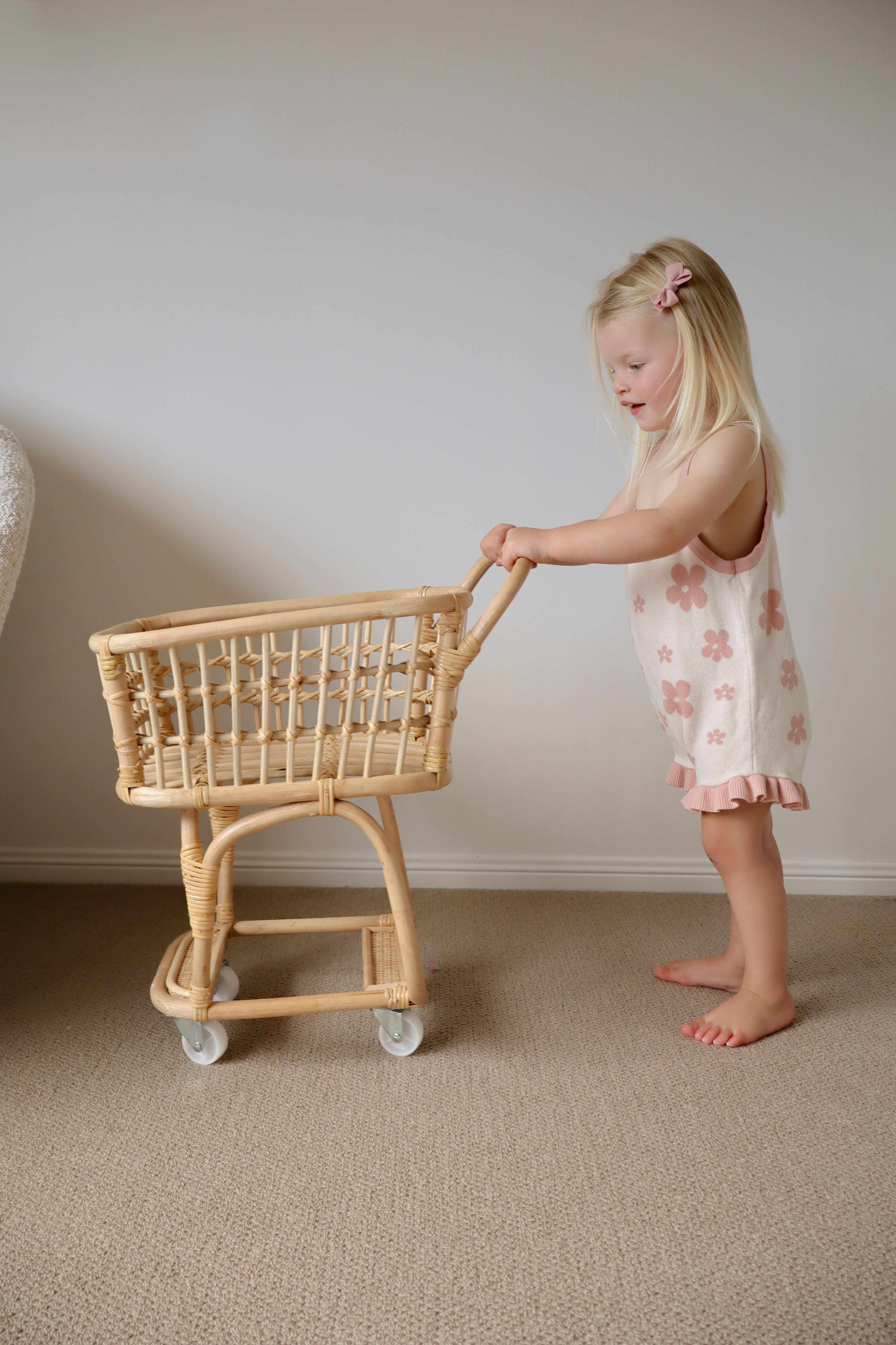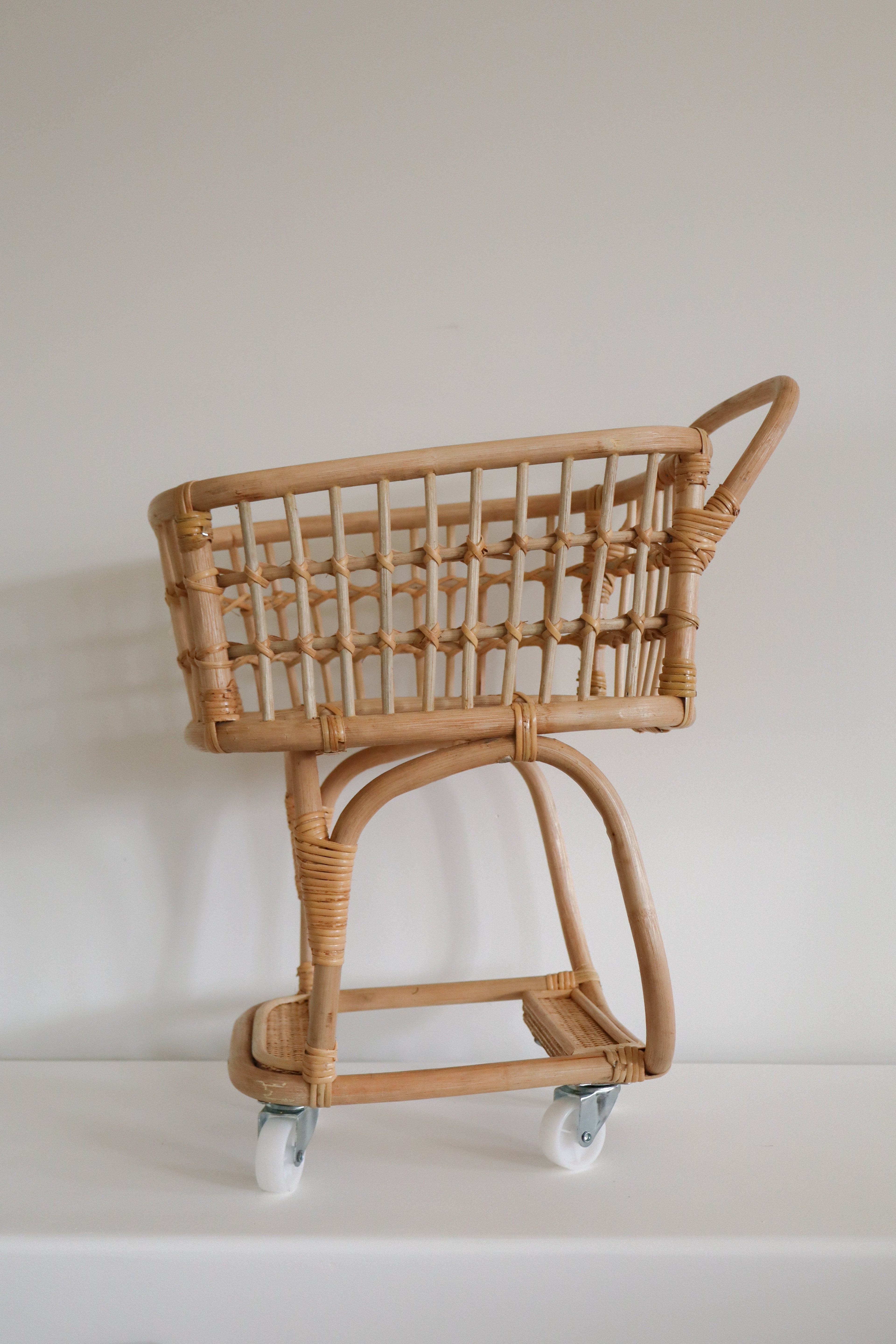 Get ready to shop in style with our Rattan Shopping Trolley! Made for kids, this trolley is perfect for little shoppers to carry their own items while also developing motor skills and independence.
