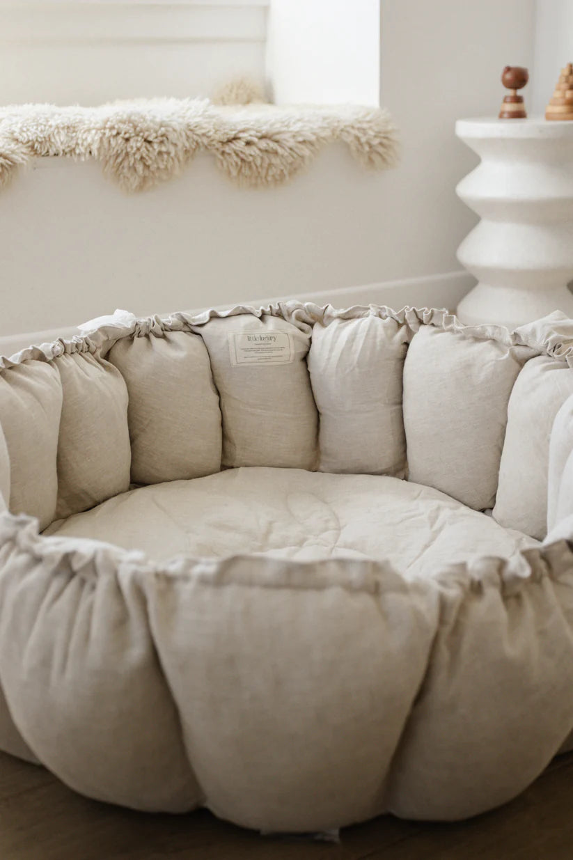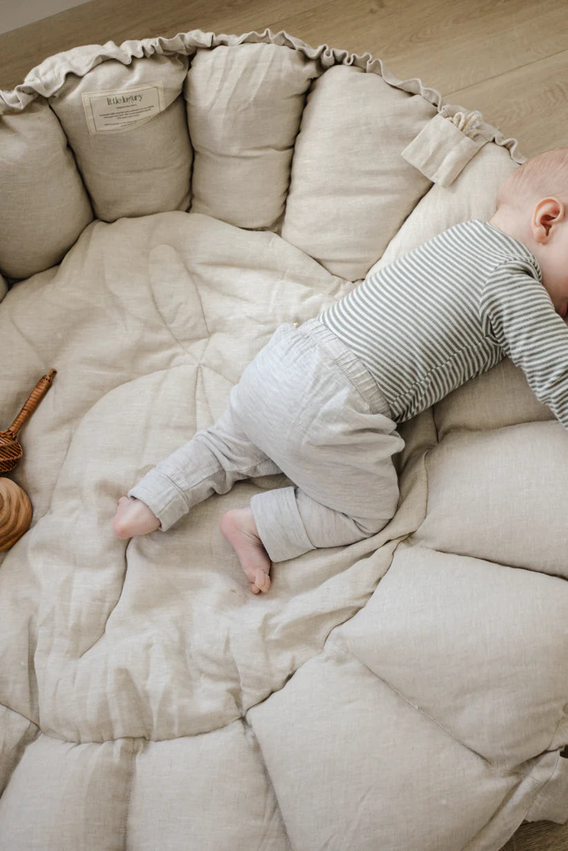 The Plush Organic Playmat delivers exceptional comfort and adaptability for your child’s playtime. Made from Certified Organic Linen, it offers a soft, breathable surface perfect for your little one’s activities. Thoughtfully designed, it easily converts into a playpen or ball pit, suitable from newborns to toddlers and beyond. Featuring a hypoallergenic linen cover that softens naturally, a plush recycled cotton filling, and a waterproof, non-slip base, it ensures safety and durability. With a generous 120cm diameter and machine washable fabric, it’s easy to care for. Includes an embroidered dust bag for convenient storage or travel. Designed in New Zealand with sustainable materials, it creates a cozy, nurturing space for your baby’s growth and exploration.
