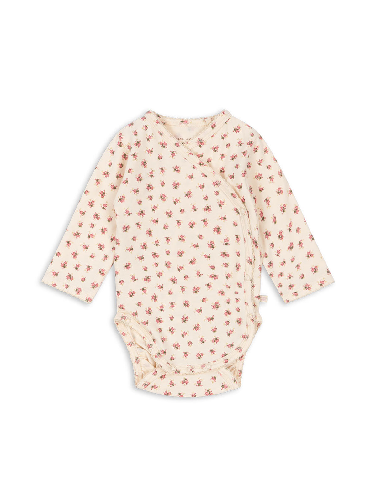 Soft long-sleeved wrap body for newborns. Made in 95% organic cotton and 5% elastane with a hint of stretch. Features snap buttons along the sides and crotch that make it easy to dress your baby.