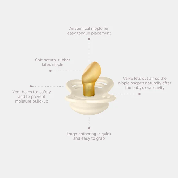 Natural Rubber latex is a natural material made from a sticky milky fluid tapped from the Hevea tree. The fluid is refined a super soft, elastic, and resilient material very much resembling the mothers soft nipple. The natural material is affected by natural influences like UV light, air, saliva, and heat. The elasticity of the material allows the nipple to change shape and size because of the babys strong vacuum, this means that the nipple in some cases can expand if it is not replaced in time. Natural rubber latex pacifiers should be scalded rather than boiled and replaced every 4-6 weeks for safety and hygienic reasons. Since latex is a natural material colour and clearness may vary.