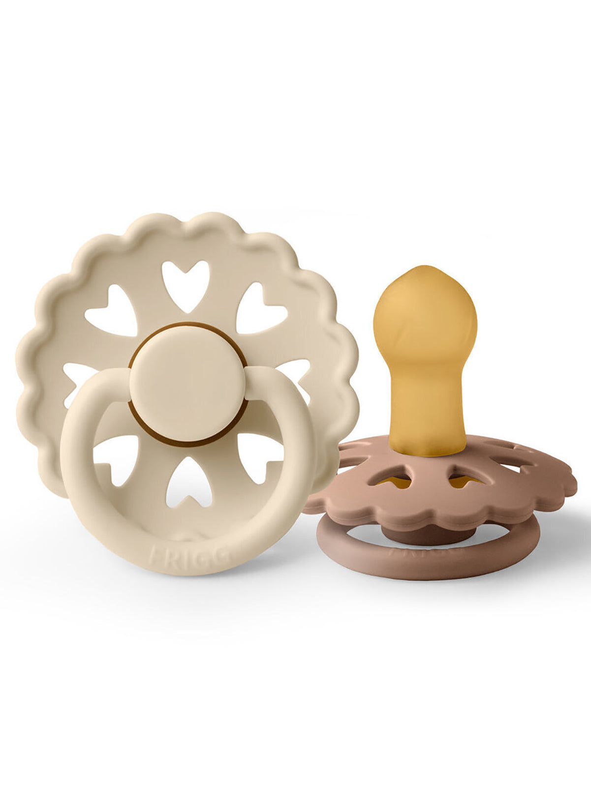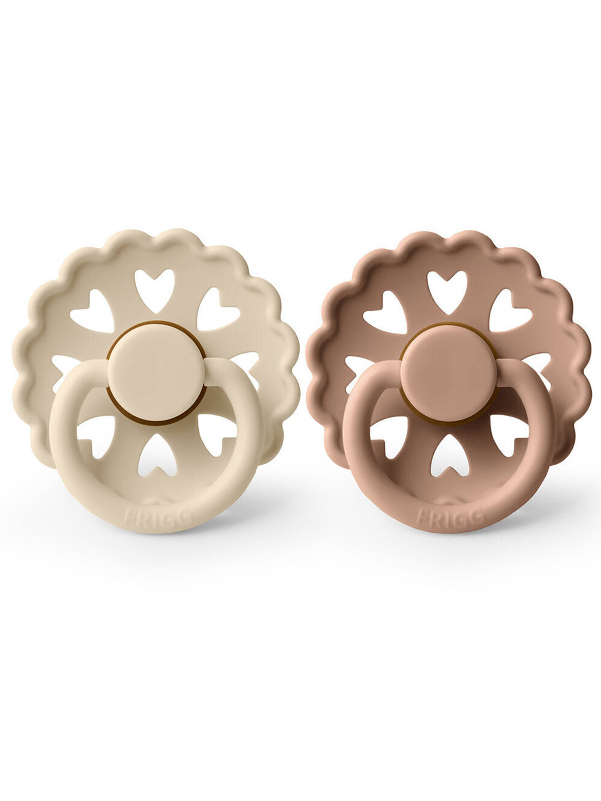 The pacifier with scalloped edges and hearts surrounding the shield mimic one specific paper cutting by H. C. Andersen. The 8 little hearts support the universality of his creative work, and they symbolize love, the universal language of the world. This is the inspiration that lies within the FRIGG Fairytale pacifiers: They are approachable for everyone because love is a language, everyone can speak and understand.