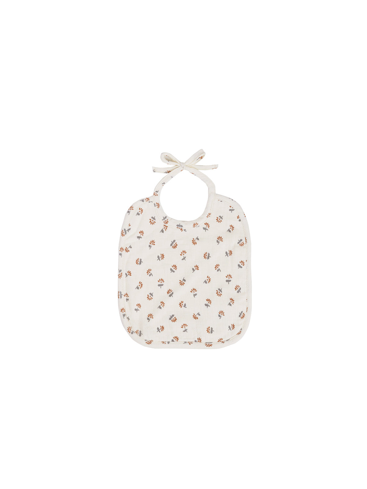 Woven gauze bib with terry backing, ties at the neck for a secure fit.