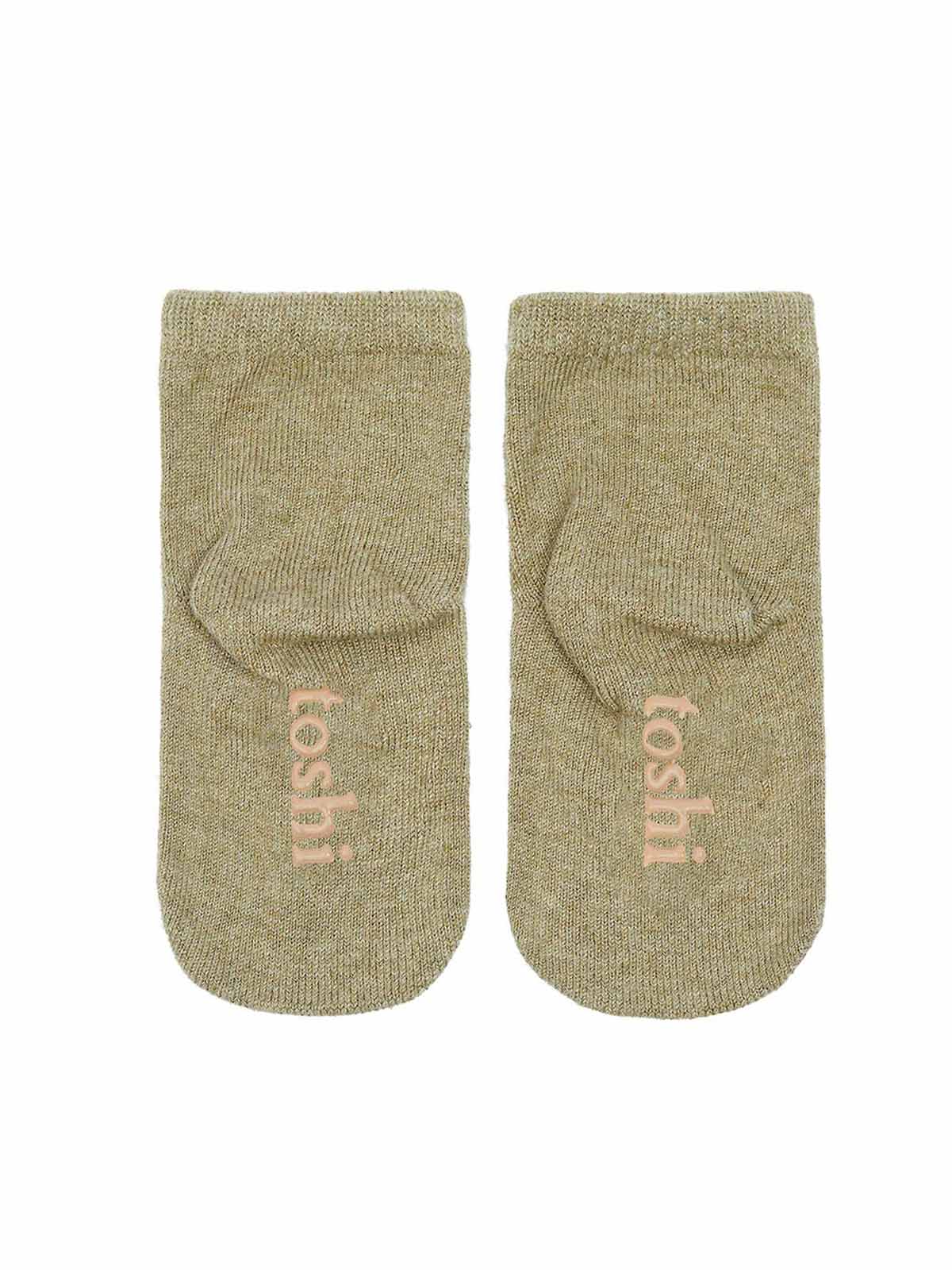 The Toshi sock toe is hand linked, a quality crafting technique that enhances comfort for baby feet. Baby safety is supported with a skid resistant sole grip for sizes 6-12 months & 1-2 years.