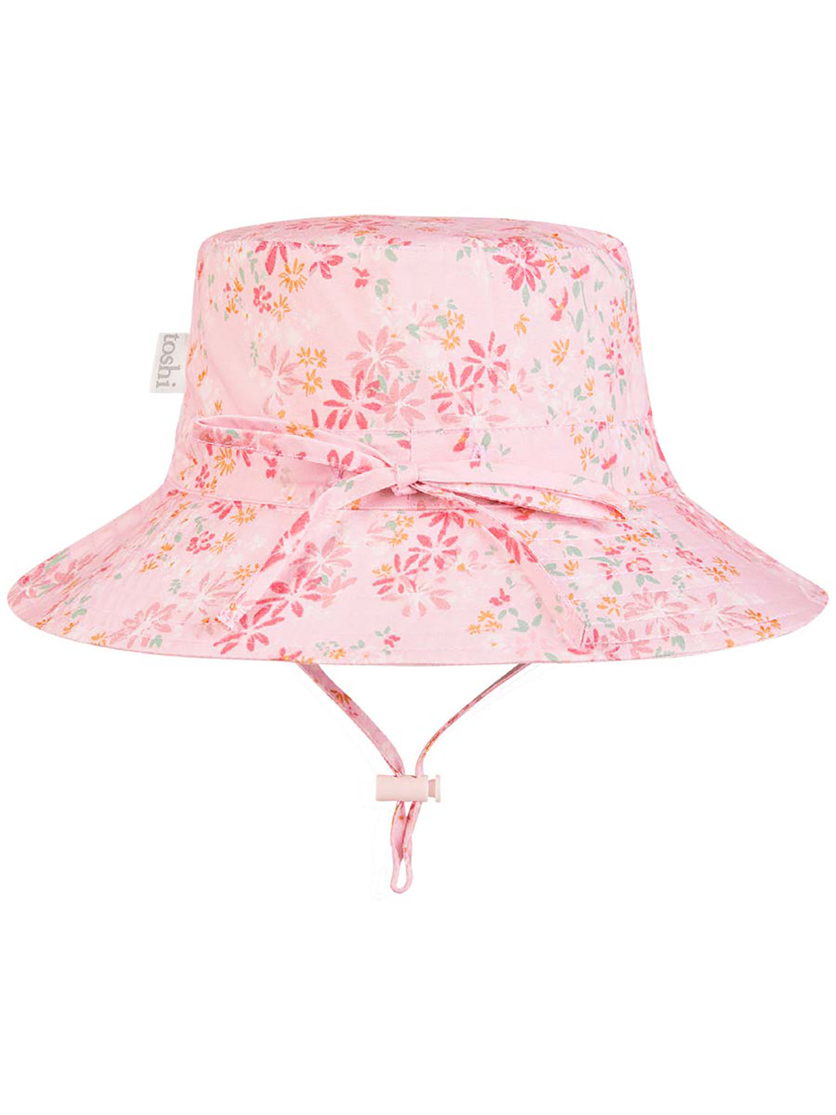 Toshi presents the classic Sunhat, ideal for children of all ages. The broad and well-structured brim offers increased sun protection. A head tie creates adjustable sizing and the chin tie with toggle secures the hat for ease of wear. The security release clasp on the chin tie is designed to enhance wearer safety.