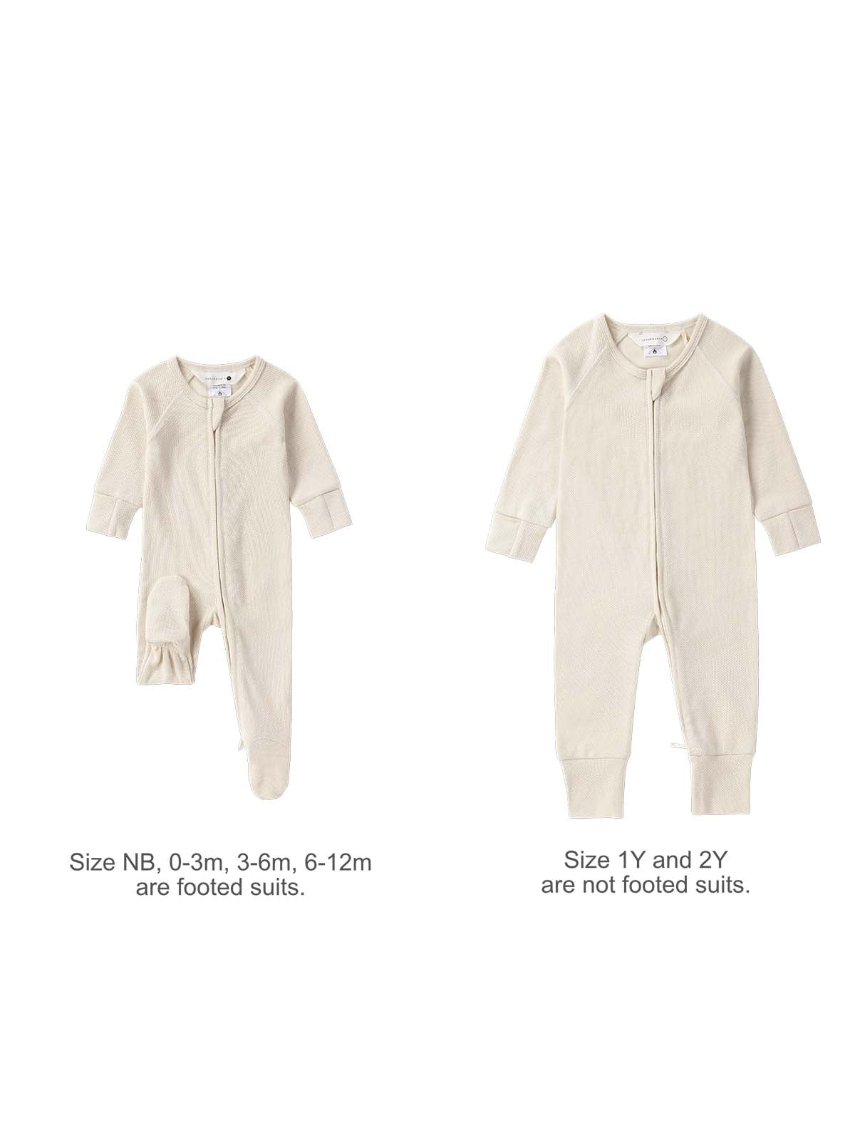 Size NB, 0-3m, and 3-6m are a footed suit with a tiny rubber grip dots on the bottom sole. Size 1y and 2y are not footed. Please see product images for more details.