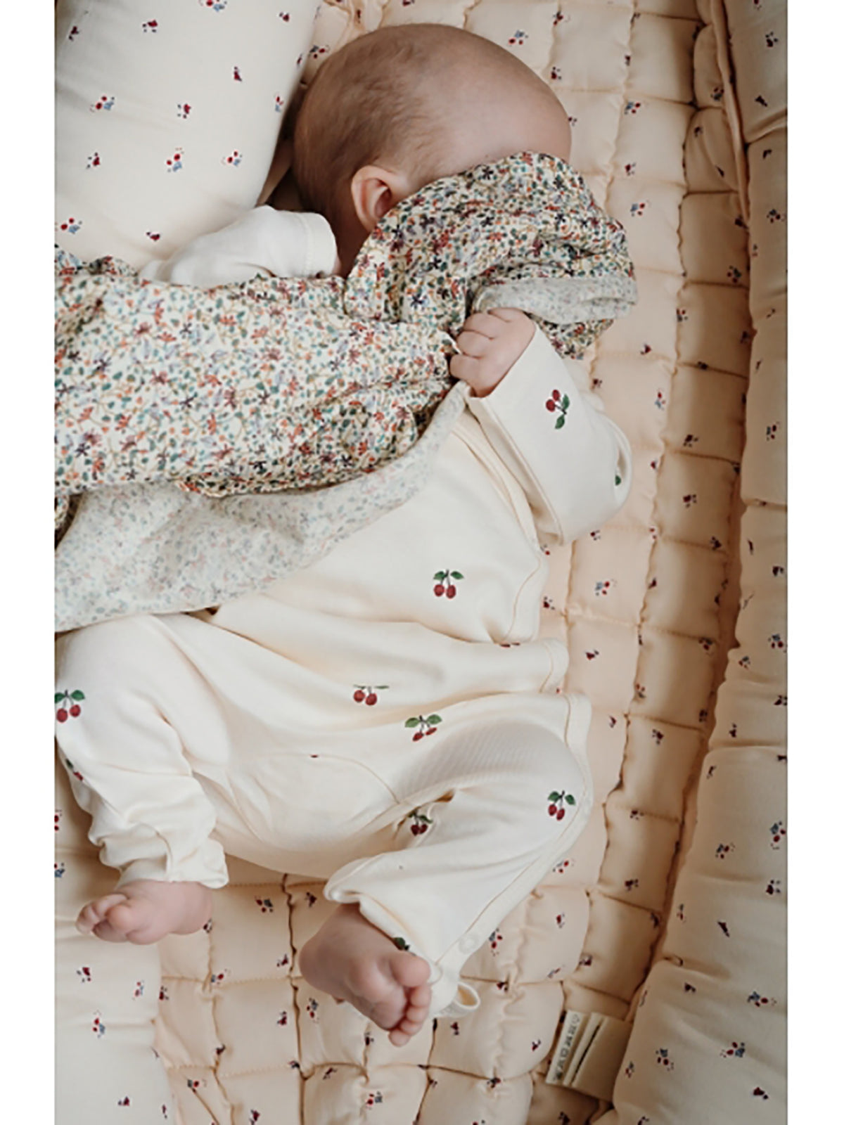 Soft onesie made in 95 percent organic cotton and 5 percent elastane, with a hint of stretch. Snap buttons along the sides make it easy to wrap the garment around the baby.