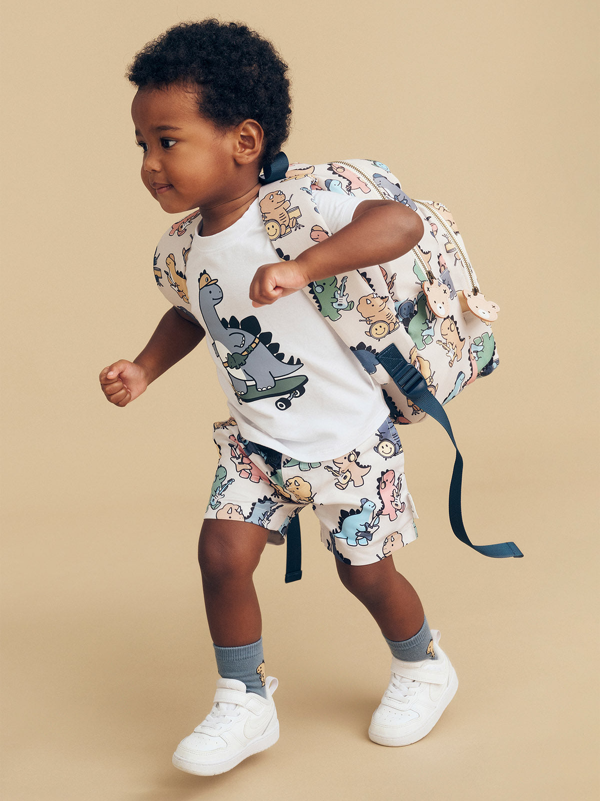 Swim shorts with all over dino band print, side pockets and adjustable drawstring