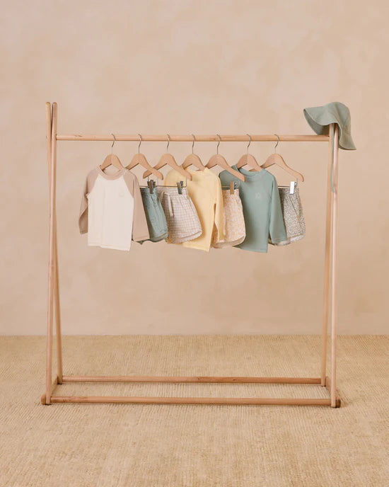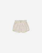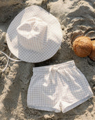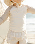 These comfortable boardshorts come with an elastic waistband and adjustable drawstring, making them ideal for days at the pool or beach. They offer UPF 50+ sun protection and showcase a cozy ‘oat check’ pattern on a soft ivory background.