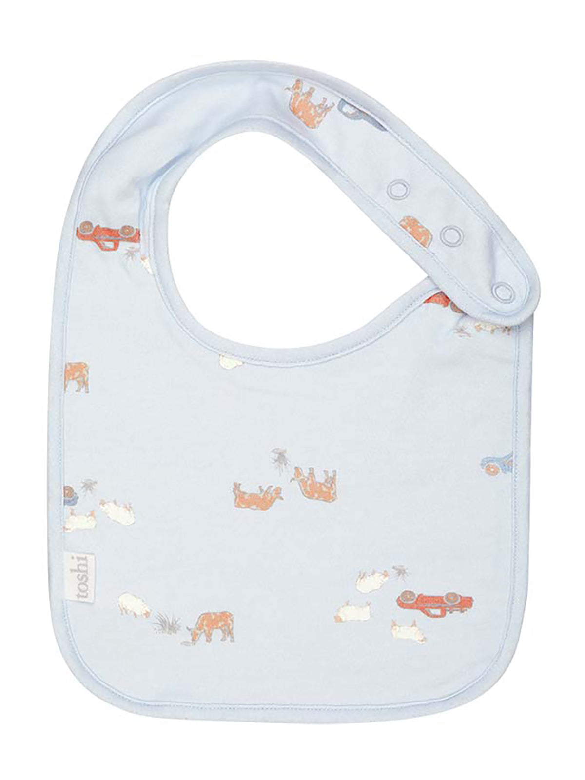 The Toshi Baby Bib Story offers two complimentary bibs of the finest quality 100% cotton knit. An original and exclusive Toshi design is featured. Presented harmoniously with this is the Dreamtime certified 100% organic cotton bib. The bibs have absorbent cotton padding on the reverse for moisture protection. Conveniently located press studs create adjustable sizing.