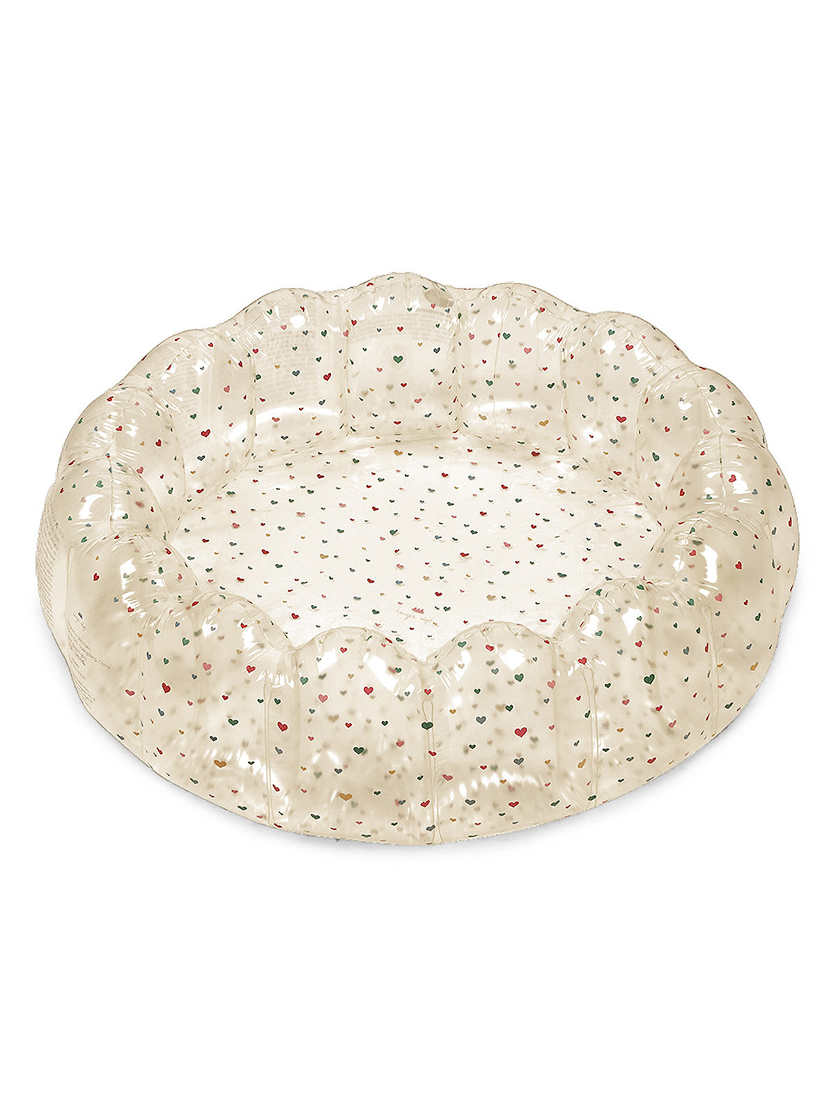 Small transparent inflatable pool made from durable PVC. Designed with scallop endings.