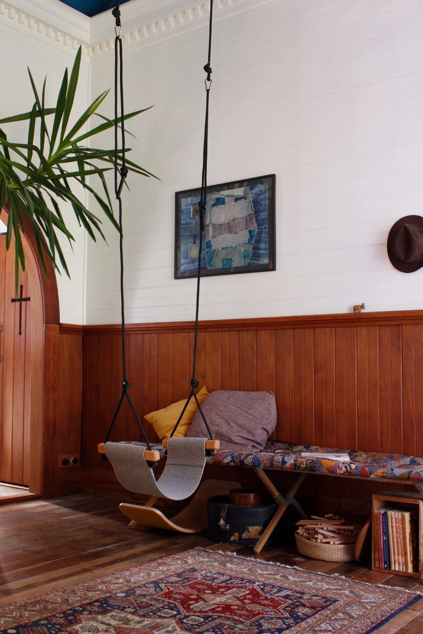The SOLVEJ Loft swing is a cozy, secure swing for ages 3 to adulthood, made from soft, hypoallergenic wool felt. Great for developing coordination in kids, it’s designed for indoor use and built to last for generations. Crafted in New Zealand, its timeless, natural style reflects a slow design philosophy—perfect to enjoy and pass down.