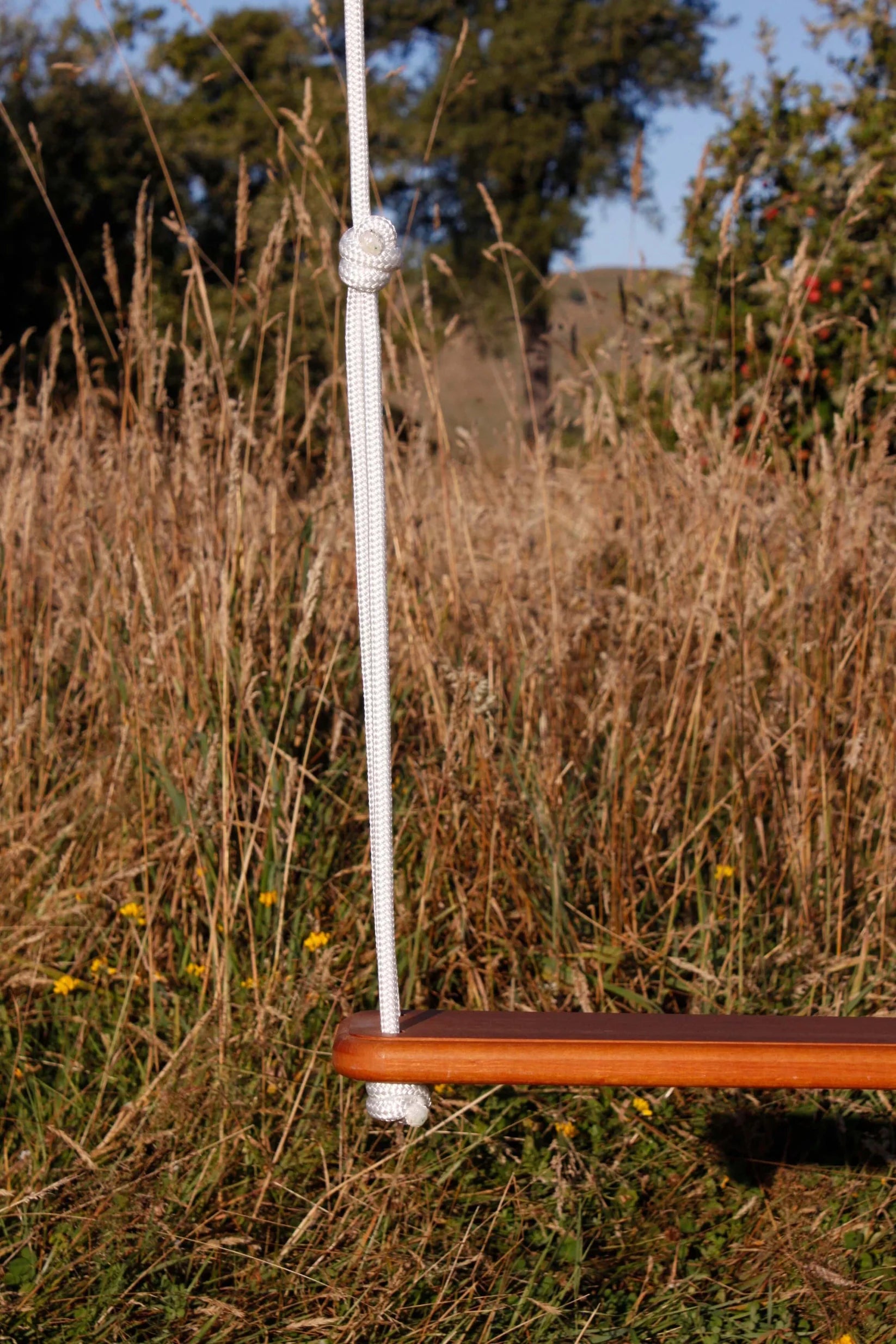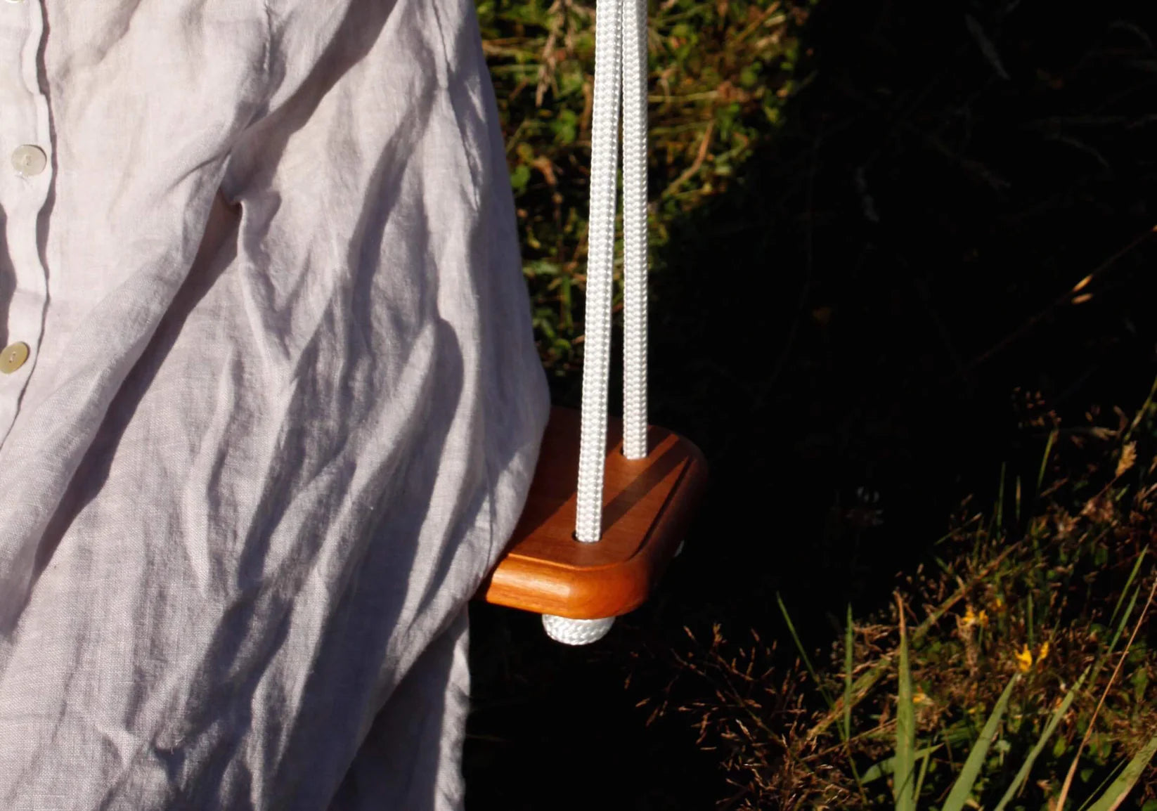 We use an extremely strong 10 mm high performance yachting braid. Stainless steel carbine hooks (eye-bolts not provided) make it very safe and easy to move the swing.