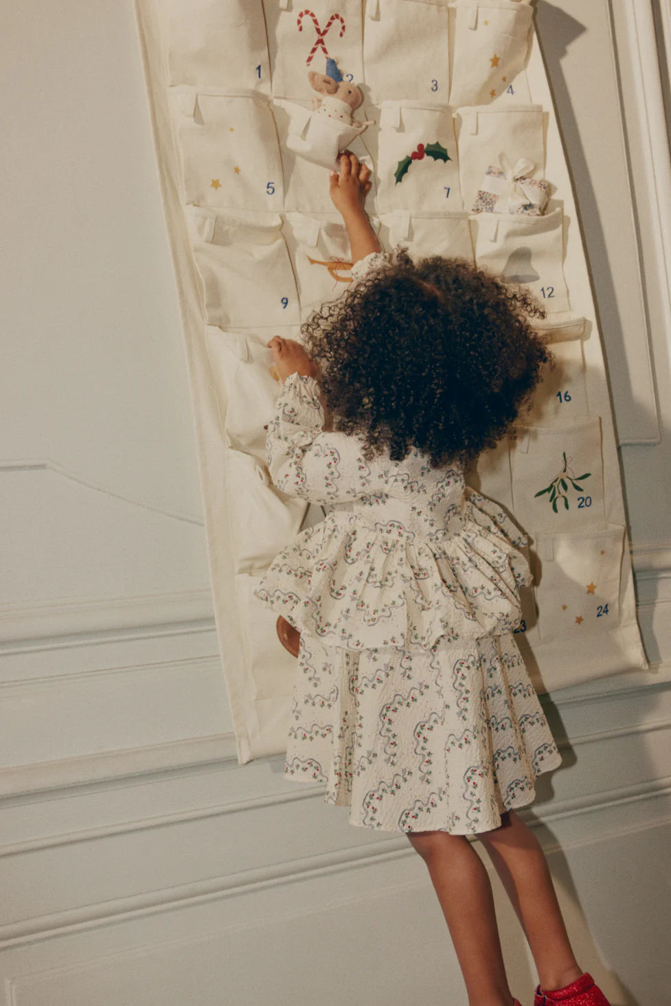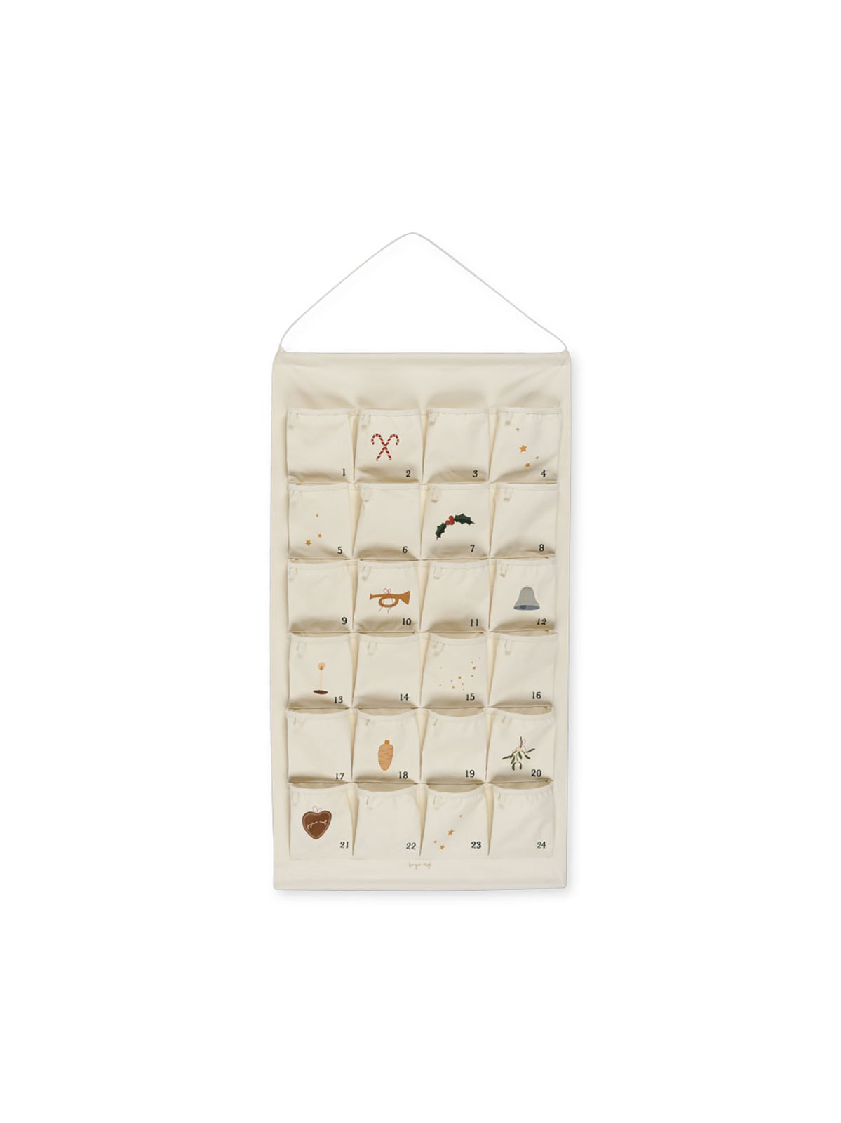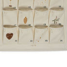 Christmas calendar with holiday prints and 24 pockets to hide little presents in. Features a practical rope at the top of the chart to hang it with.