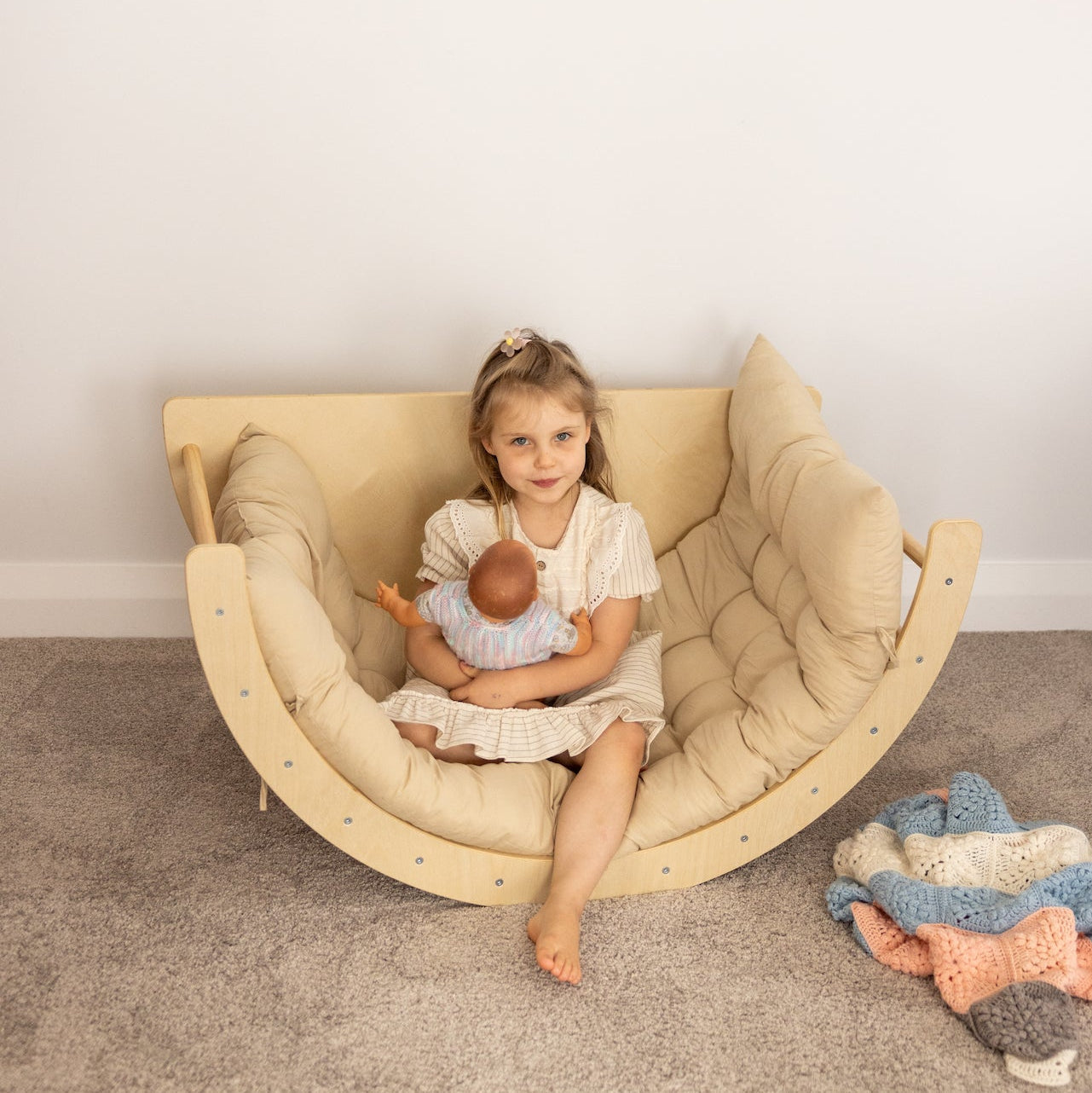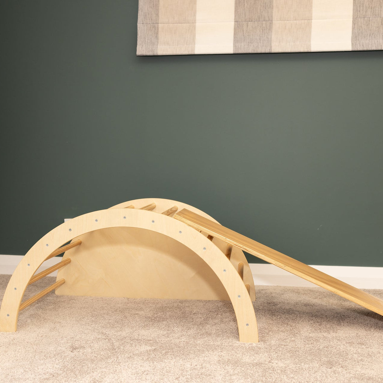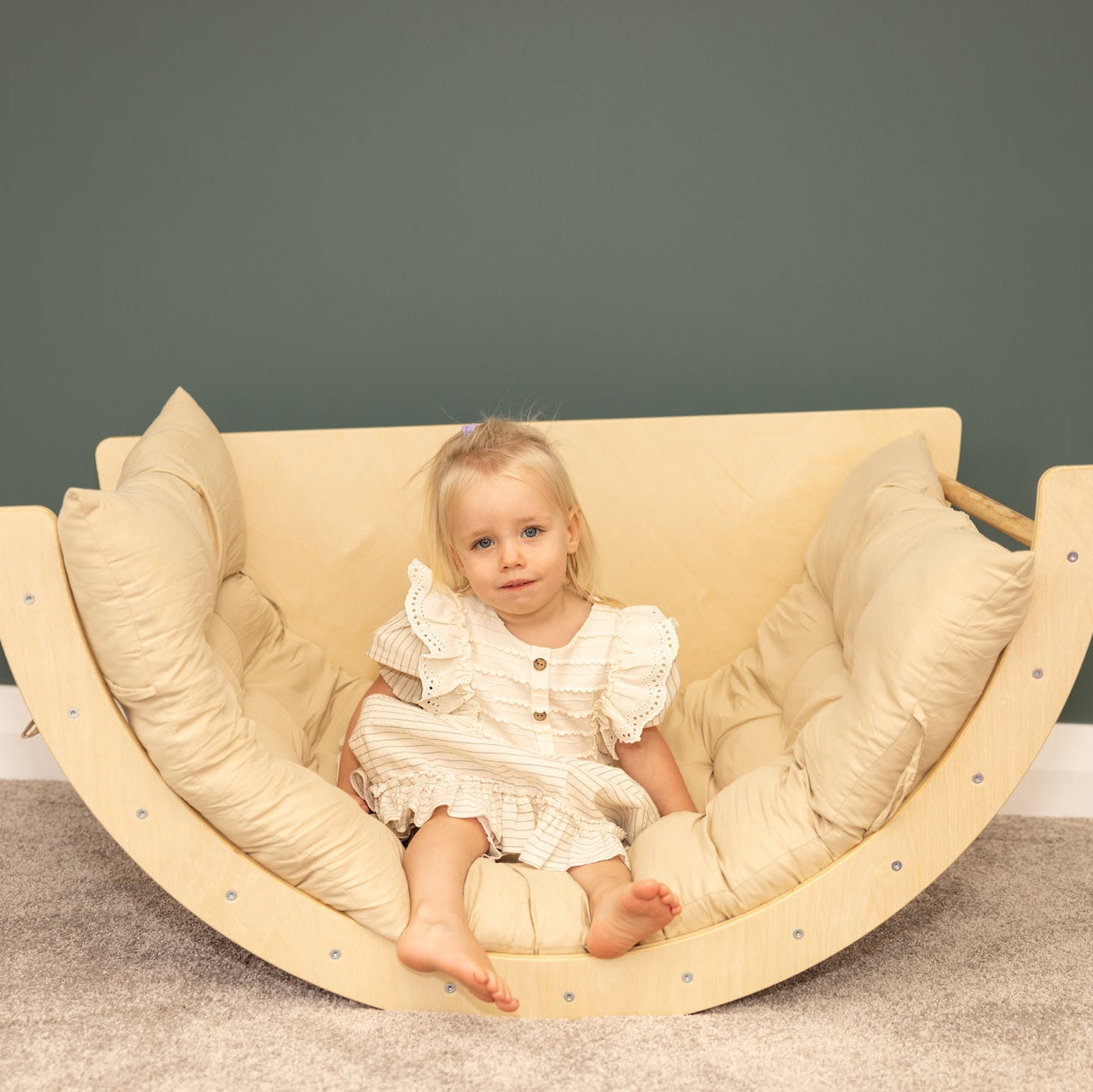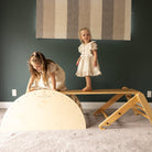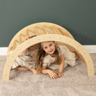 Create a beautiful indoor play setup with our Multi-use Climbing Arch + cushion. From a cosy, supervised baby gym in the early months to a sturdy climbing arch for bigger kids, this versatile Montessori piece invites rocking and climbing that build core and upper-body strength, balance, agility and coordination. It is ideal indoor play equipment for screen-free, open-ended play that grows with your child.