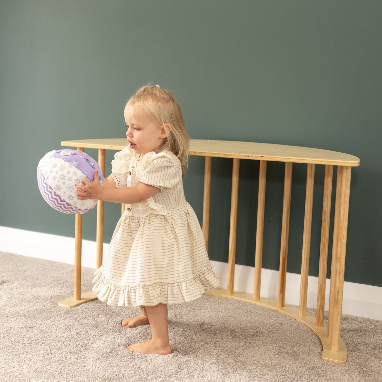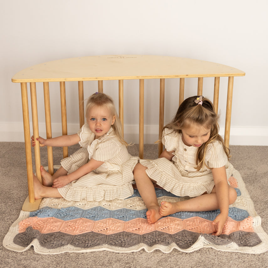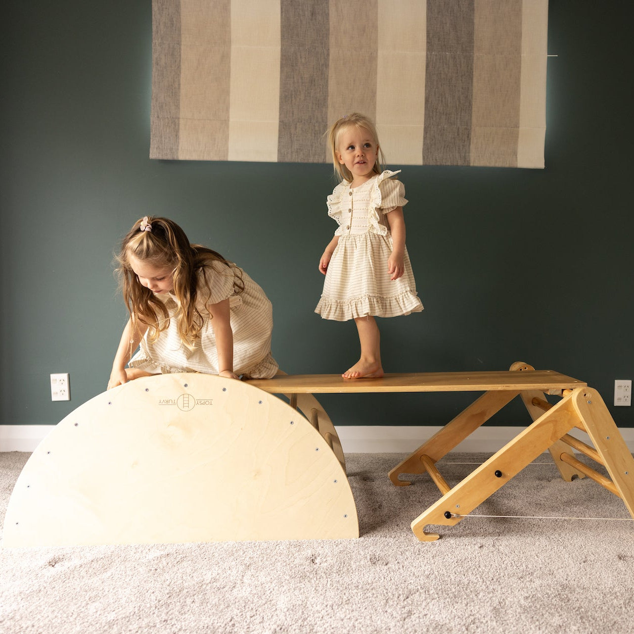 Create a beautiful indoor play setup with our Multi-use Climbing Arch + cushion. From a cosy, supervised baby gym in the early months to a sturdy climbing arch for bigger kids, this versatile Montessori piece invites rocking and climbing that build core and upper-body strength, balance, agility and coordination. It is ideal indoor play equipment for screen-free, open-ended play that grows with your child.