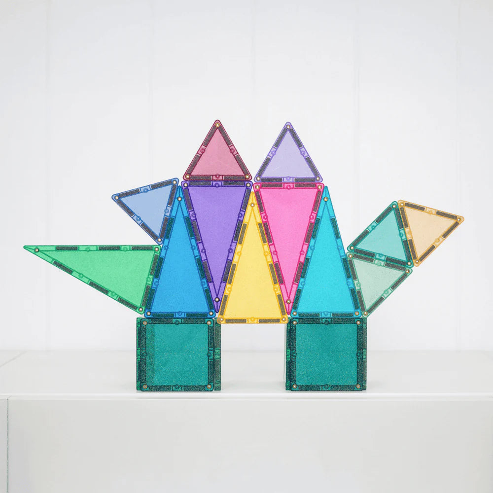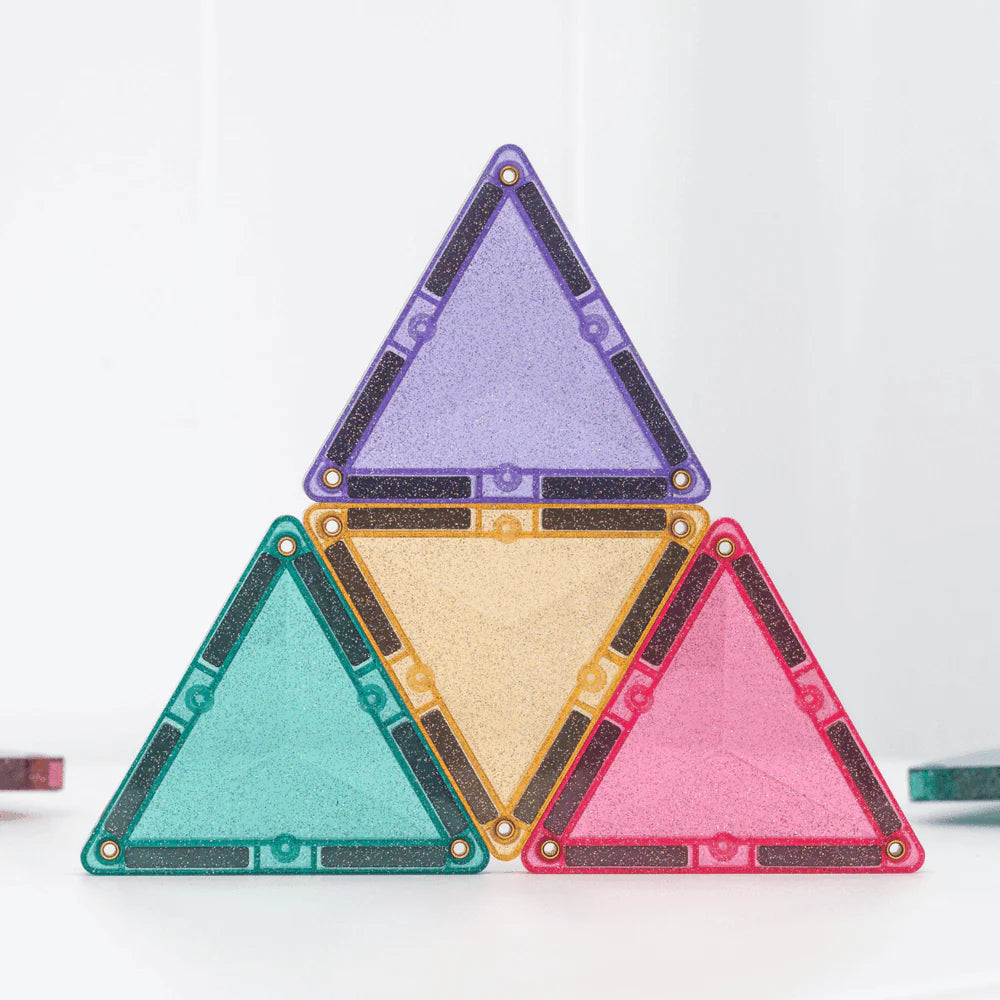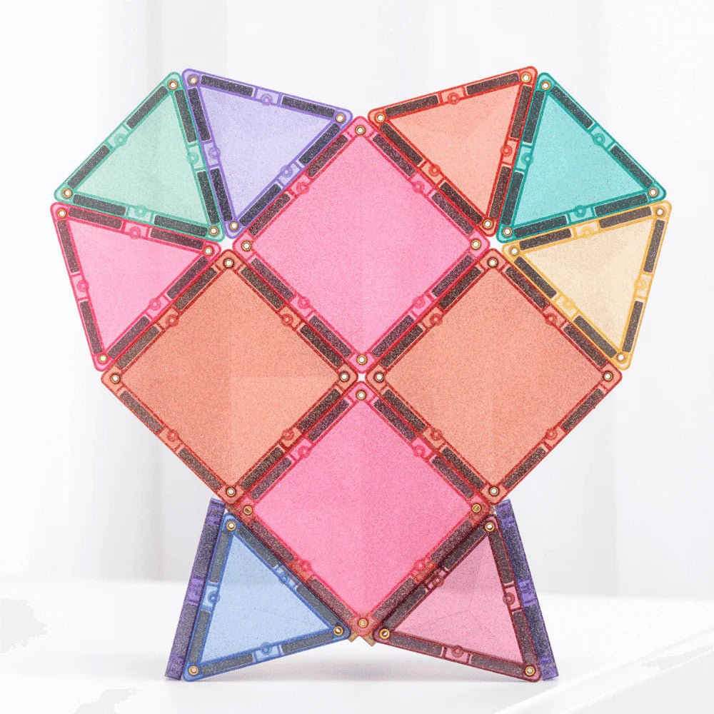 Designed for big imaginations and fairytale explorers, our stunning glitter tiles in signature pastel and vibrant rainbow colours add a touch of magic to every build. Featuring squares, plus a mix of isosceles and equilateral triangles all bursting with multi-coloured sparkles, this open-ended pack is perfect for building shimmering castles, towers, bridges, animals and so much more!