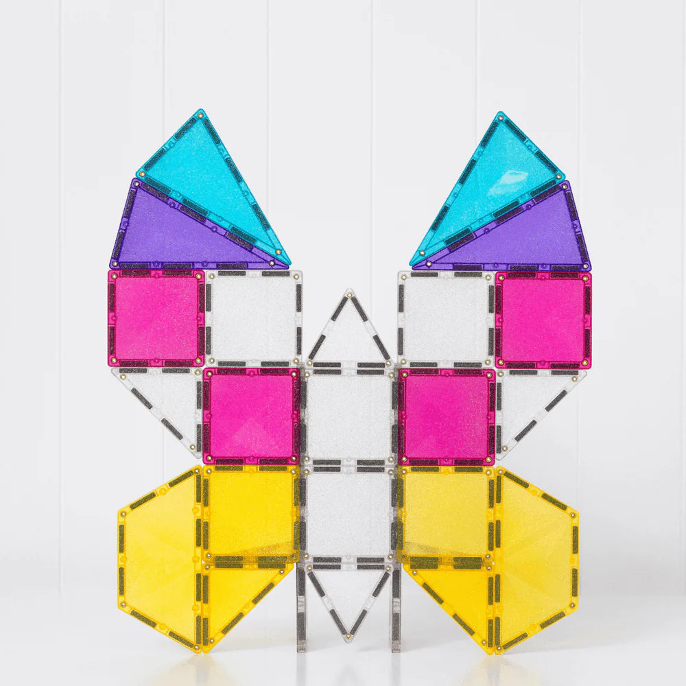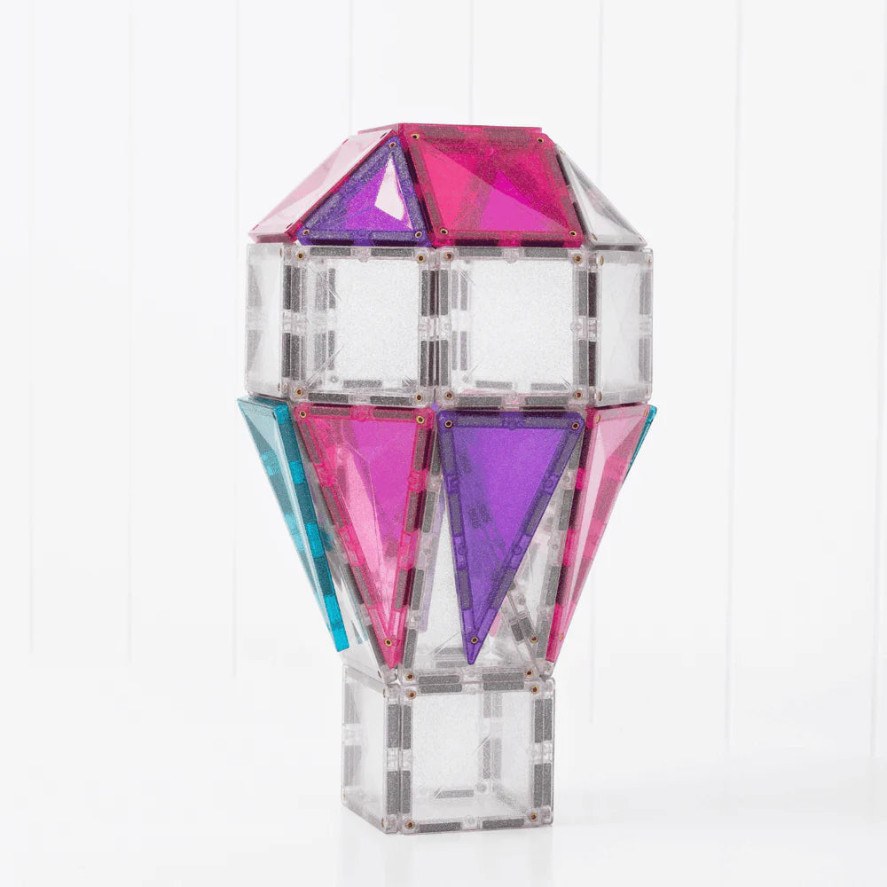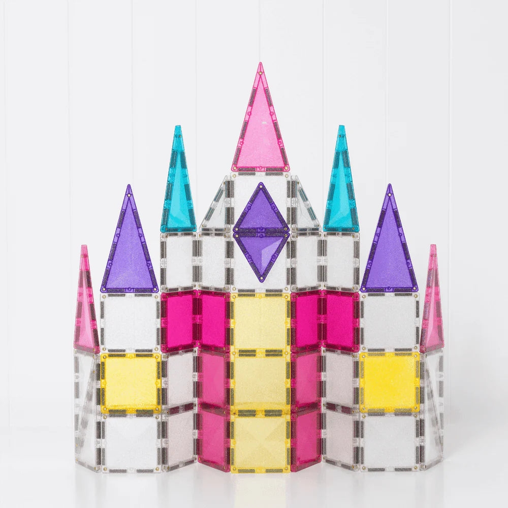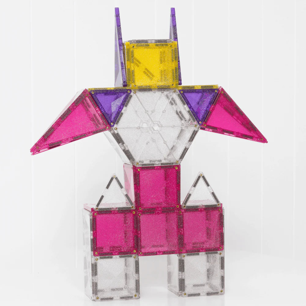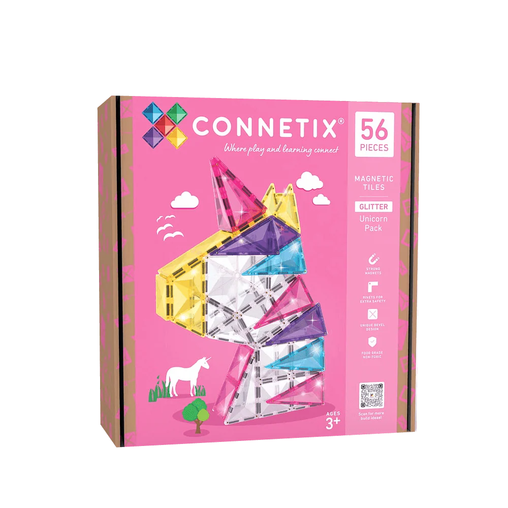 Designed for the unicorn lovers, fantasy dreamers and creative explorers, this pack is filled with delightful play possibilities. Featuring a stunning combination of glitter magnetic tiles in dazzling clear and bright rainbow colours of pink, yellow, teal and purple, plus a thoughtful selection of shapes in squares, hexagons, rectangles, triangles and trapezoids to bring your sparkly unicorn creation to life!