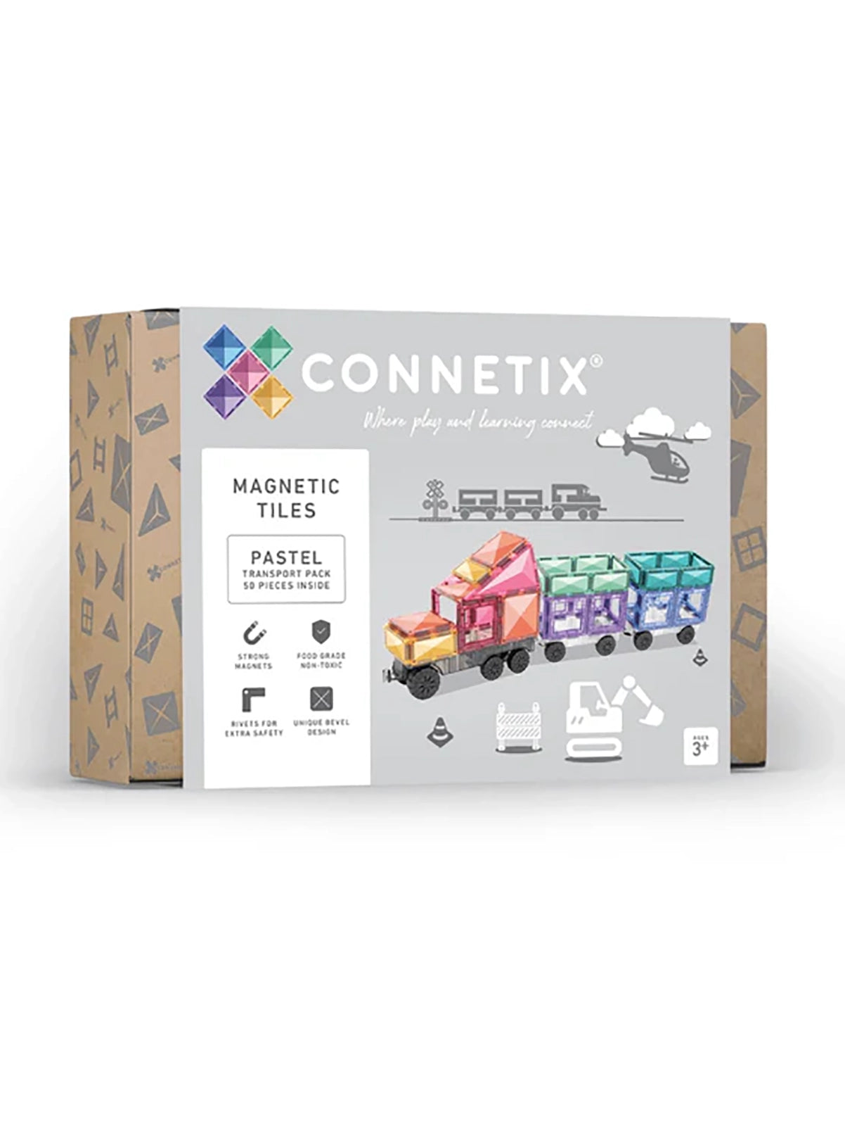 Featuring our iconic REVERSIBLE transport base in light grey, two clear motion bases with REAL rubber wheels, plus a range of magnetic tile shapes, the CONNETIX 50 Piece Pastel Transport Pack allows you to imagine and create endless vehicle designs. It also expands the range of colours children can explore with eight pastel colours in hues of pink, berry, peach, mint, emerald, lemon, violet and sapphire.