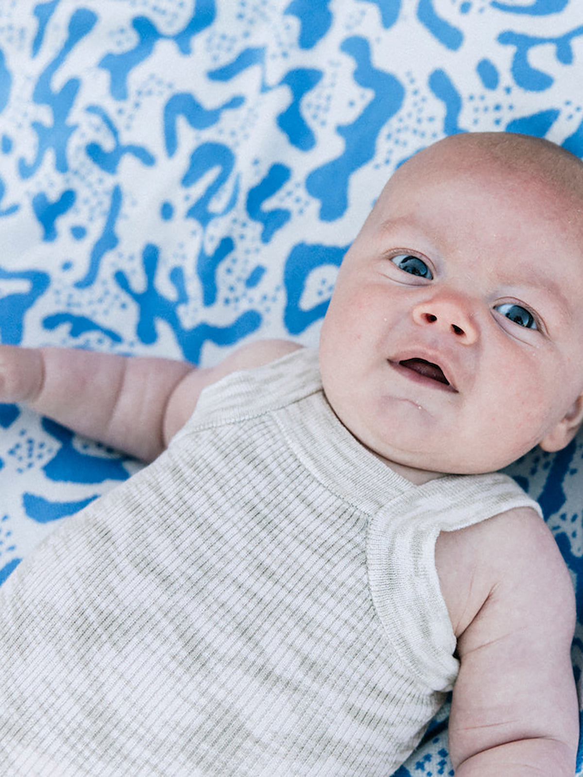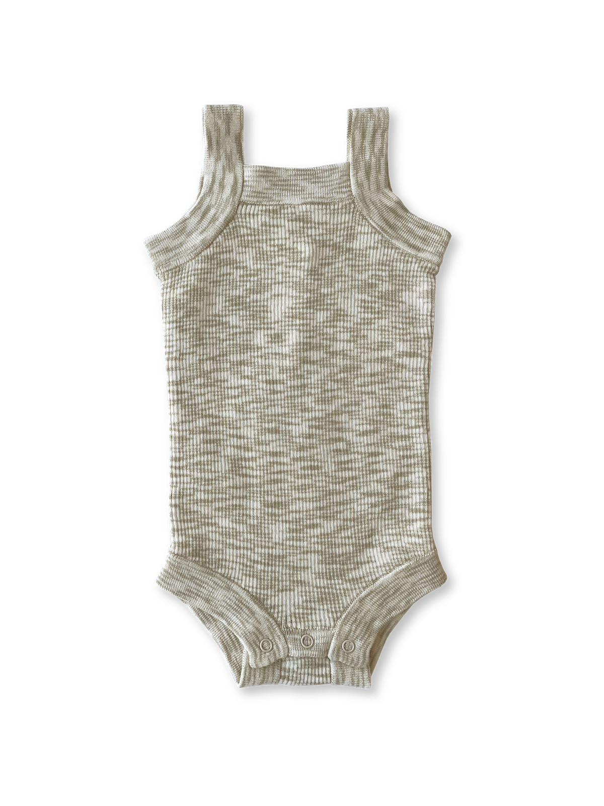 Lightweight knitted bodysuit made from GOTS-certified organic cotton. This bodysuit has a fine rib knit all over, chunky straps and press snaps at the crotch. The yarn has a space dye all over in a latte colourway.