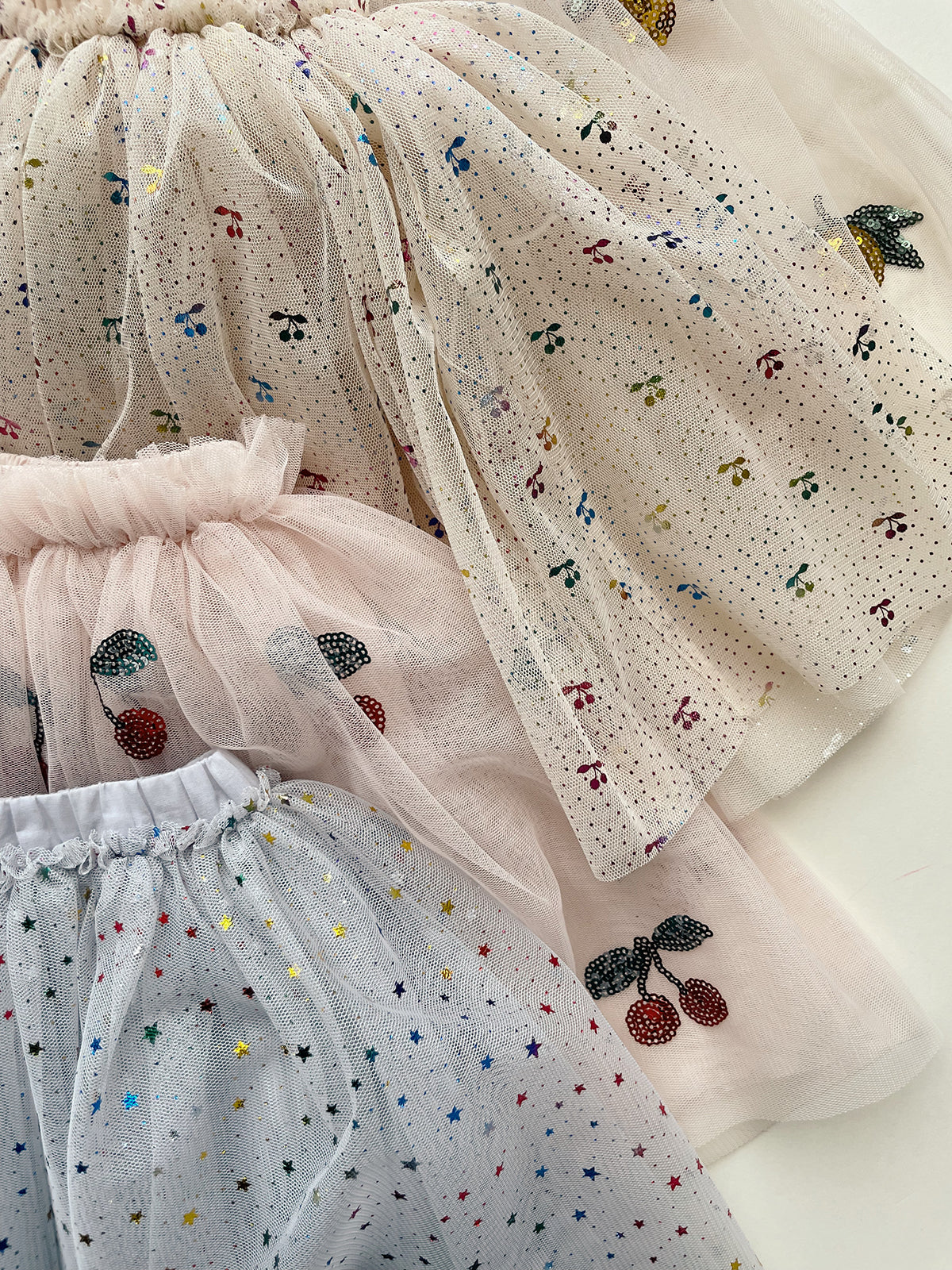 Tulle skirt made in organic cotton and polyester tulle. Features an underskirt and a soft waistband.