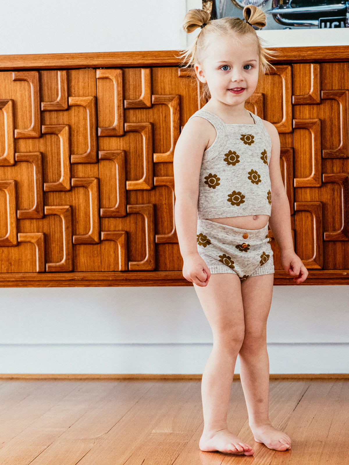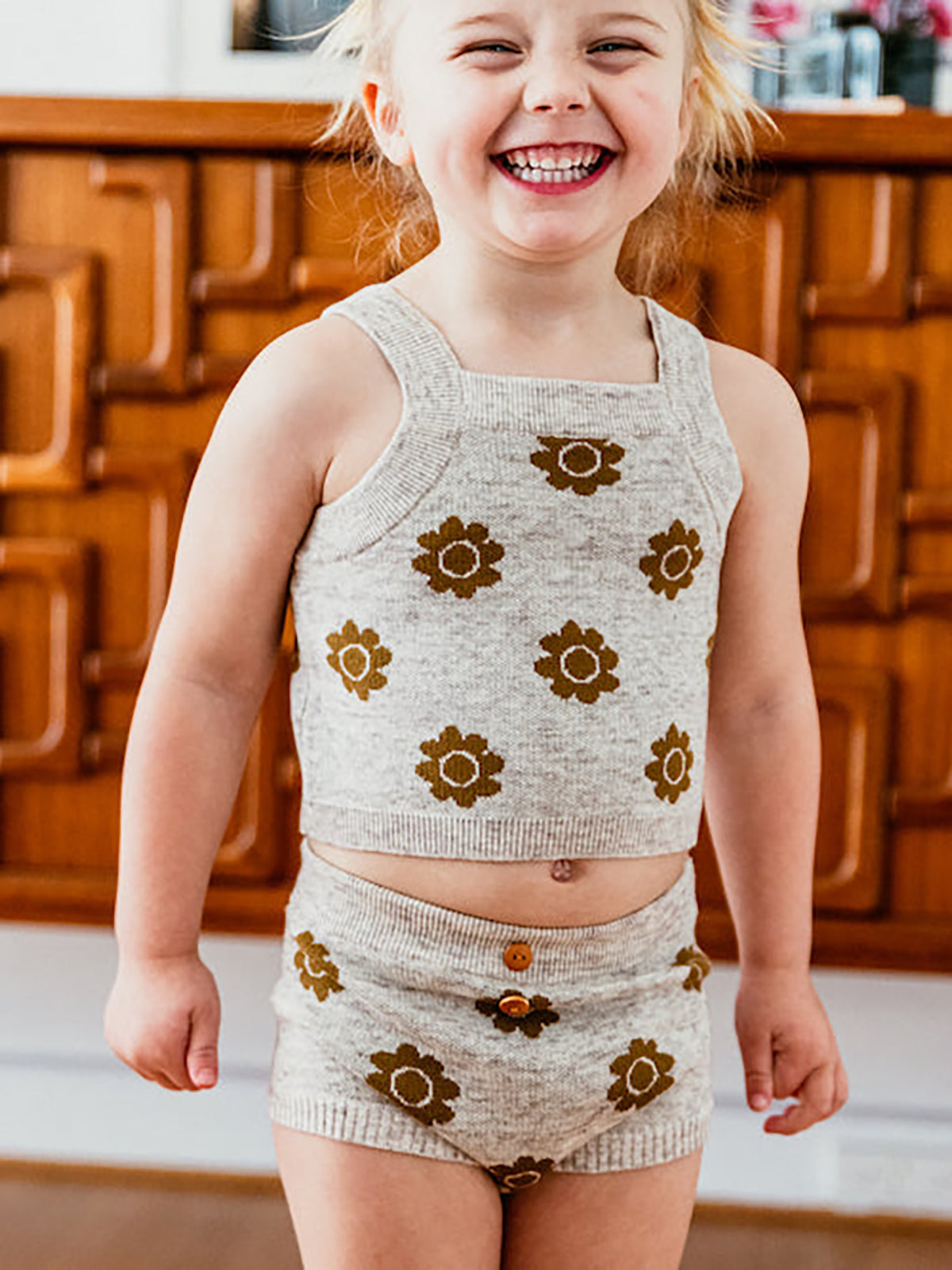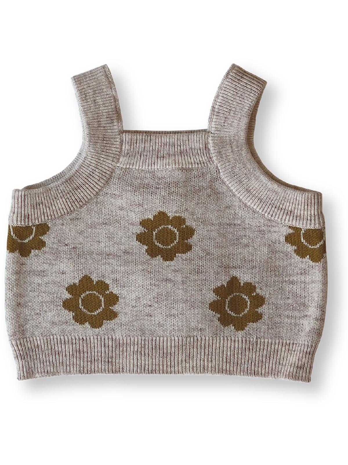 A jacquard knitted top made from 100% Organic Cotton which is GOTS certified. This top has a 'Pansy' jacquard floral design and a rib finish at the neck, straps and hem. The fit is a cropped length. Made from 100% Organic Cotton.