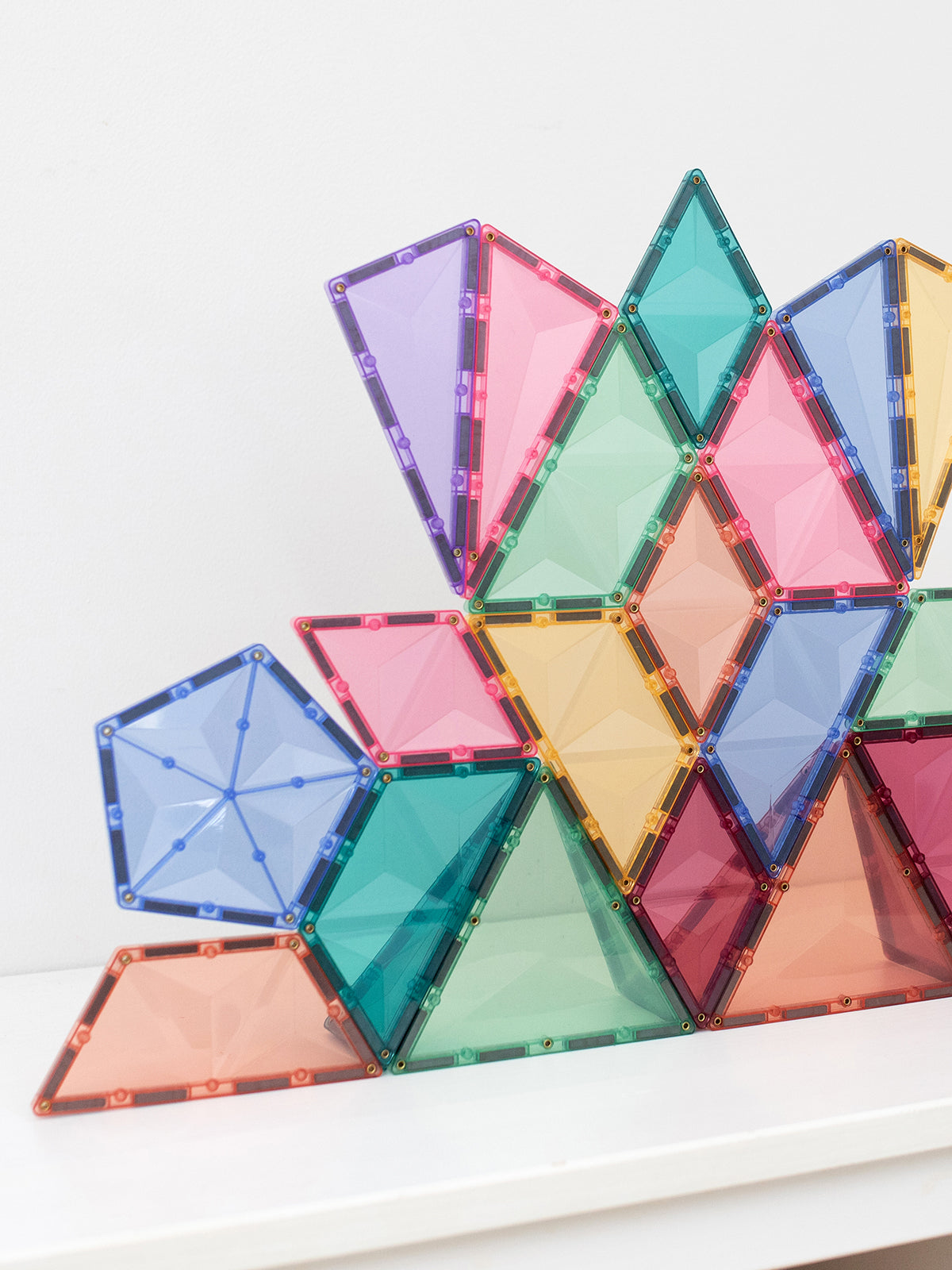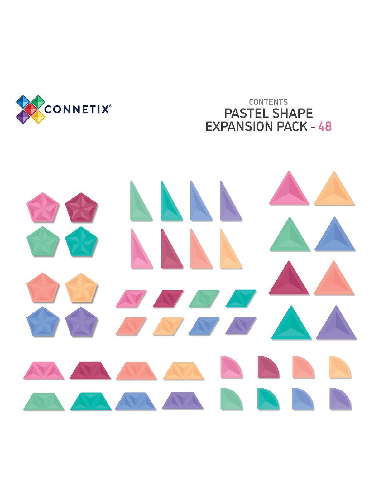 Expand play and learning possibilities with our 48 Piece Pastel Shape Expansion Pack. Featuring a range of exclusive magnetic tile shapes, including large triangles, right-angle triangles, quarter circles, pentagons, trapezoids and rhombi, this pack enhances design and play possibilities with Connetix.