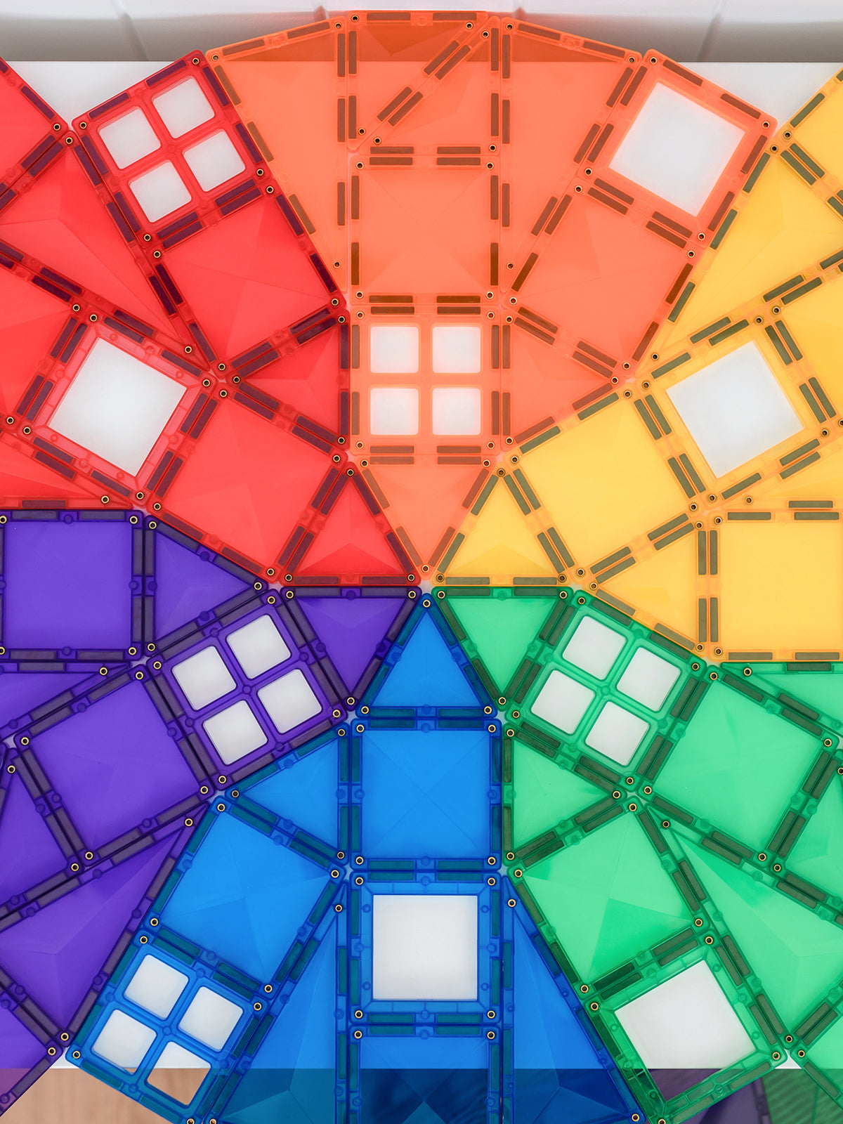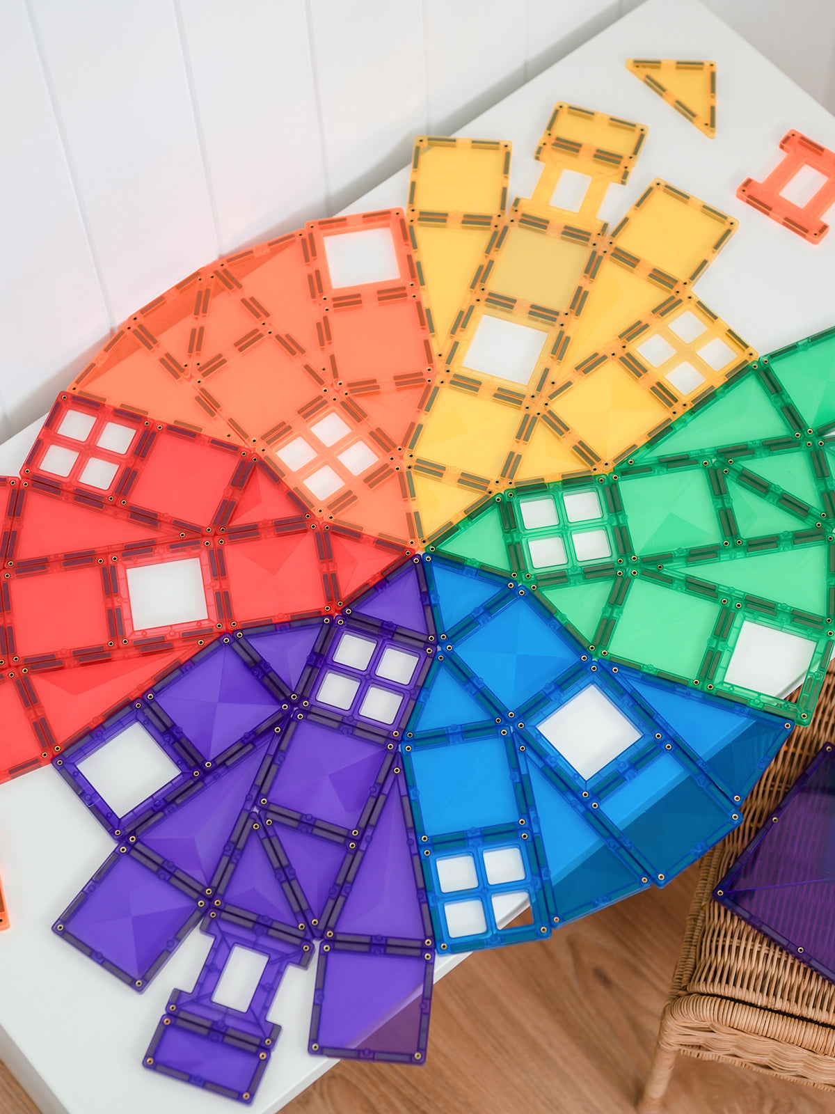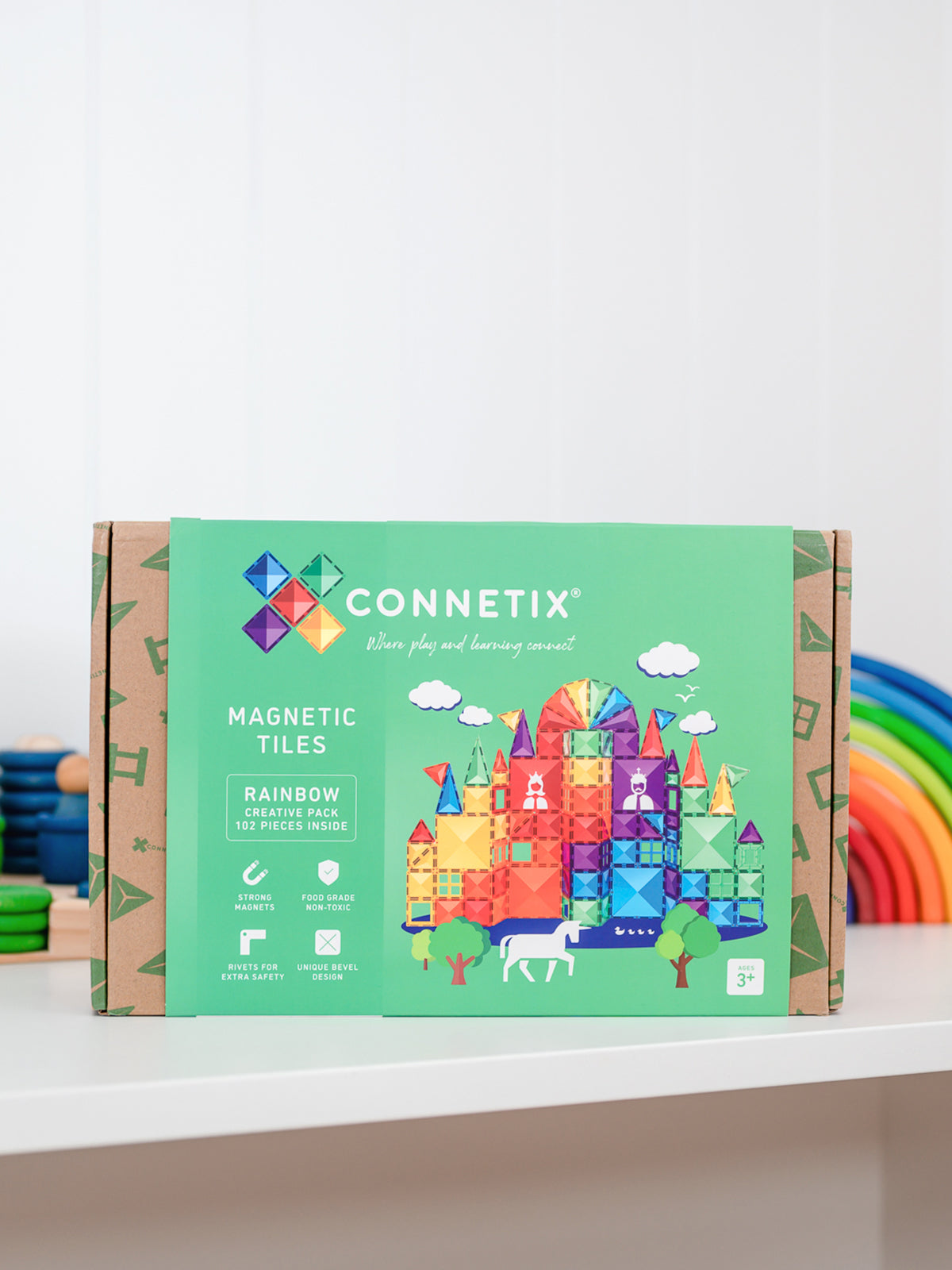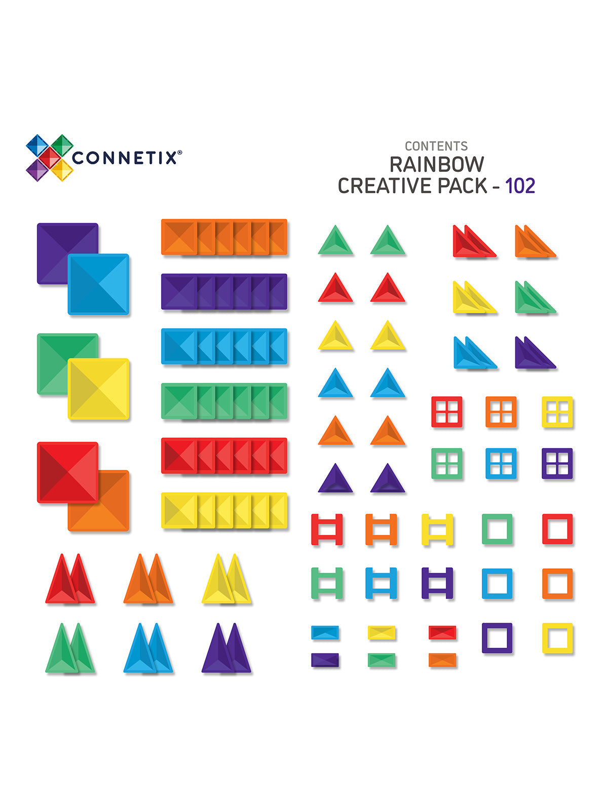 Bring imaginations to life and provide endless possibilities for creativity and learning through PLAY with the Connetix 102 Piece Rainbow Creative Pack. Featuring a variety of shapes including small and large squares, equilateral, right angle and isosceles triangles, plus fences, windows and door frames in every rainbow colour, this pack is perfect for family play and building BIGGER Connetix creations!