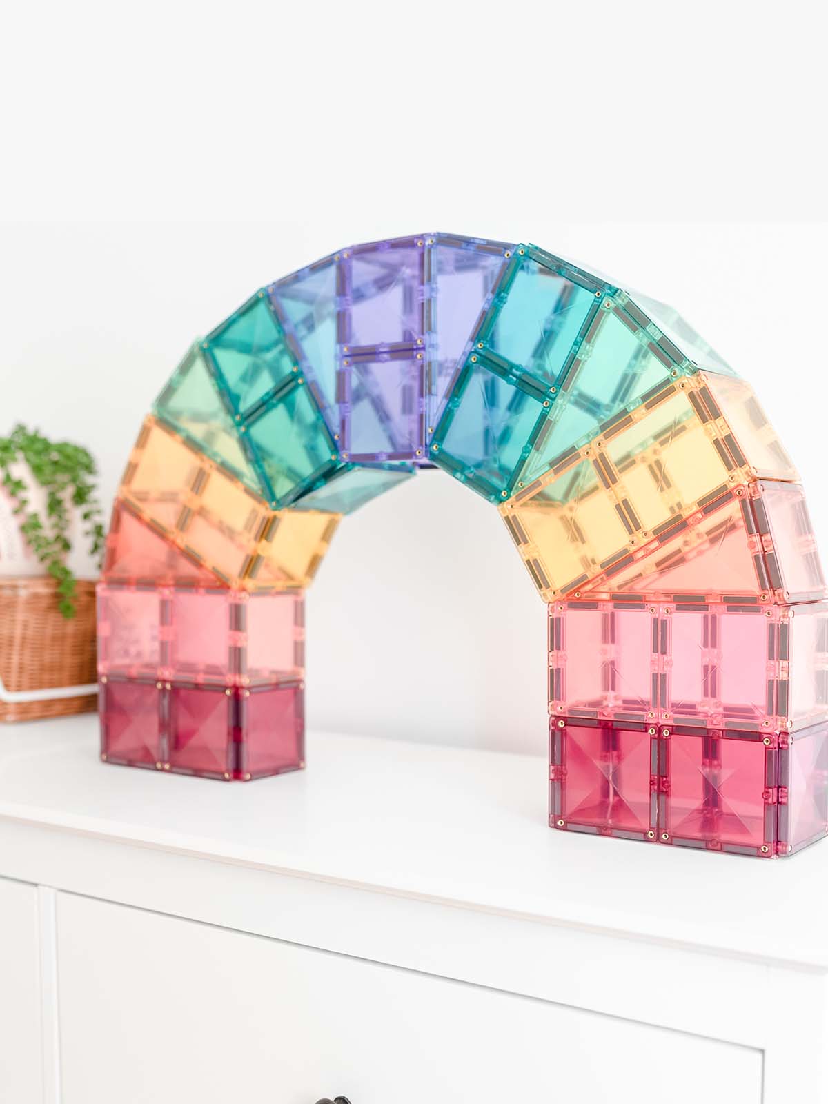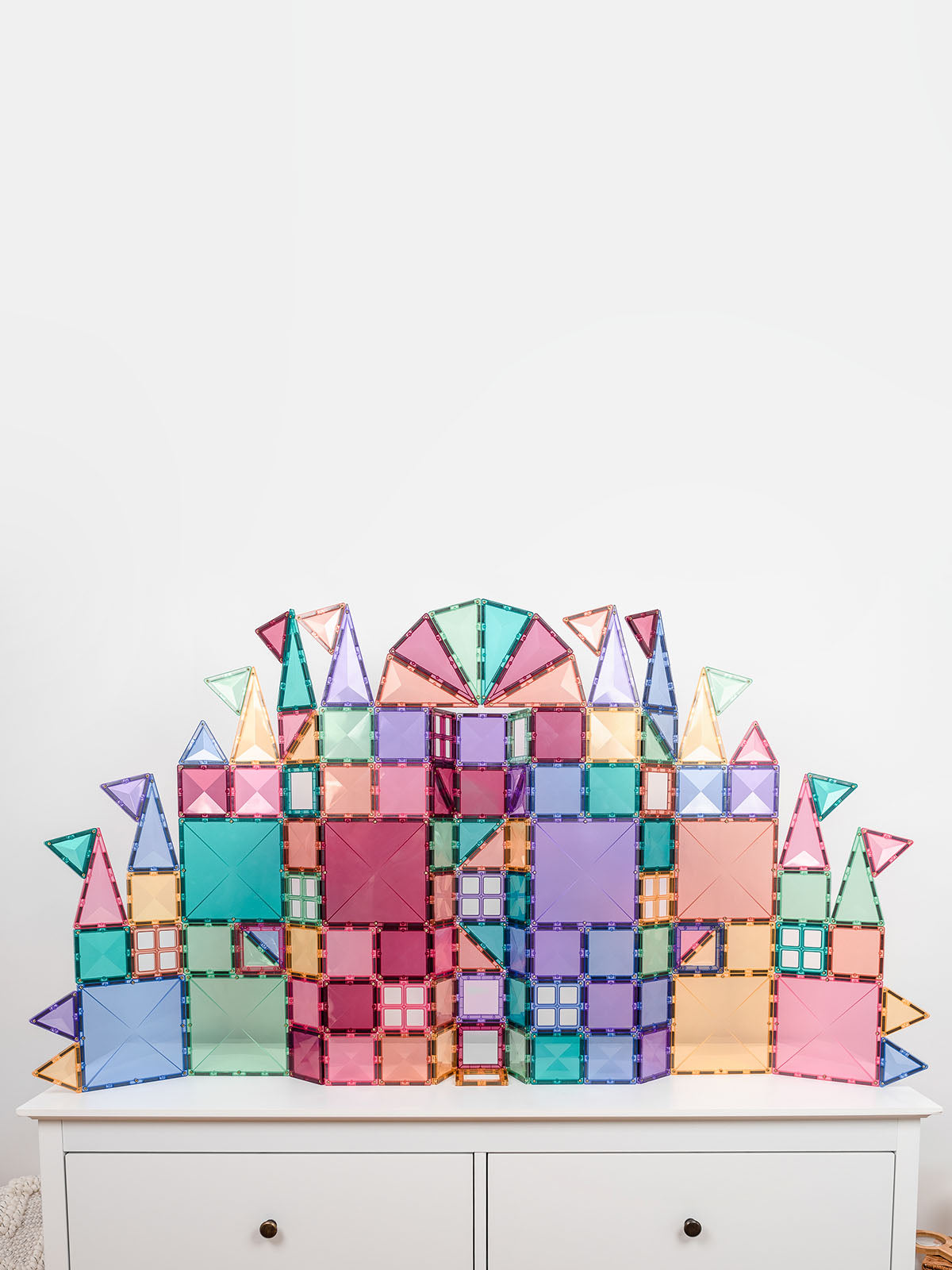 Whether playing independently or with friends and family, the 120 piece Pastel Creative Pack encourages STEAM learning and the development of fine and gross motor skills. Watch as children create bigger castles and rockets, towers, coin drops, bridges and mandalas, explore patterns and shapes, create colour sorting boxes, plus so much more.