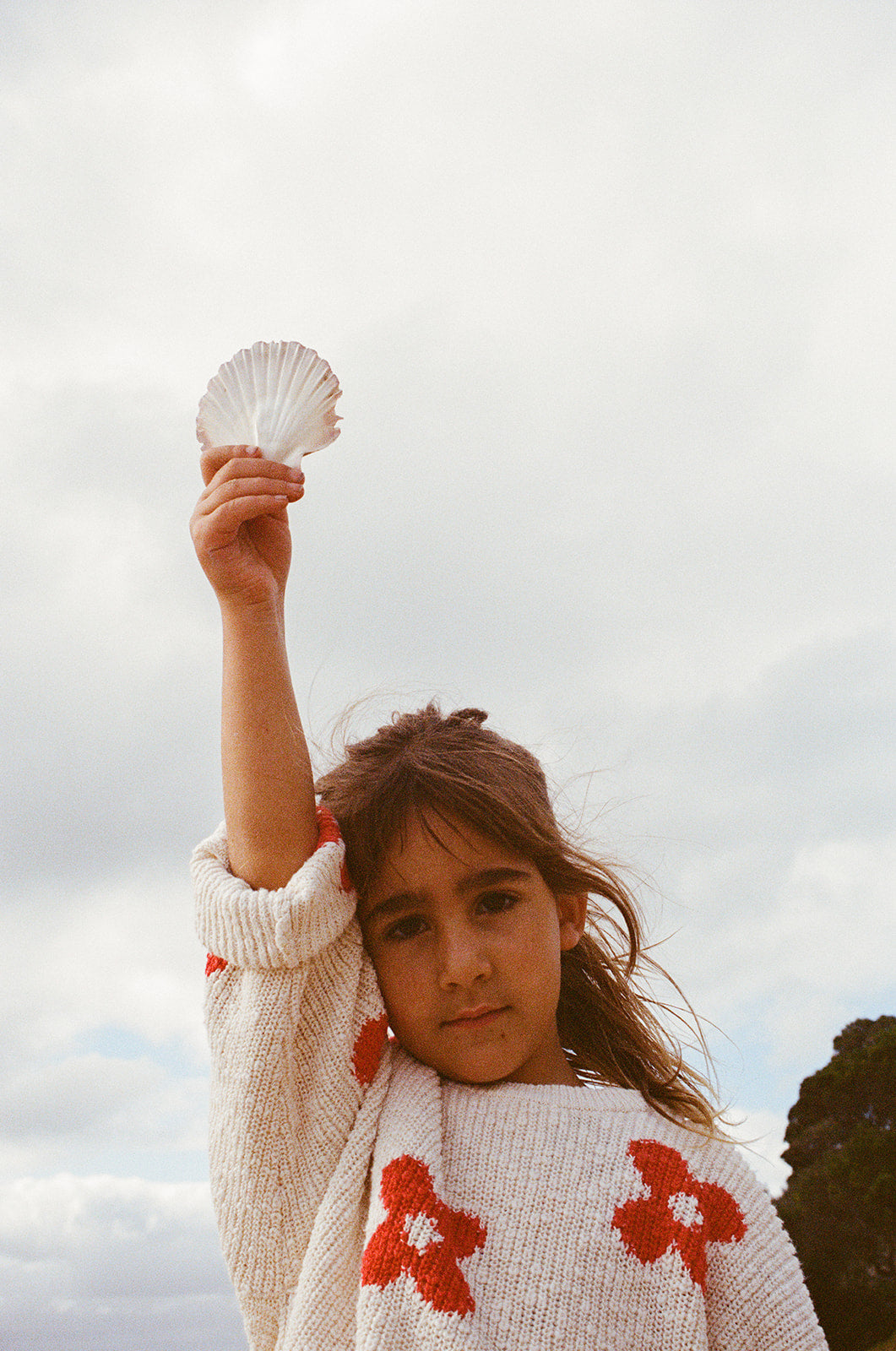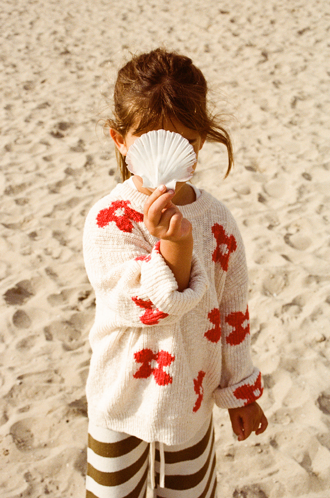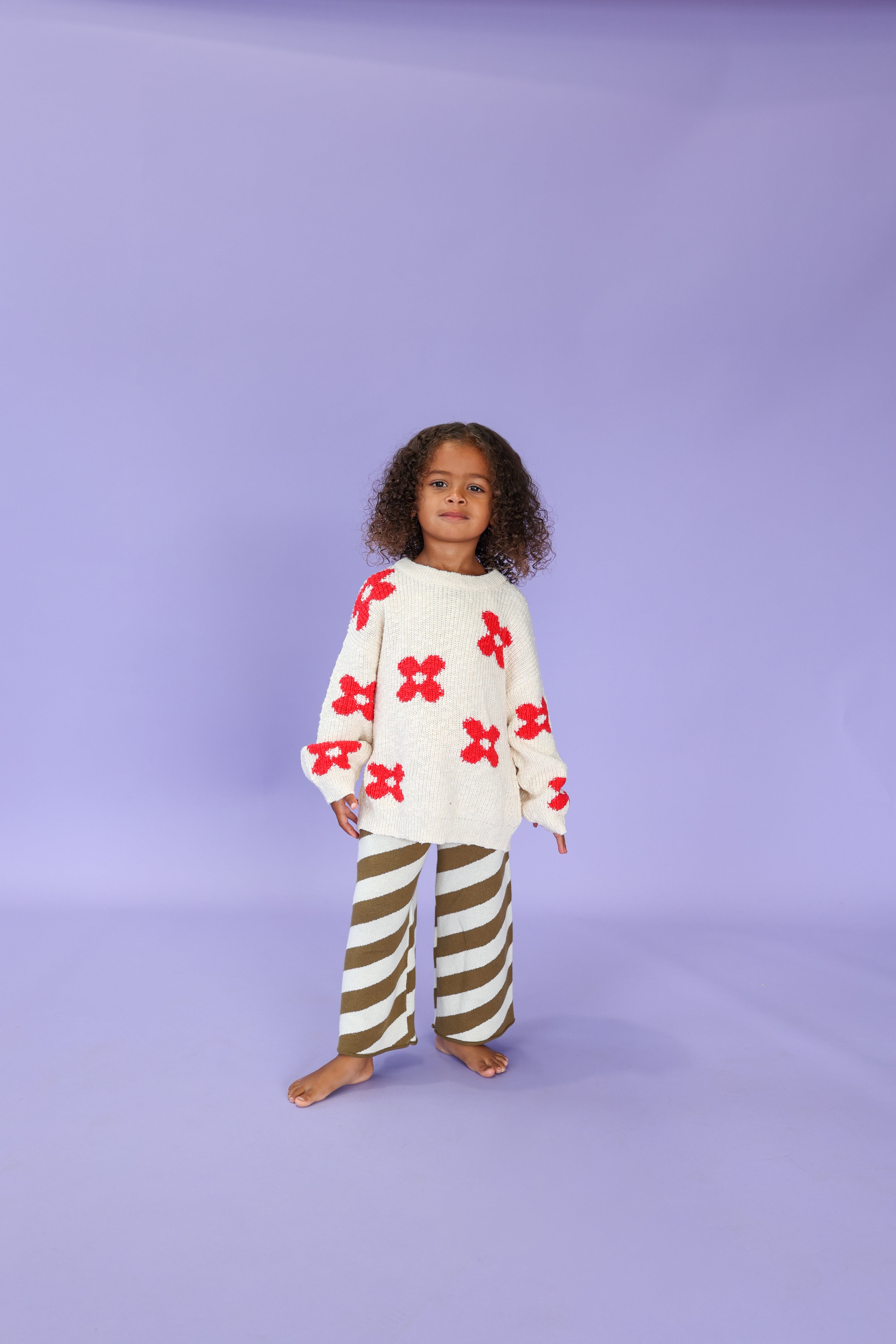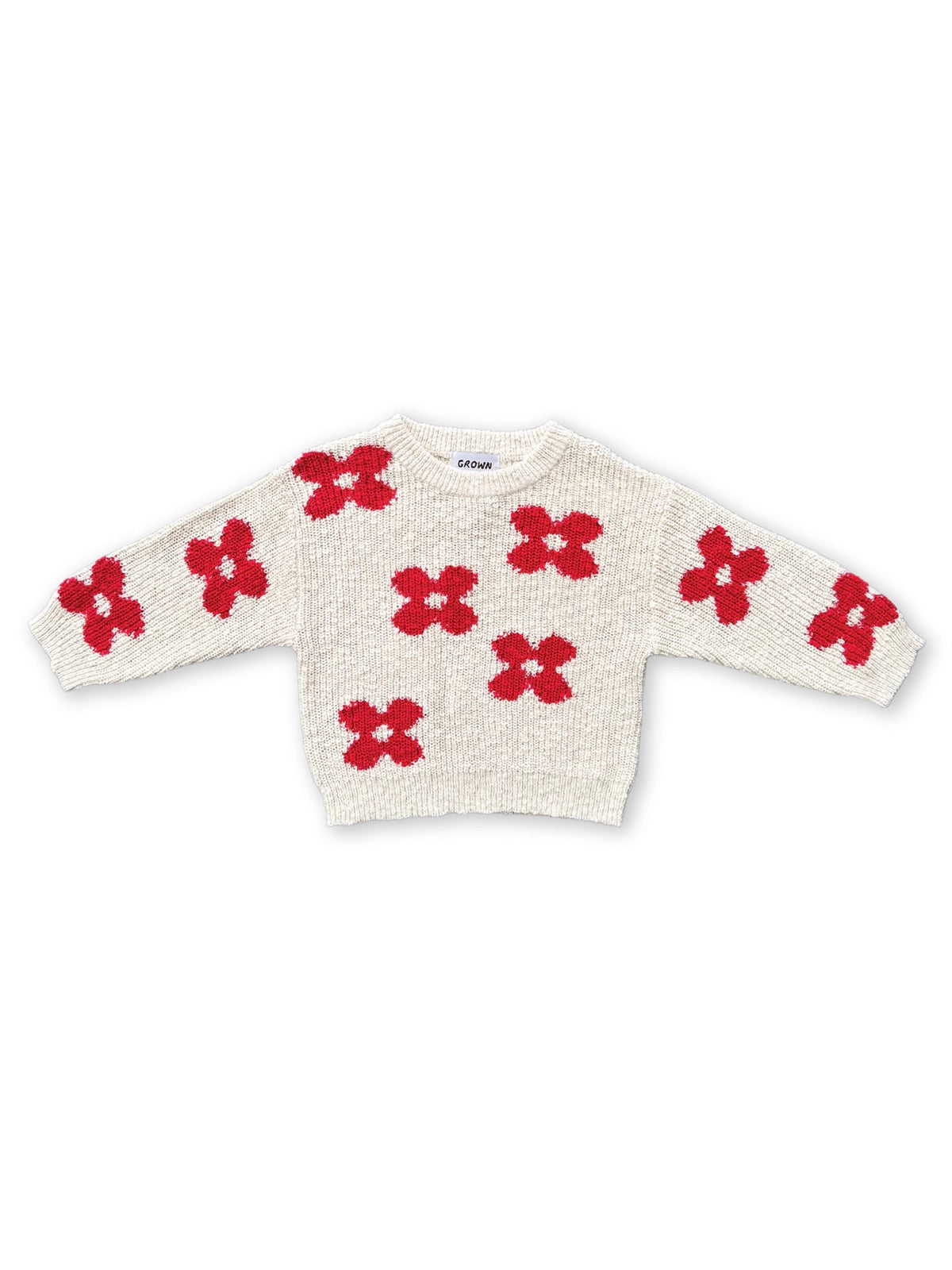 This cozy pullover features a ribbed knit design crafted from textured yarn, highlighted by a charming 'Posy' flower pattern. With its dropped shoulder and relaxed fit, it offers comfortable wear for everyday ease.