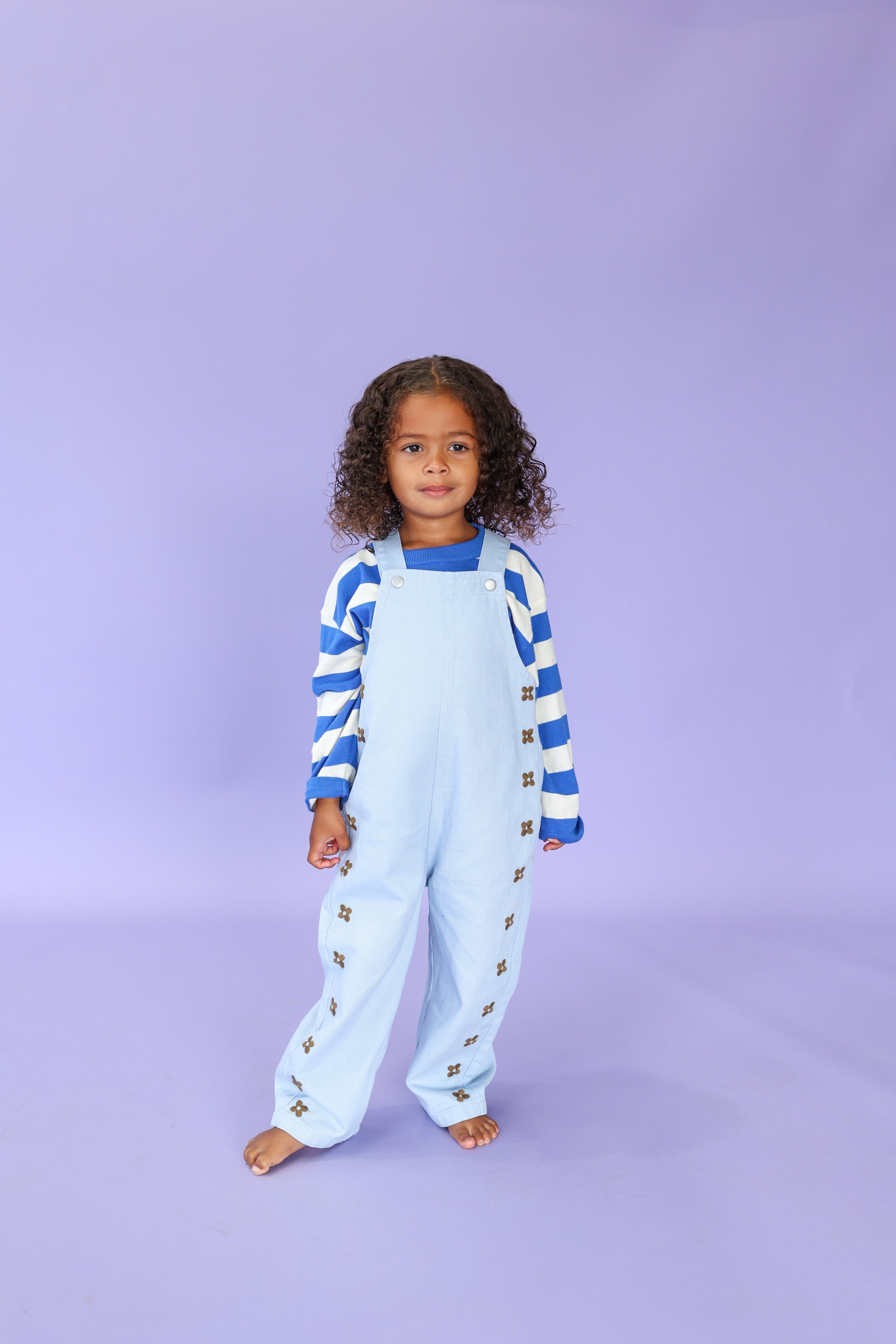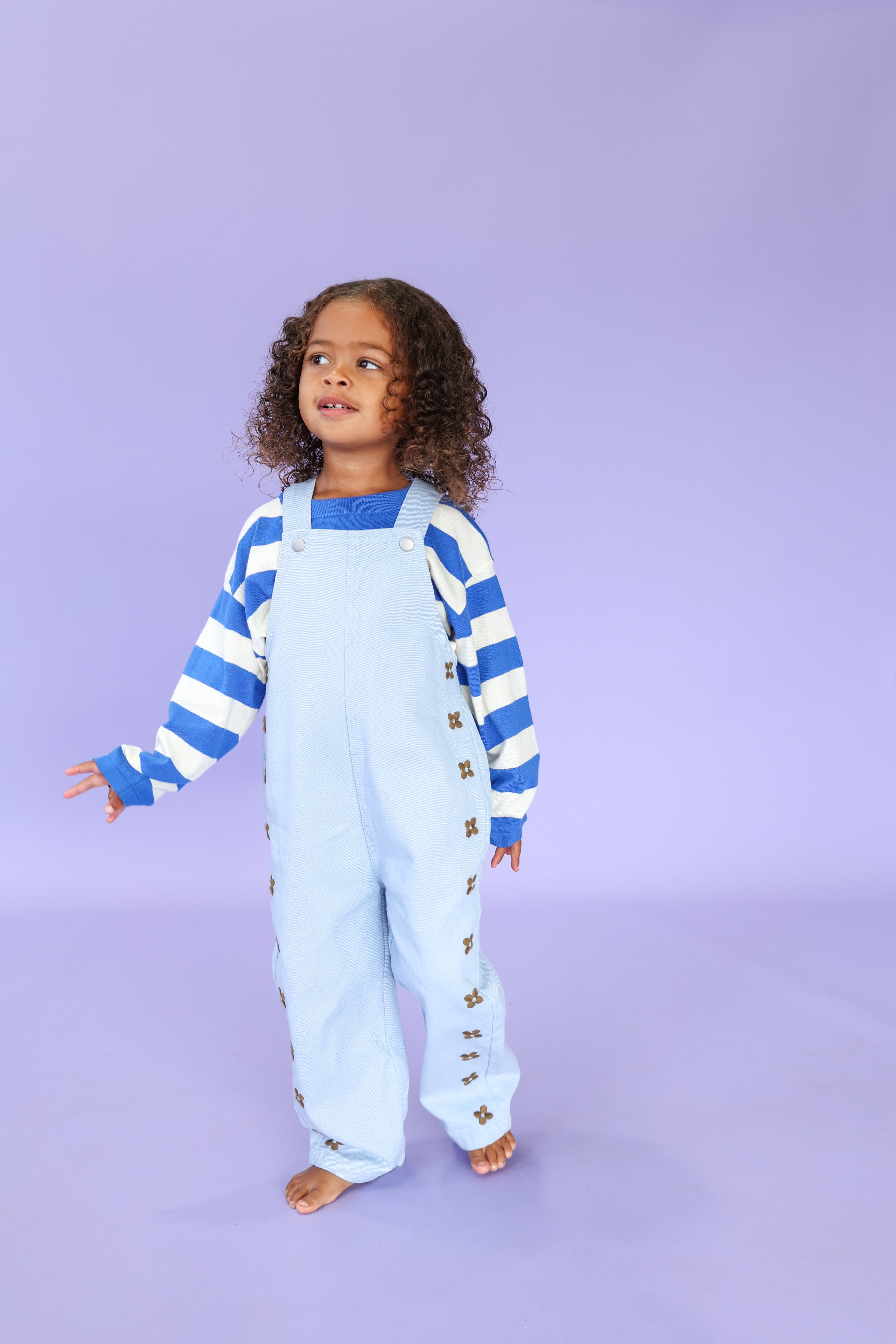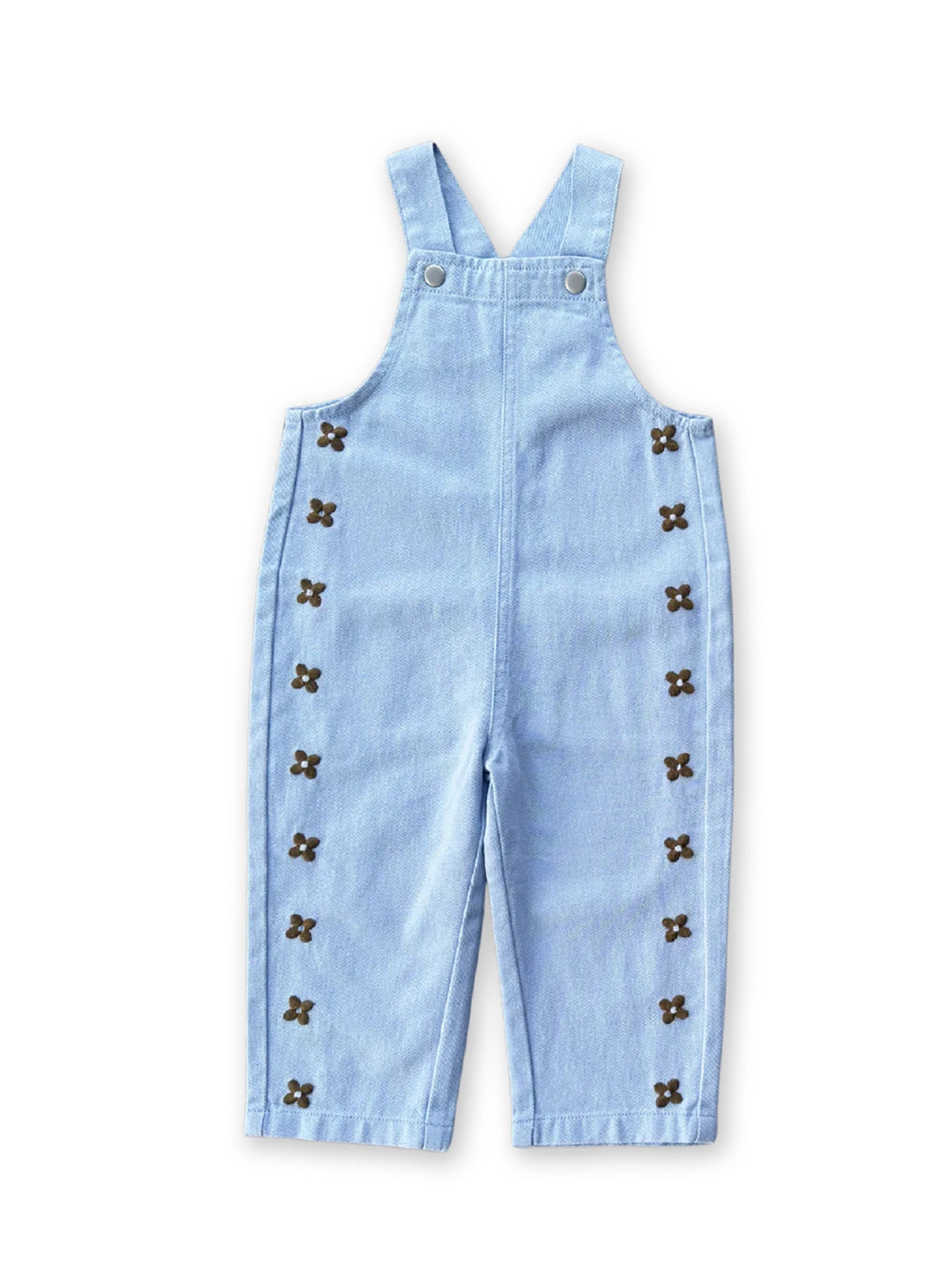These overalls feature delicate posy embroidery along the sides, adding a charming touch. The metal press snaps on the straps allow for easy adjustments to ensure a comfortable fit as your little one grows.