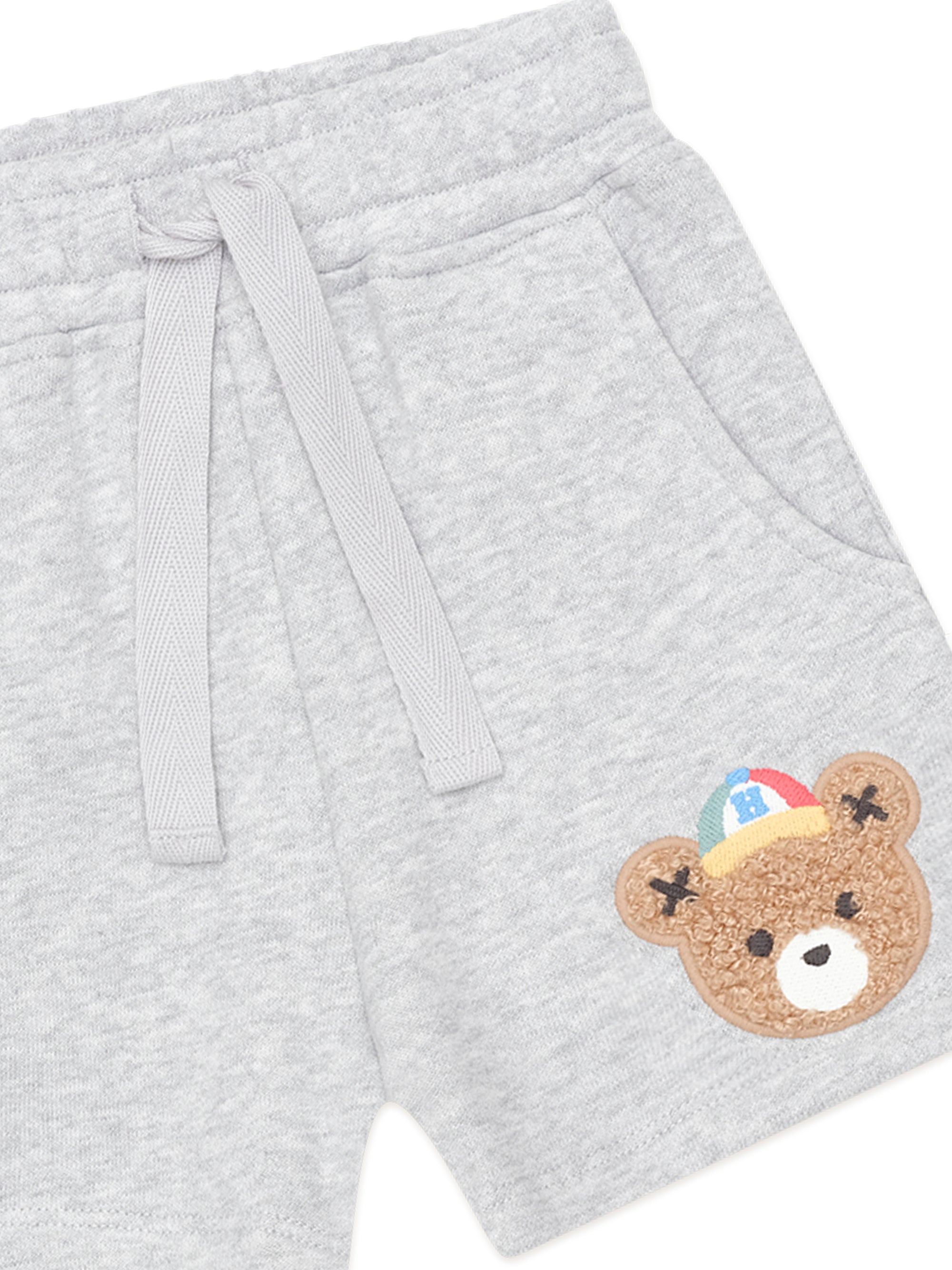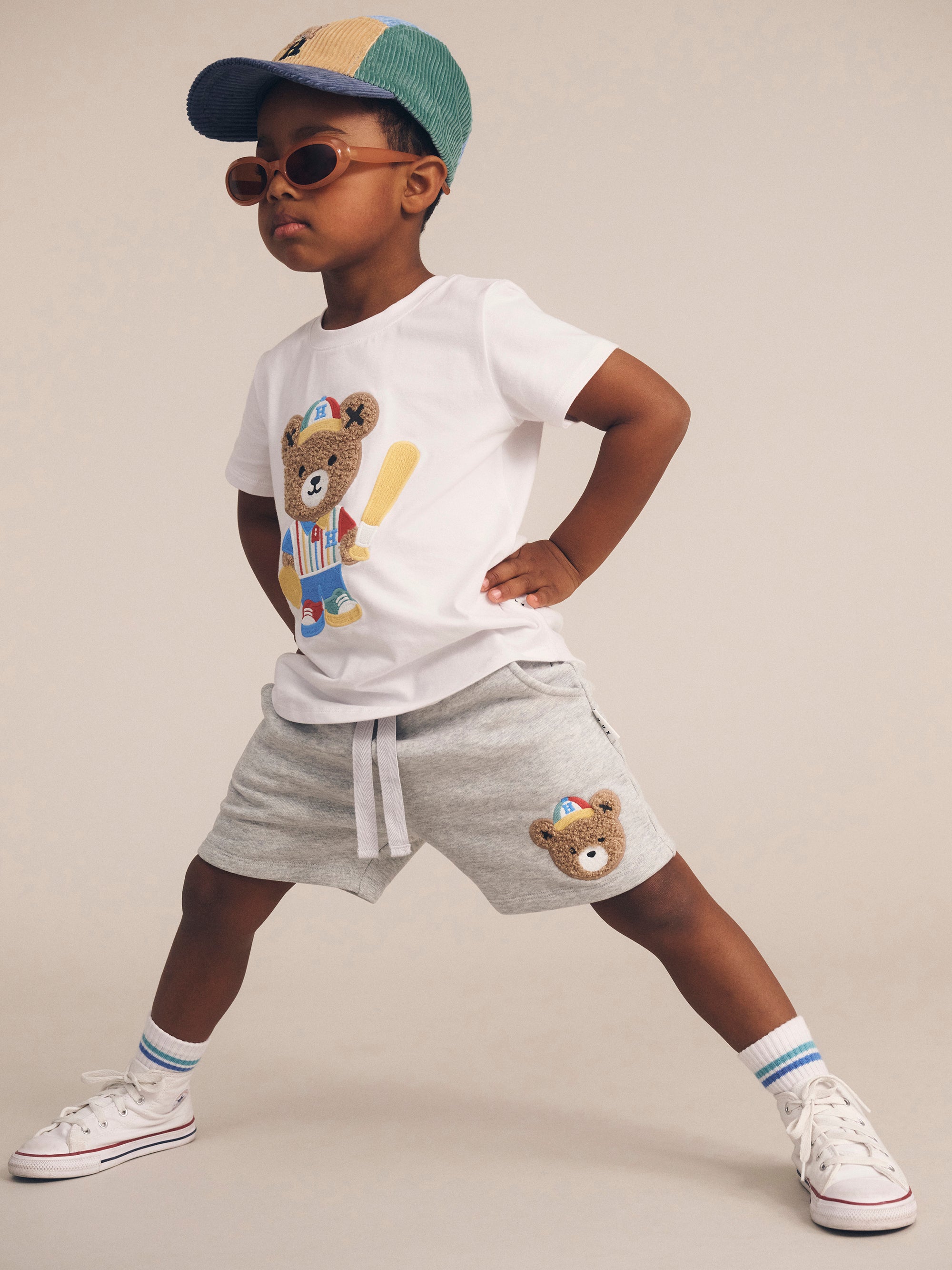 A cosy pair of fleece shorts in a retro baseball style. Made from fluffy organic cotton, they feature a functional drawstring for an adjustable fit, a Huxbear embroidery detail and a soft, stretchy waistband to keep little tummies snug.