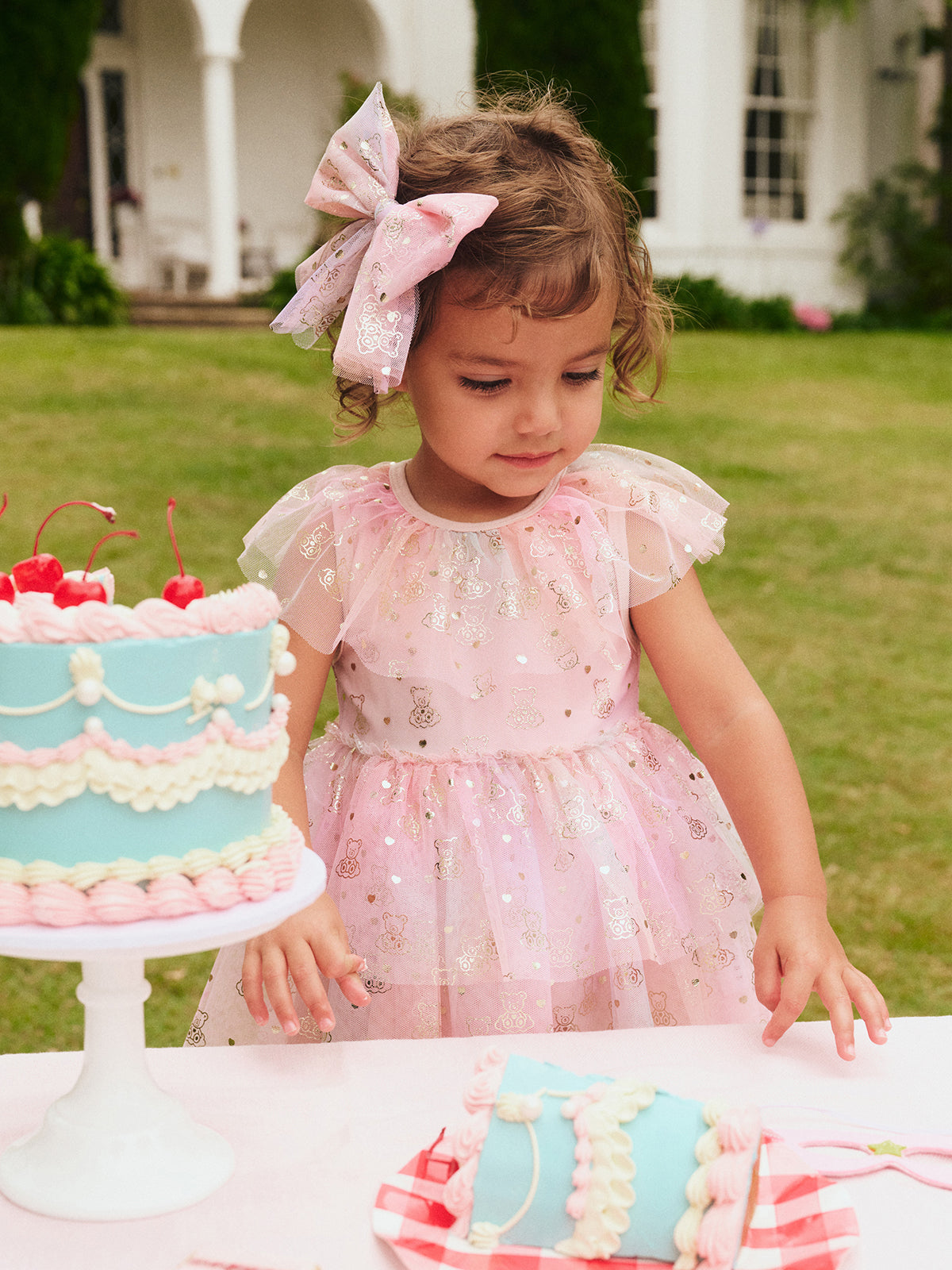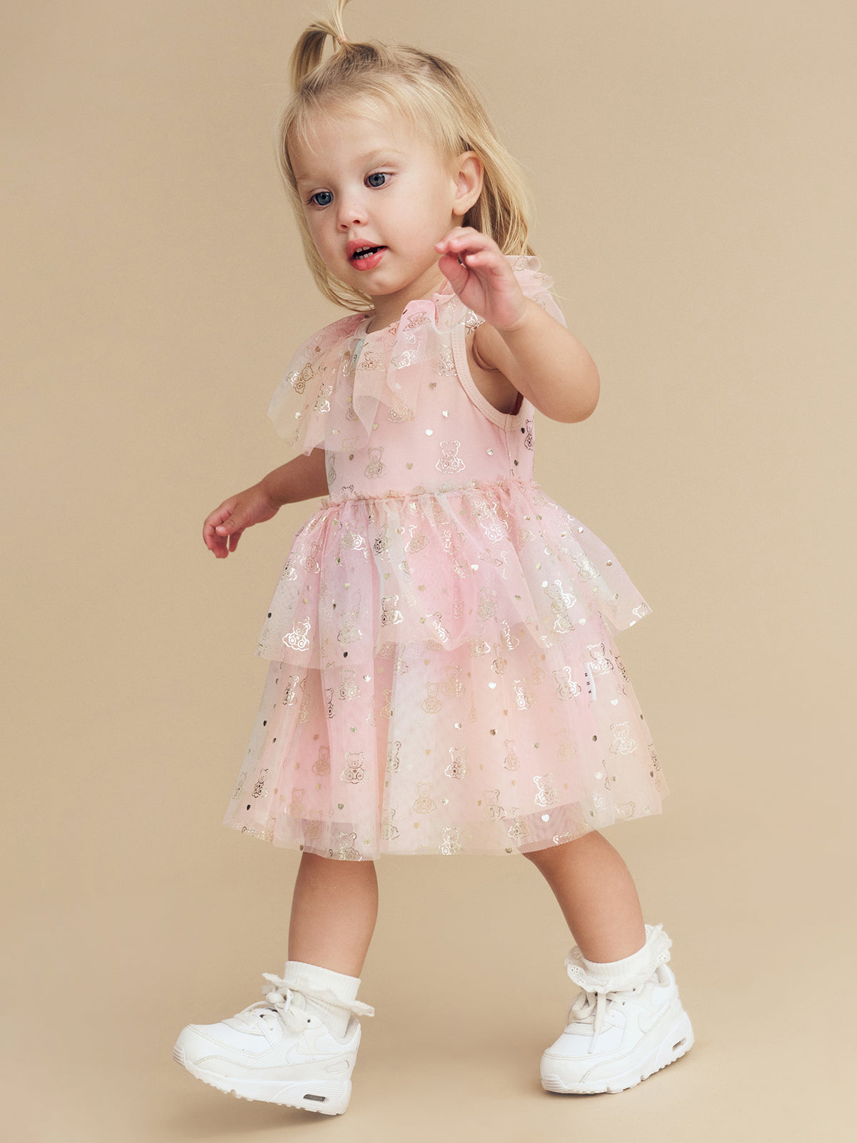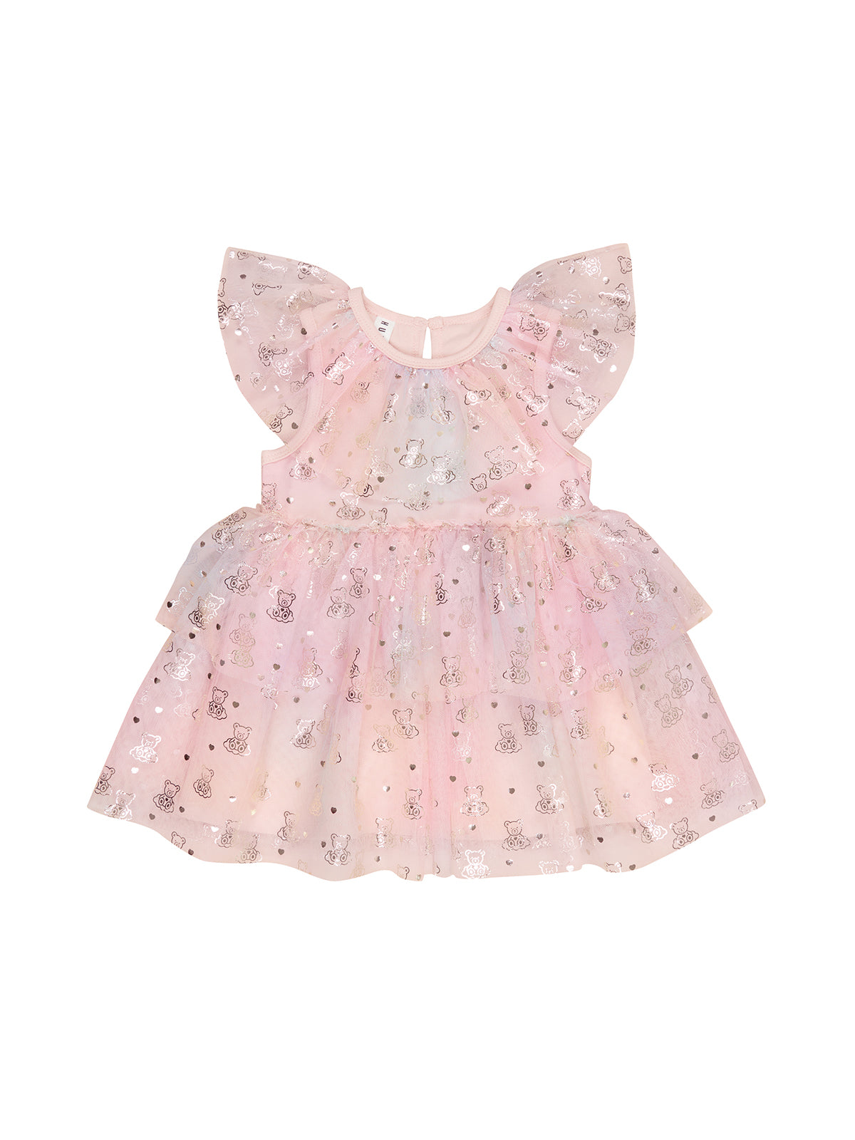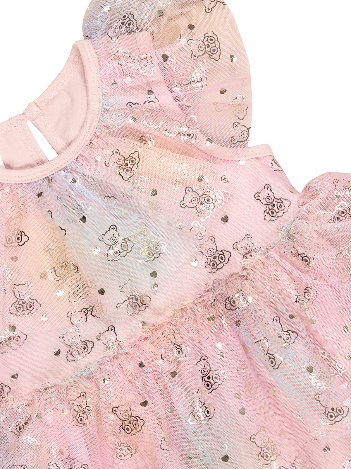 Tiered rainbow swirl tulle party dress with all over cloud bear gold foil print on tulle