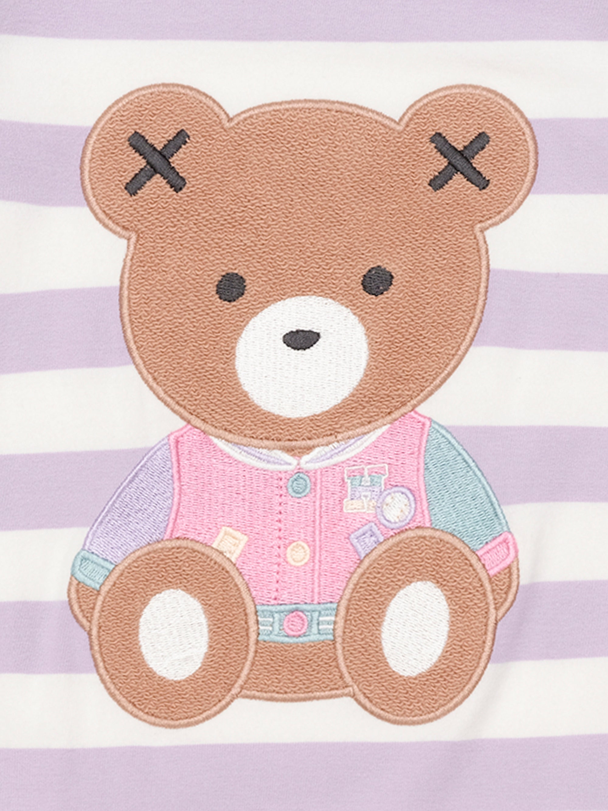 A marshmallow-soft striped purple romper with fun and furry Huxette embroidery. Consciously crafted from premium organic cotton, it has stainless steel snaps at the shoulder and crotch for super snappy dressing. Just add squishy legs.