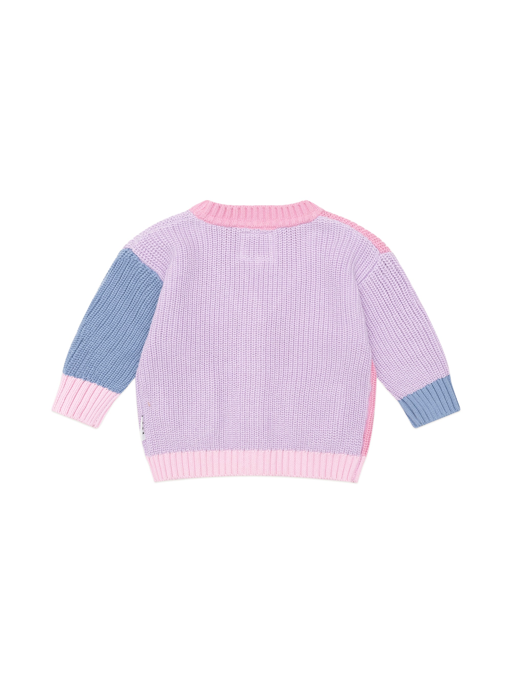 Take me back to the 90s. This nostalgic pink cardi is a colour block dream, made from organic cotton in a chunky weave for comfort and warmth. Featuring easy buttons and peeping Huxette pockets.
