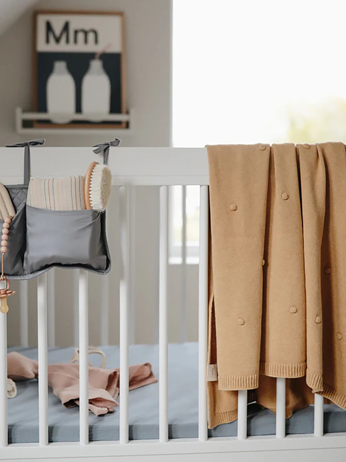 Keep baby warm and cozy in Mushie’s knitted blanket in various designs