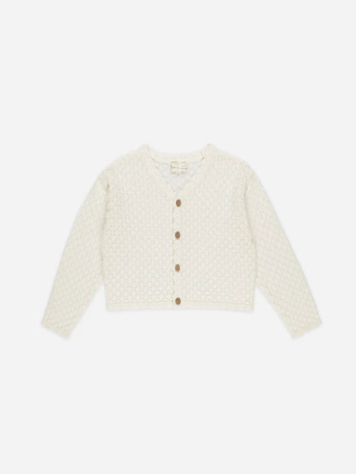 The Ella Cardigan adds a delightful touch to any ensemble with its charming scalloped edges and lovely coconut button detailing. This airy ivory piece serves as an ideal layering option for completing your little one's look with elegance and warmth.