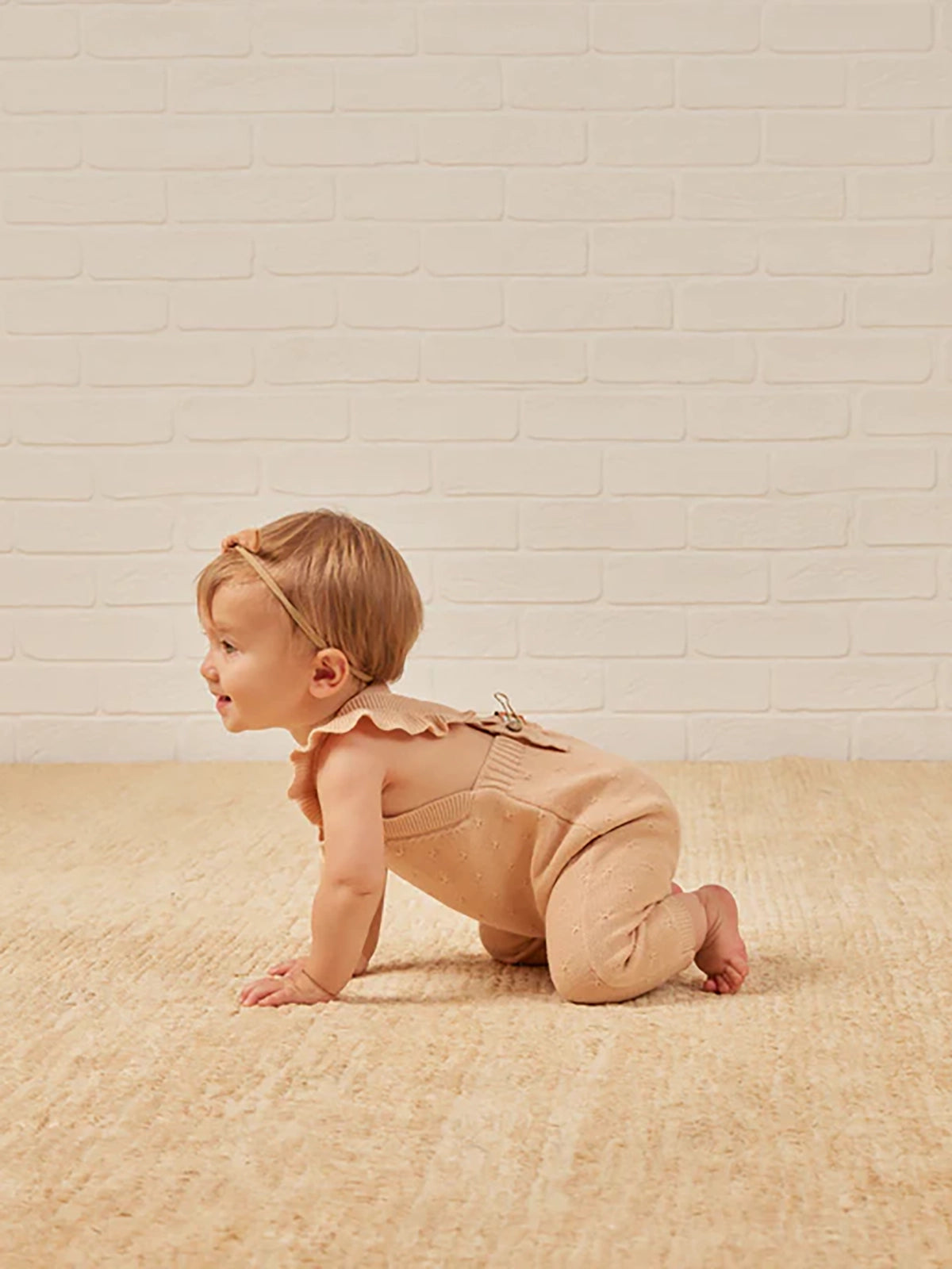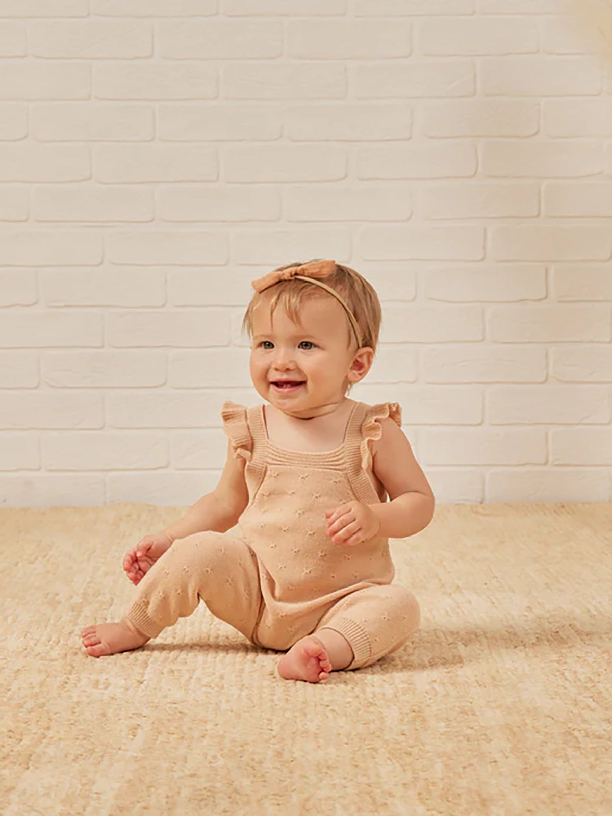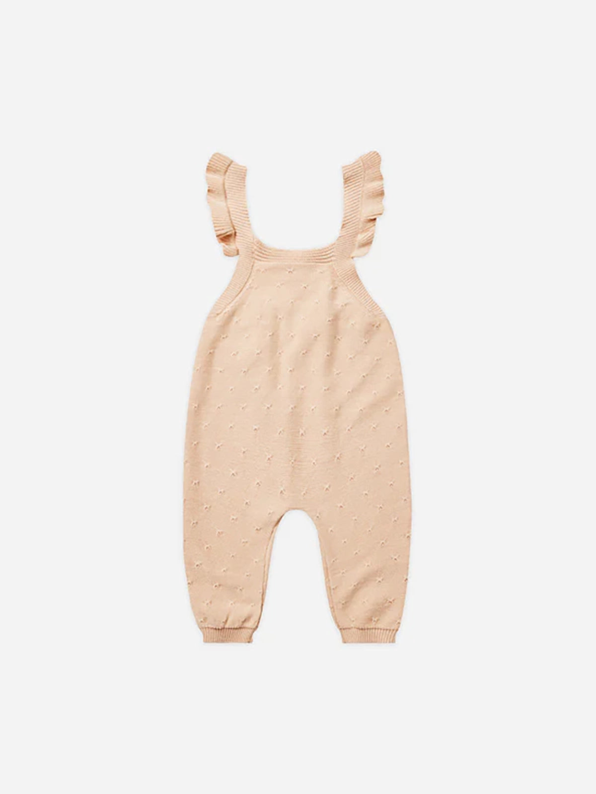 Pointelle knit overalls in the softest sweater knit with adjustable button straps and a ruffle detail at the sleeve.