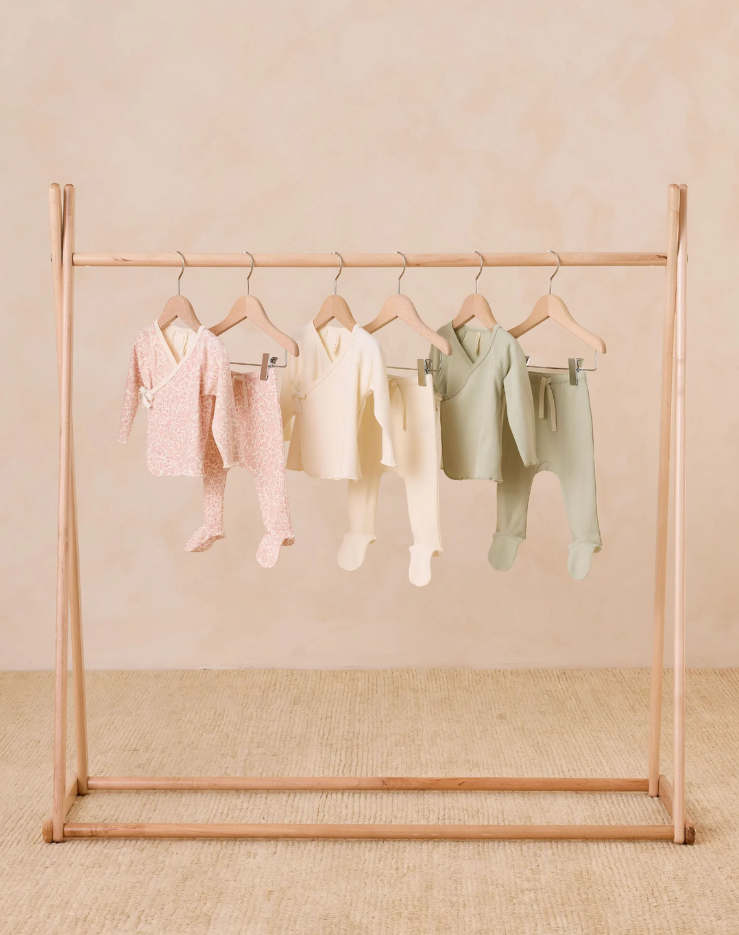 Bring home baby in this sweet look. Featuring Quincy Mae's long sleeve wrap top with an inside snap and tie on the outside for easy changes and matching footed drawstring pants.