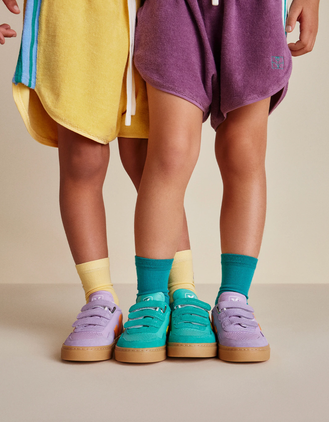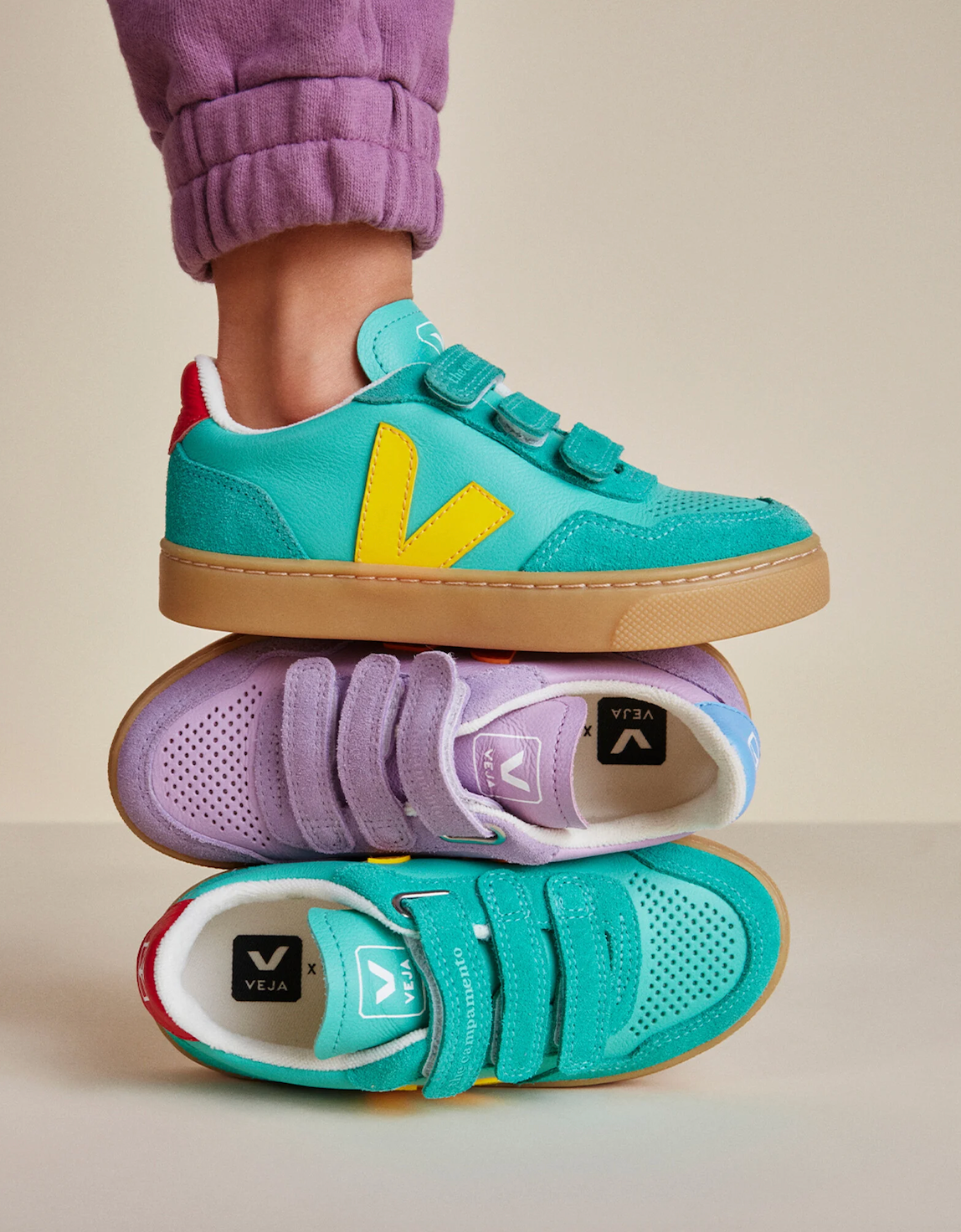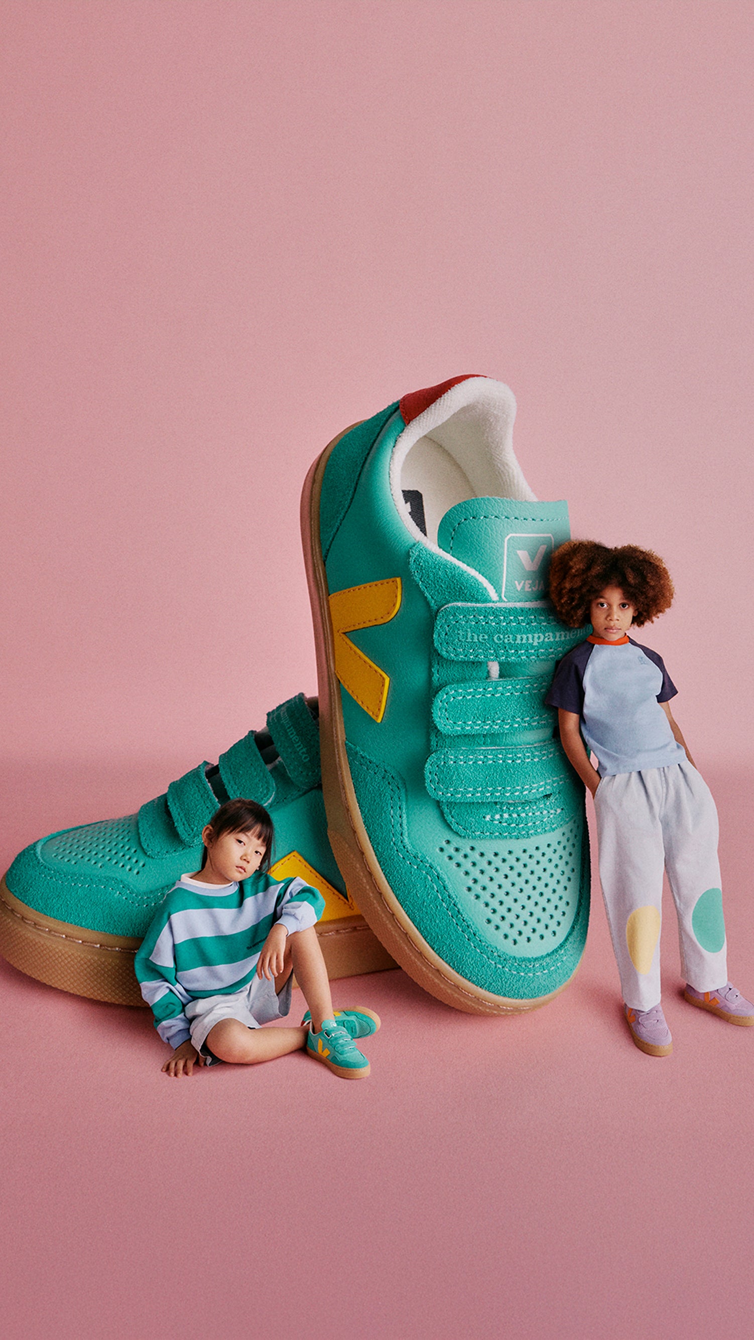 Bright colours for the little ones thanks to VEJA's collaboration with The Campamento . Discover the V-90 Small, specially designed for children. With its cool style, both retro and modern, the V-90 Small combines the athletic fashion of the 90s with fresh touches.