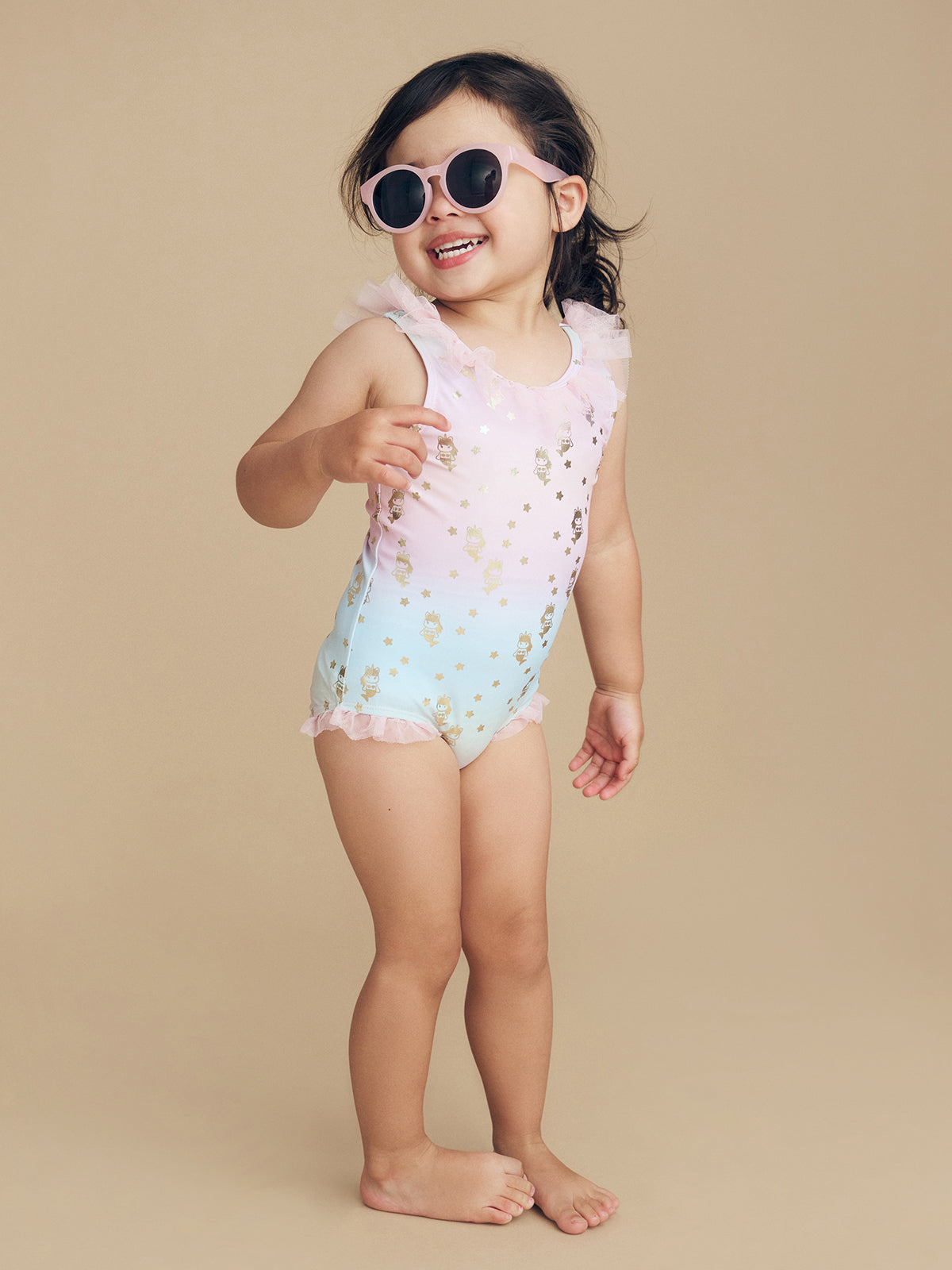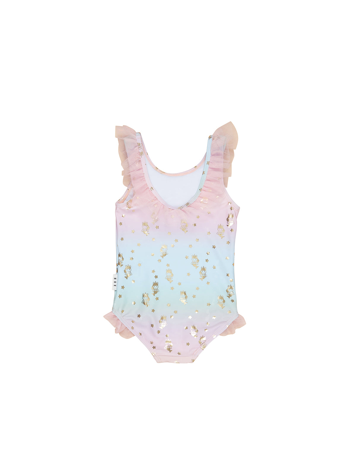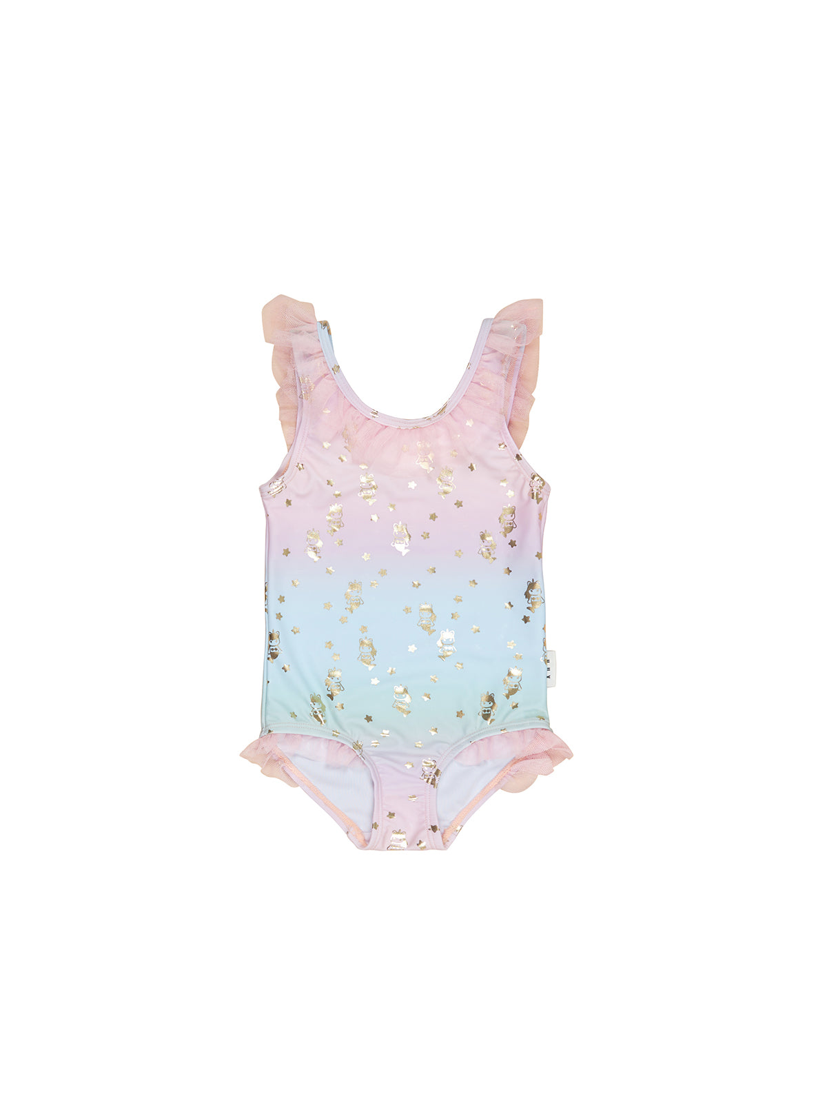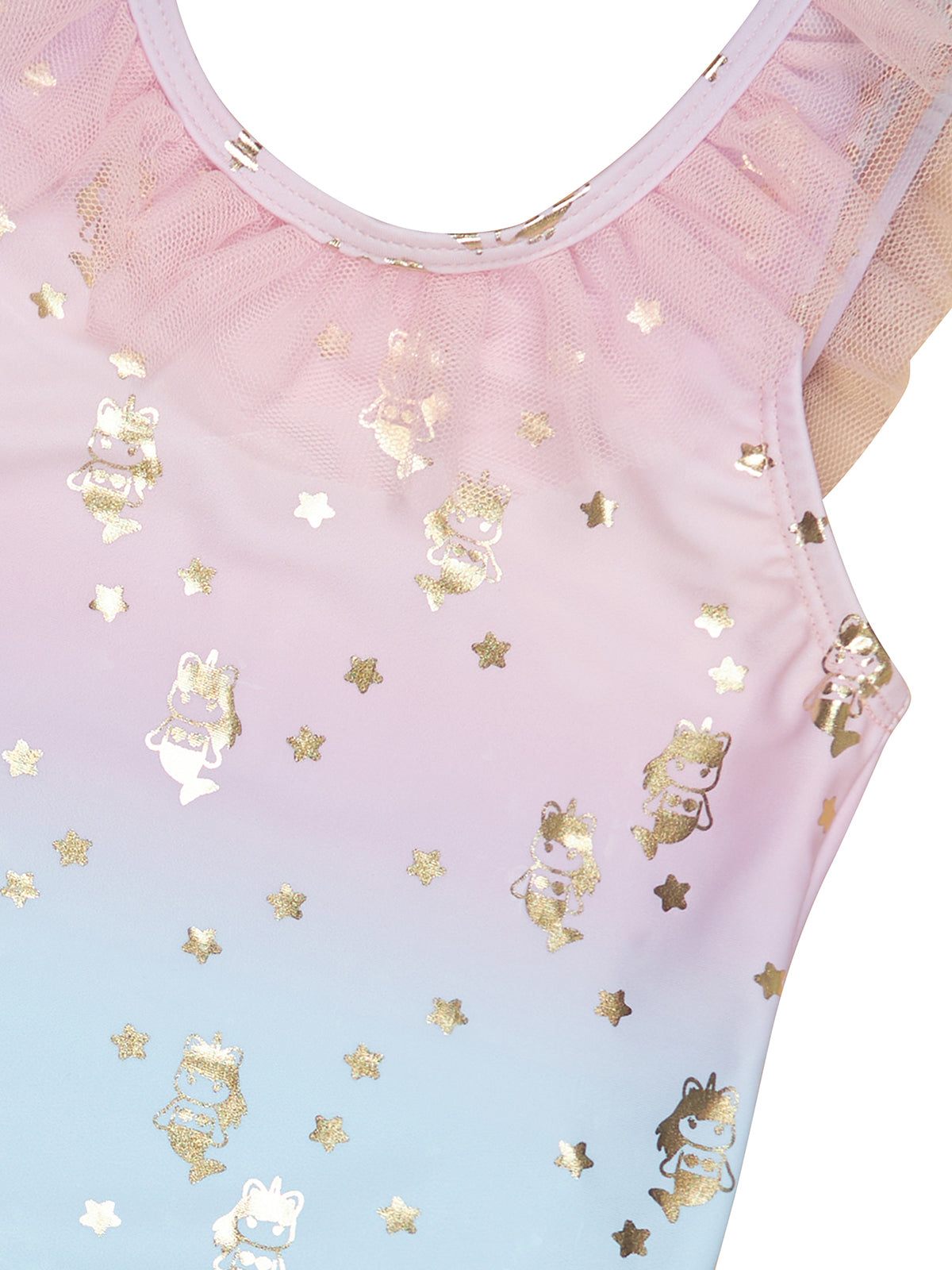 One piece ballet swimsuit with all over ocean rainbow colours and gold foil star mermaid print. Featuring tulle frills along the neckline