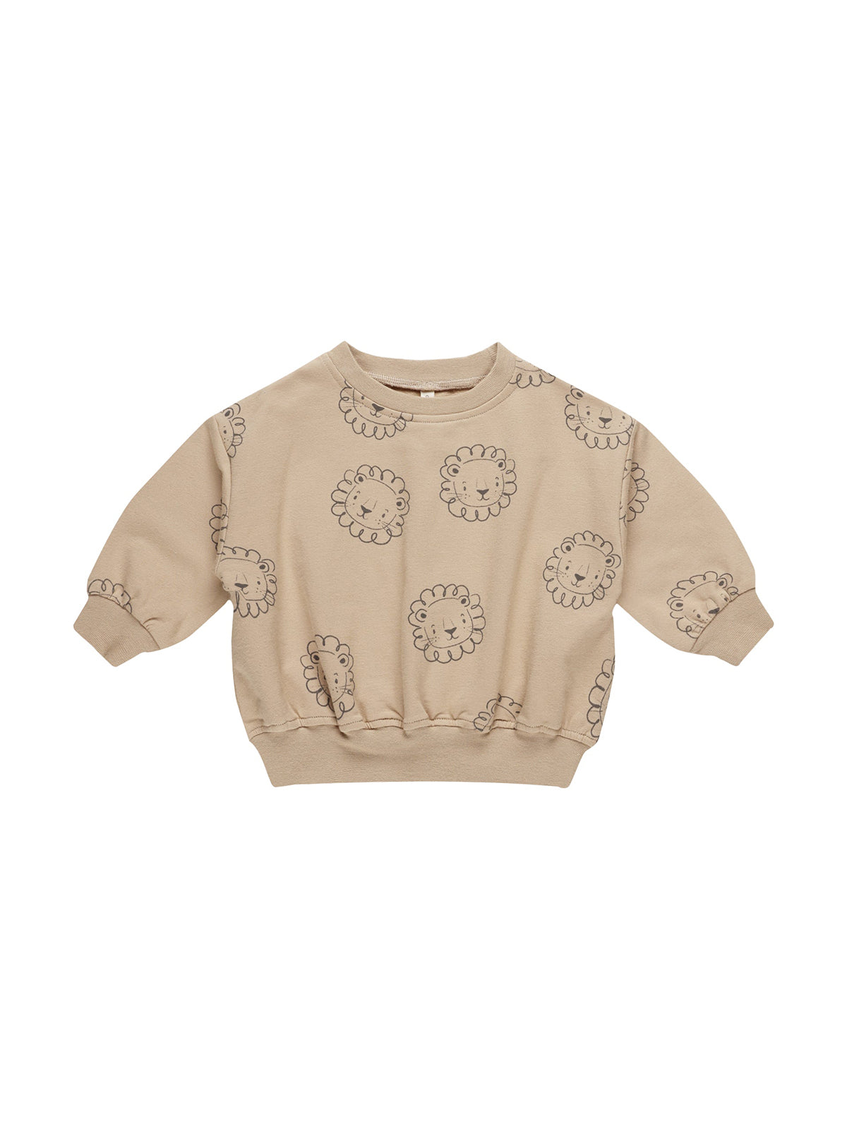 Relaxed fit sweatshirt made of the coziest fleece fabric. This sweatshirt has gathered knit cuffs and bottom opening. Featuring Quincy Mae's 'lions' all-over pattern on latte.
