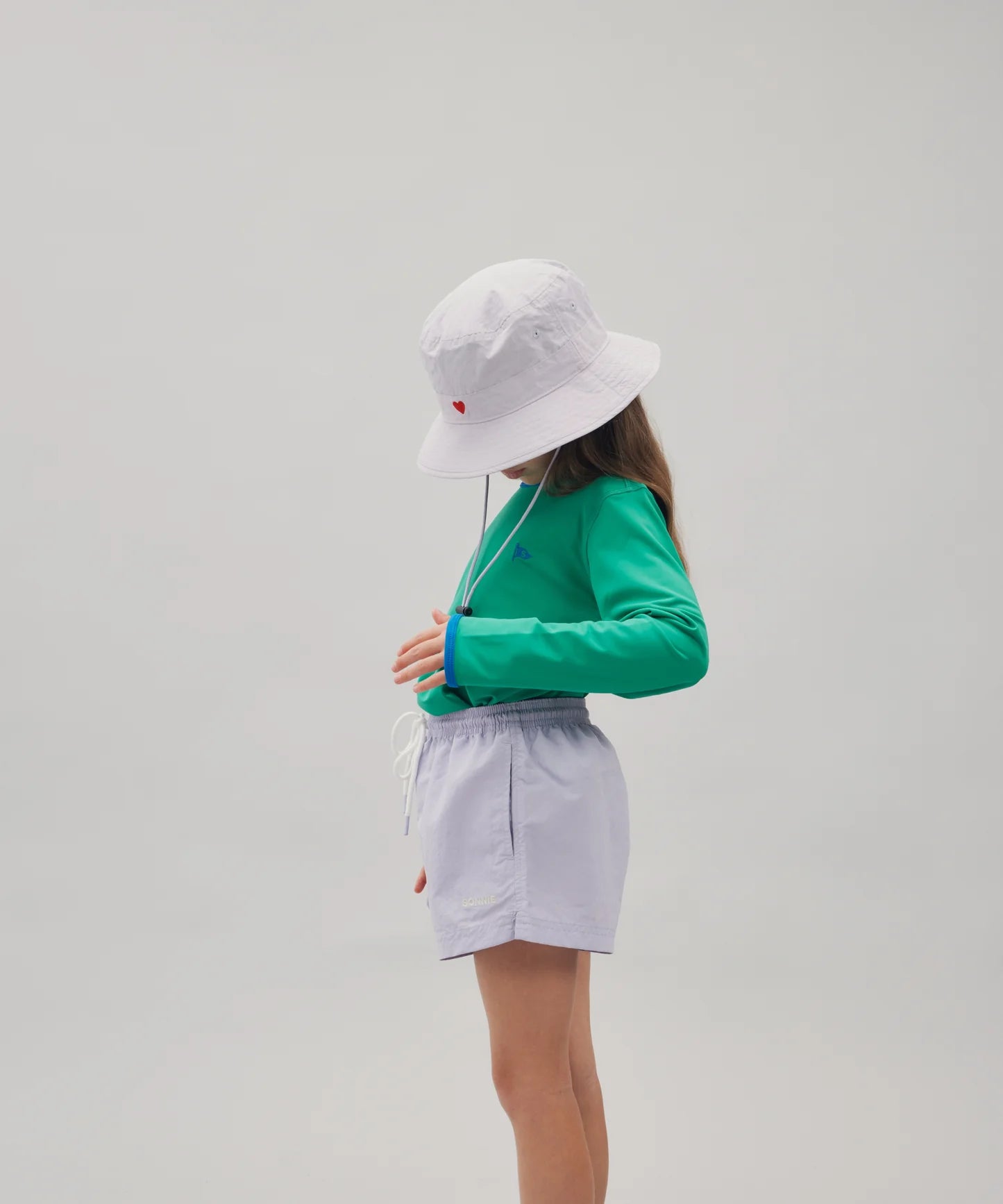 A classic kids' bucket hat in nylon with a heart logo embroidered on the front. Quick drying and with a removable chin string and adjustable toggle.
