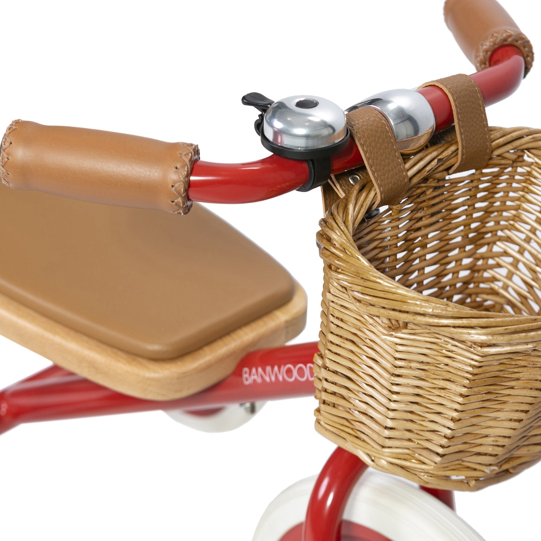 This red tricycle for kids is built out of sturdy materials. The grips are made of vegan leather, easy to wipe off and the pedals and seat are made of oak wood with soft padding for a comfy ride. The little one can bring along their favourite teddy bear or toys in the front wicker basket.