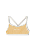 Perfect for beach adventures, this charming bikini bottom combines comfort with timeless style. The soft ribbed fabric features a mini stripe pattern in cheerful marigold, while retro-inspired contrast binding adds character. The fixed crossover straps and square neckline create a flattering fit that moves with your little one. Ideal for making a splash at the pool or seaside this summer.
